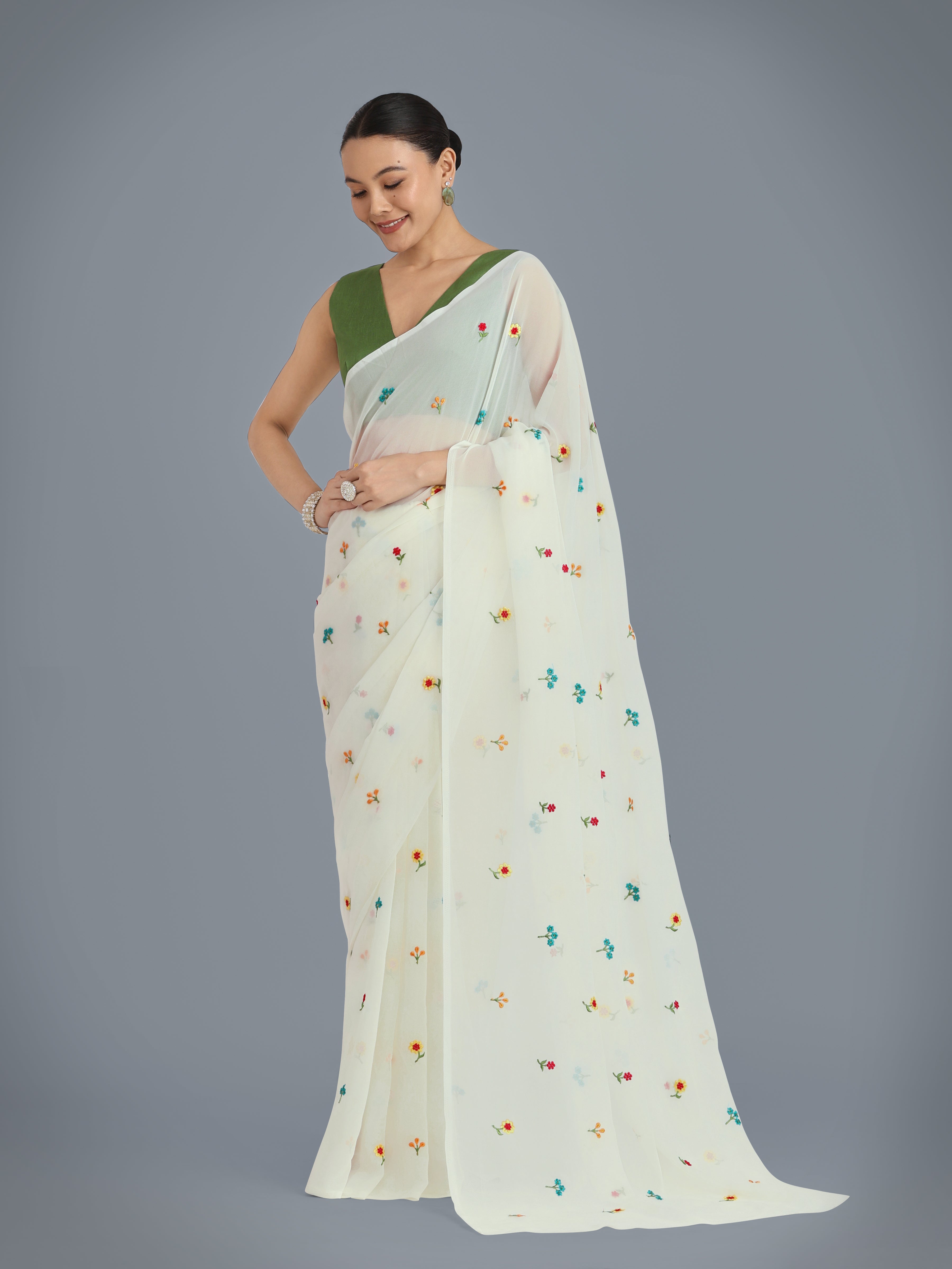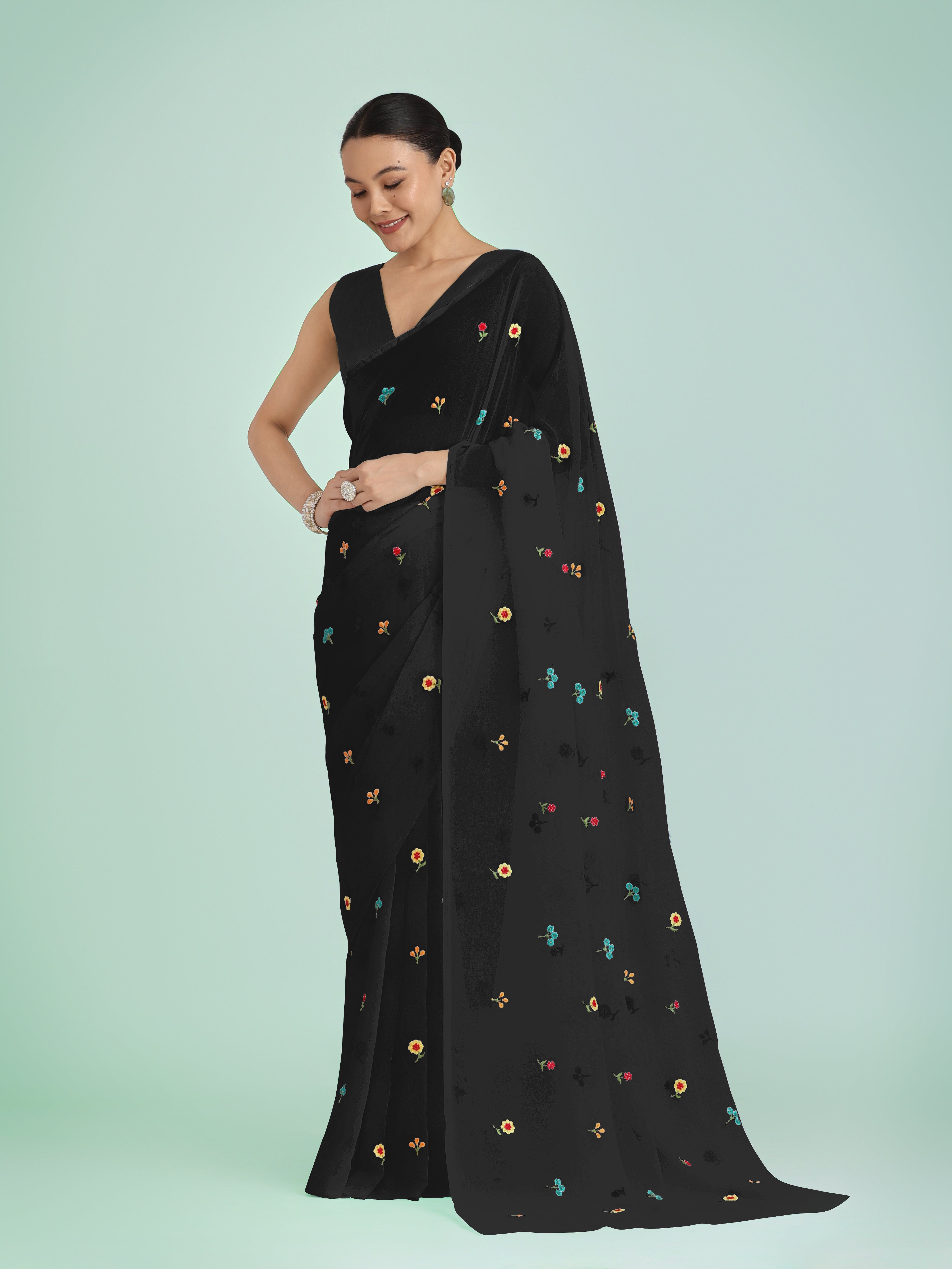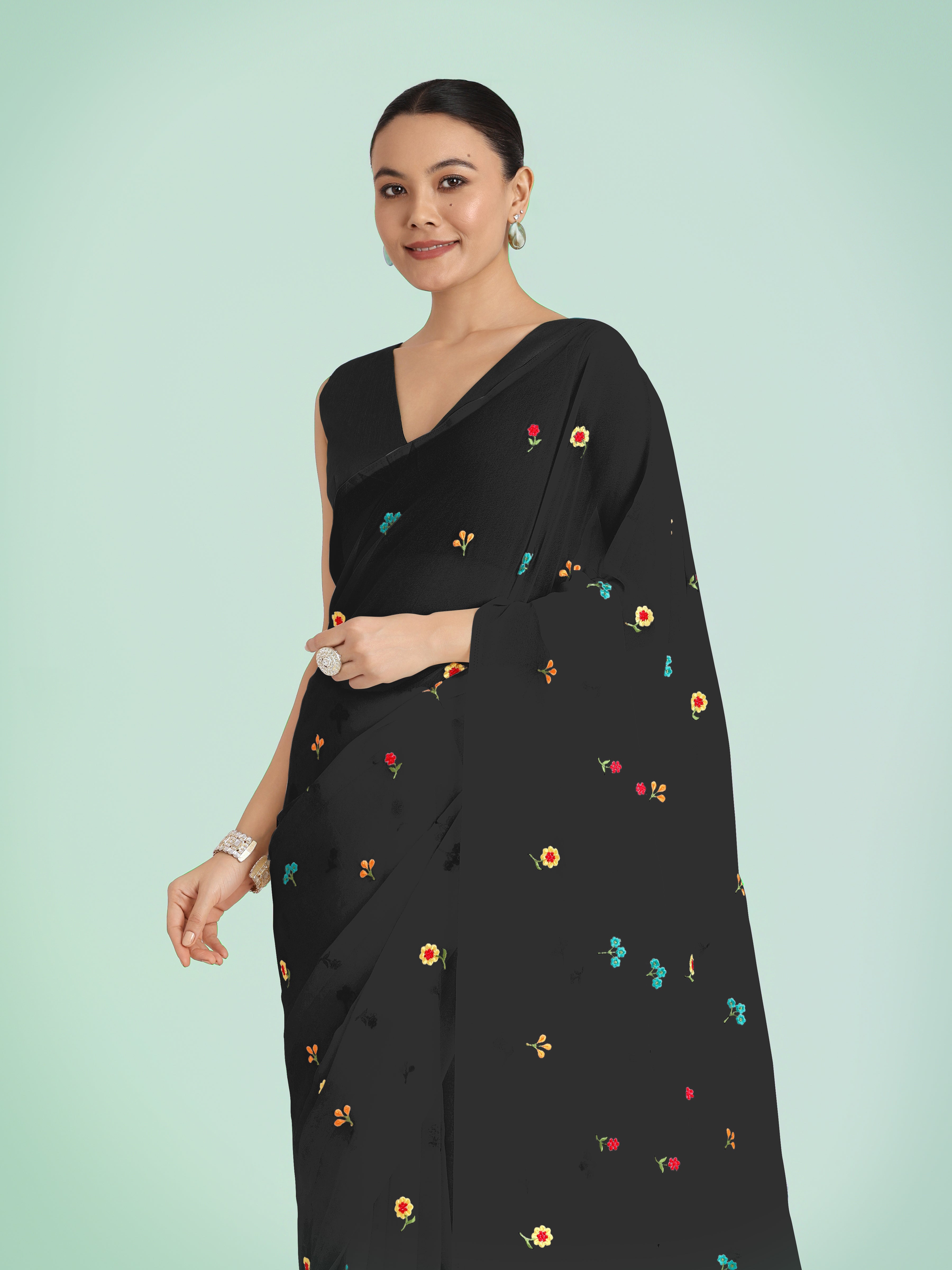 Grab the second look in this elegant attire for this season. Pamper the women in you with this beautiful Georgette classic saree. Beautified with beads and Embroidered work all synchronized nicely with all the design and style and design of the dress. Comes with matching blouse. (Slight variation in color, fabric & work is possible. Model images are only representative.)