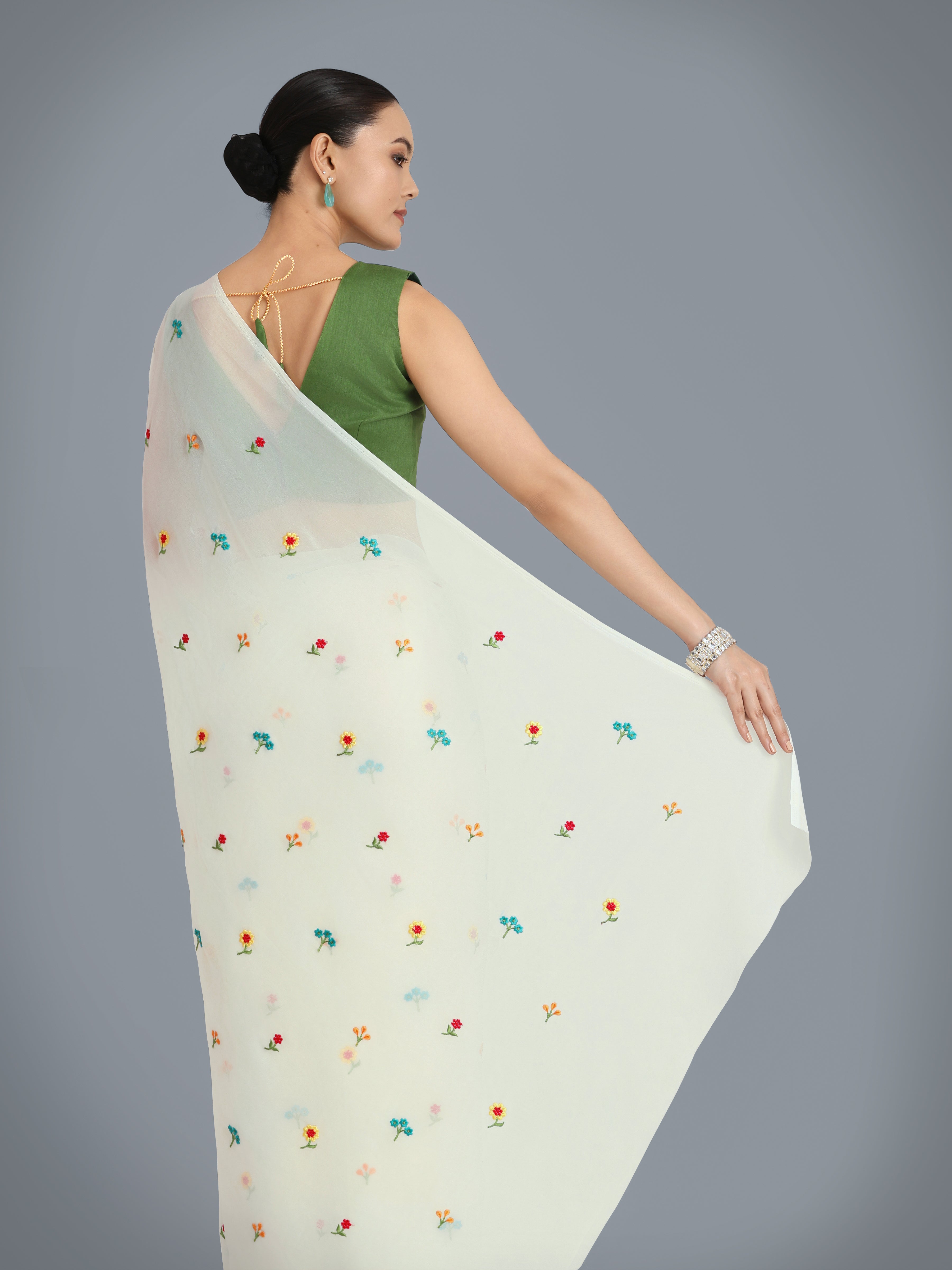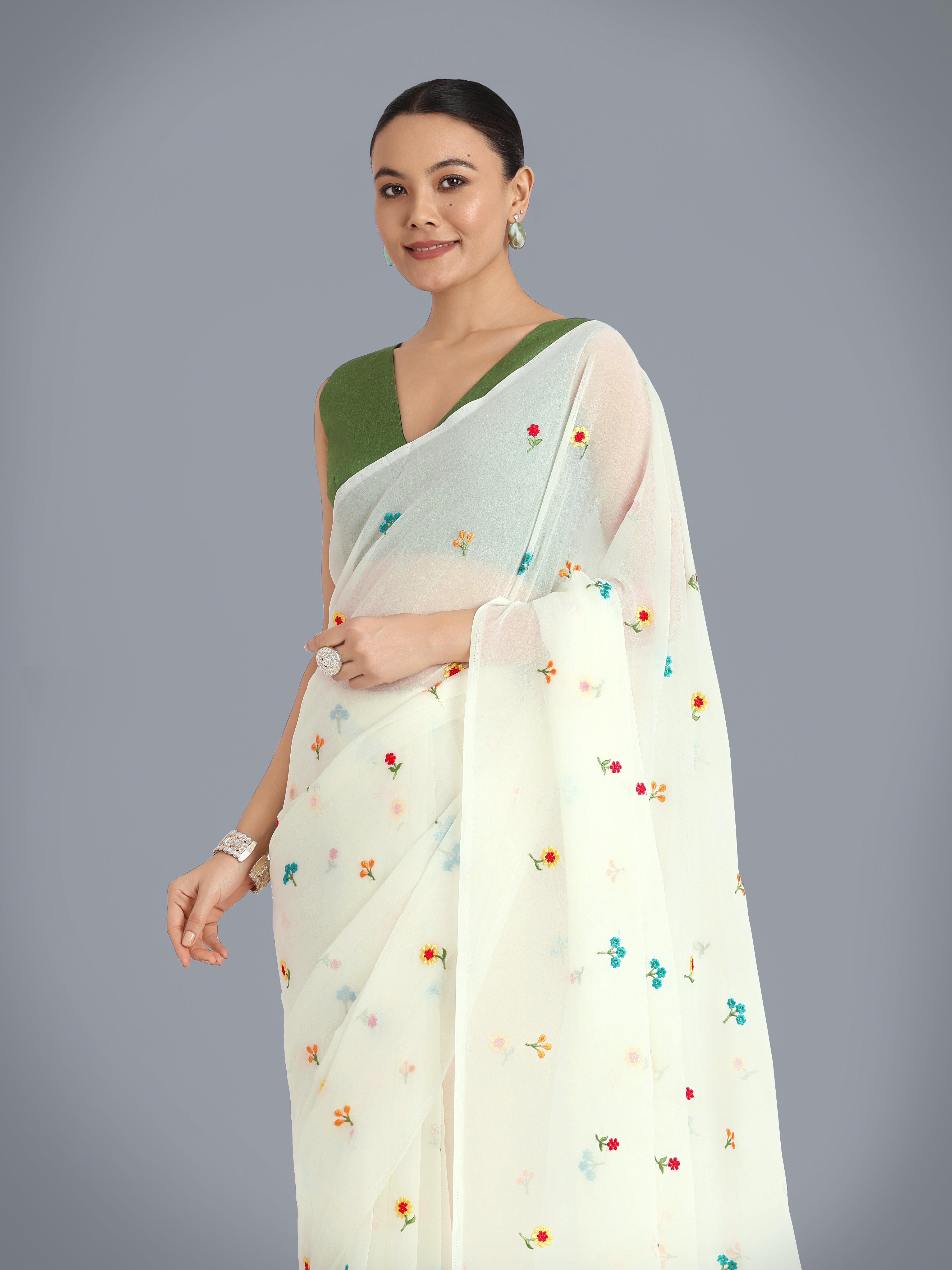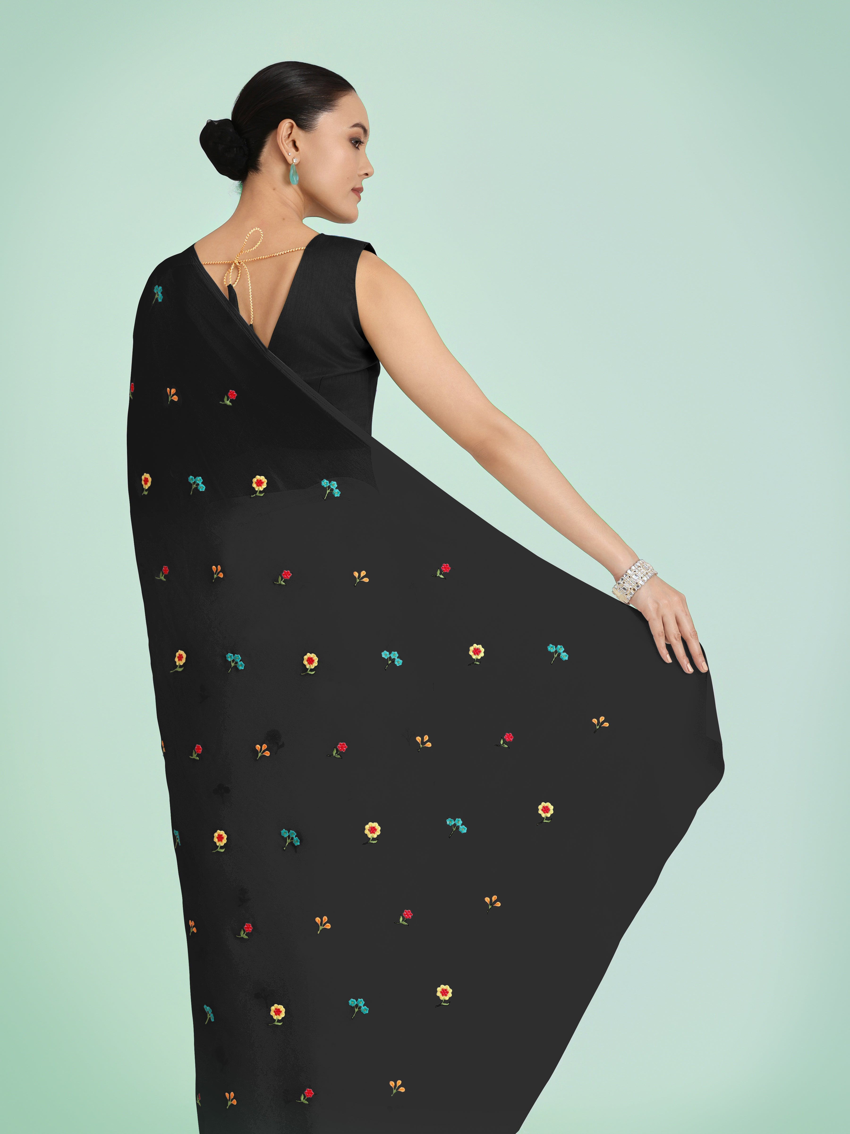 Grab the second look in this elegant attire for this season. Pamper the women in you with this beautiful Georgette classic saree. Beautified with beads and Embroidered work all synchronized nicely with all the design and style and design of the dress. Comes with matching blouse. (Slight variation in color, fabric & work is possible. Model images are only representative.)