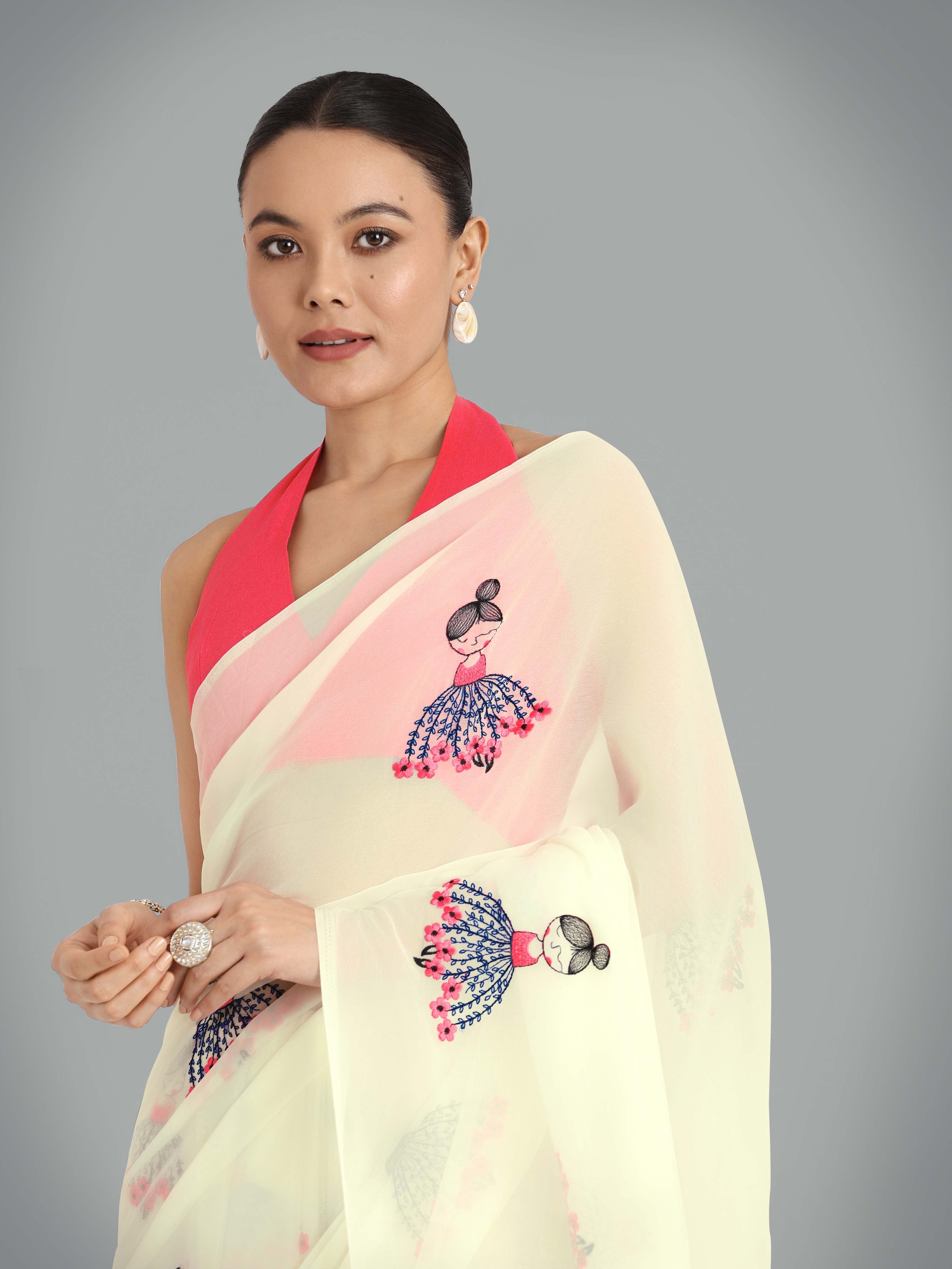 Make the heads turn after you dress up in this lovely Beige colour georgette and imported classic saree. Beautified with embroidered work all synchronized well through the trend and style of the attire. Comes with matching Art silk blouse. (Slight variation in color, fabric & work is possible. Model images are only representative.)