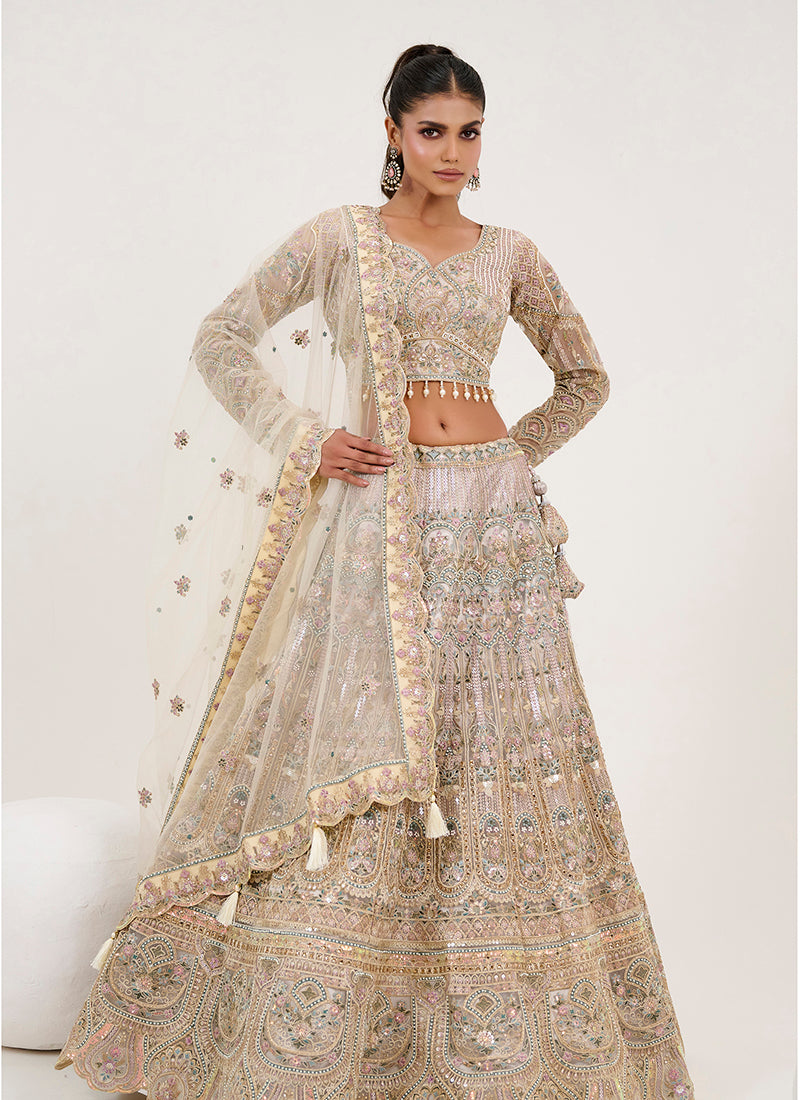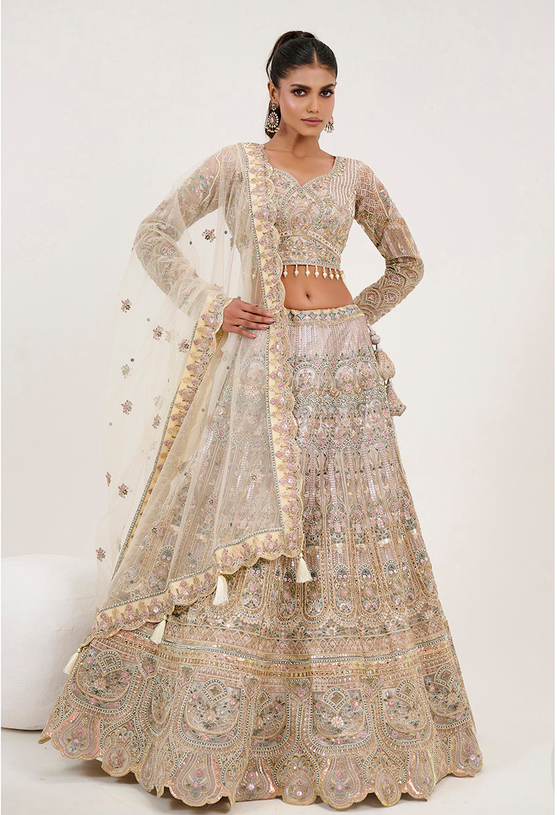 Design and style and pattern would be on the peak of your beauty as soon as you dresses this off white net readymade lehenga choli. The ethnic embroidered, stone, thread and zari work at the attire adds a sign of elegance statement with a look. Comes with matching choli and dupatta. (Slight variation in color, fabric & work is possible. Model images are only representative.)