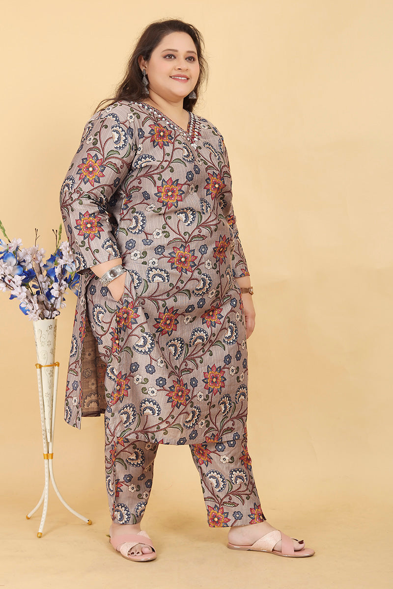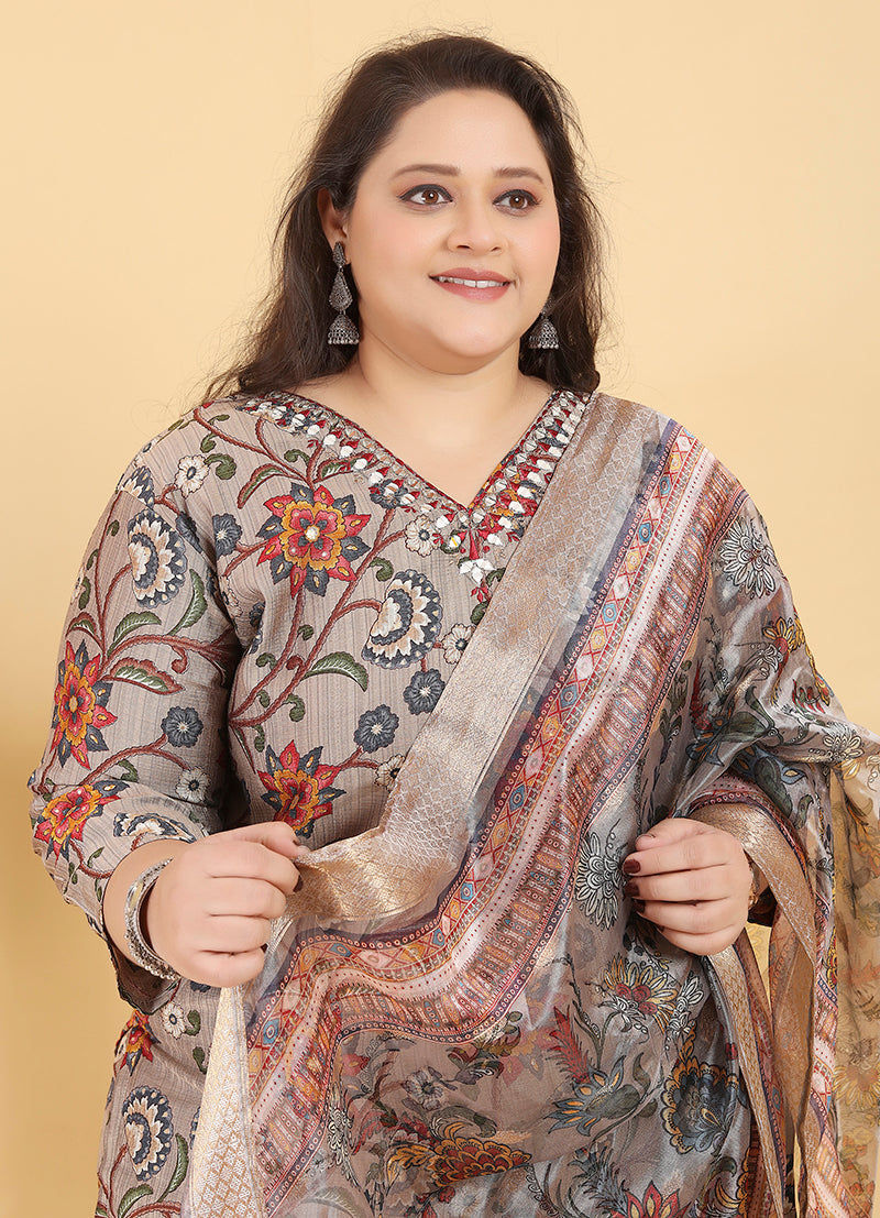 Keep ahead in trend with this Beige colour Premium Rayon Handwork pant style suit. Beautified with floral print work all synchronized very well with the trend and style and design of the attire. Comes with matching bottom and dupatta.