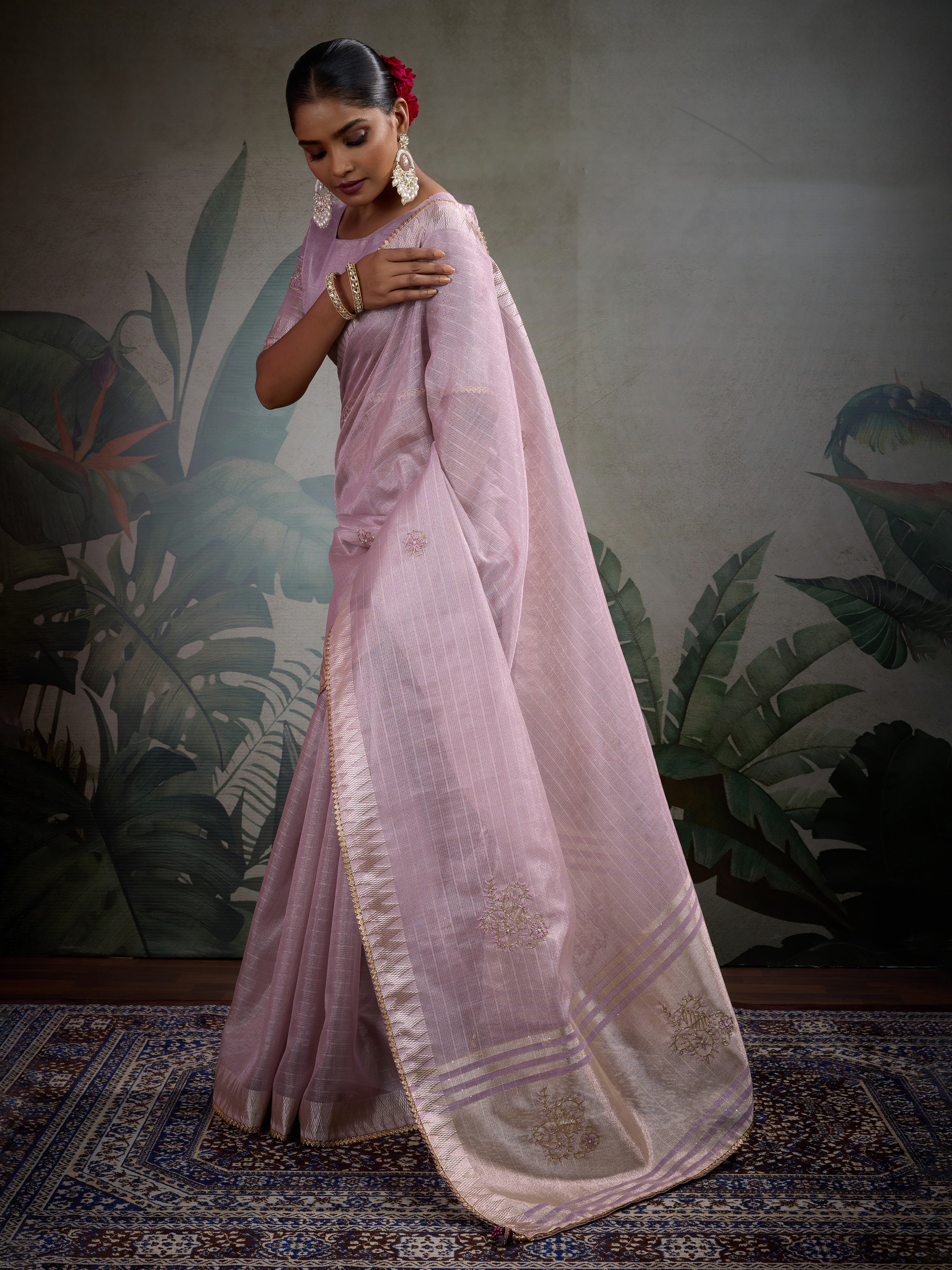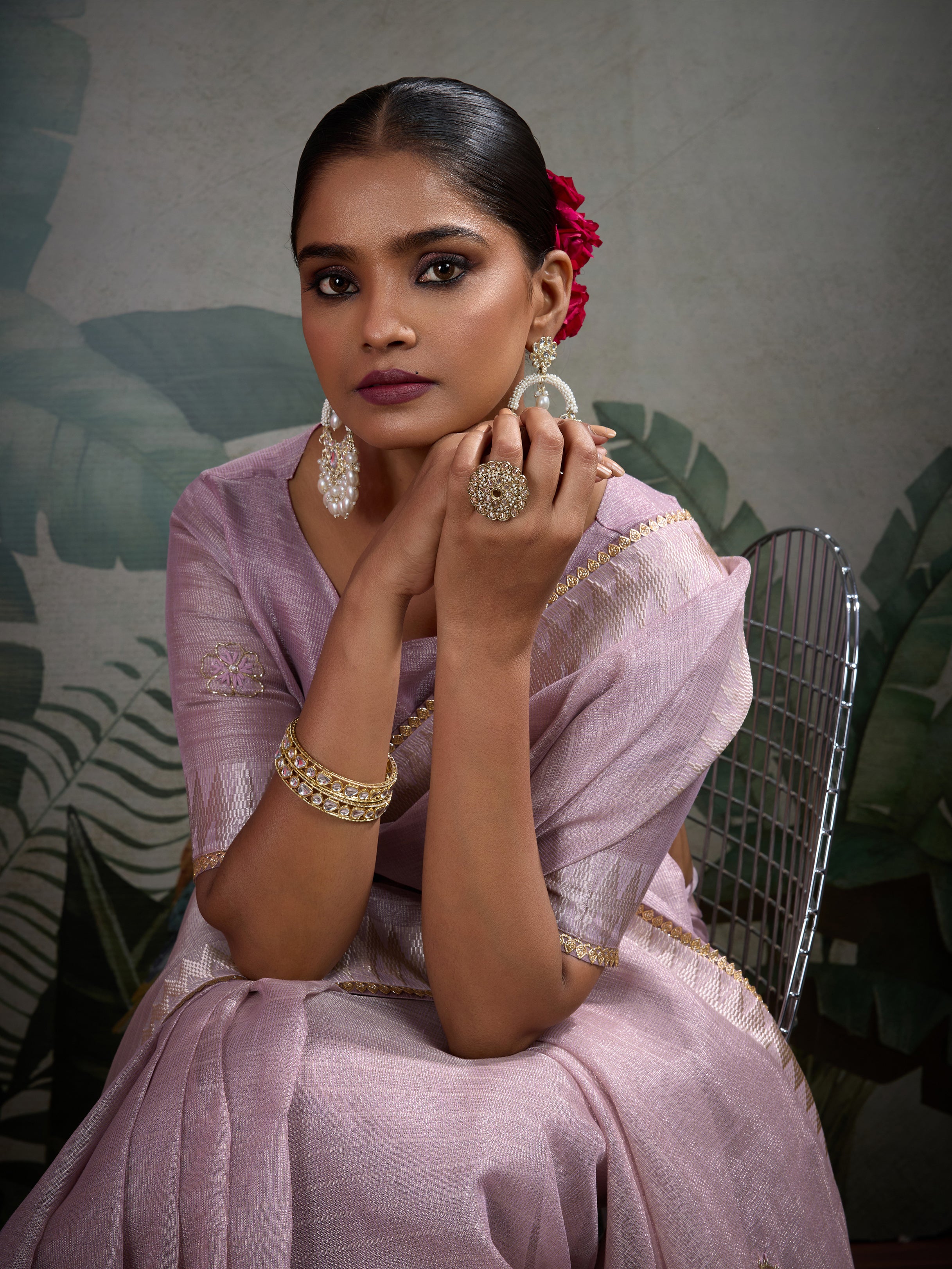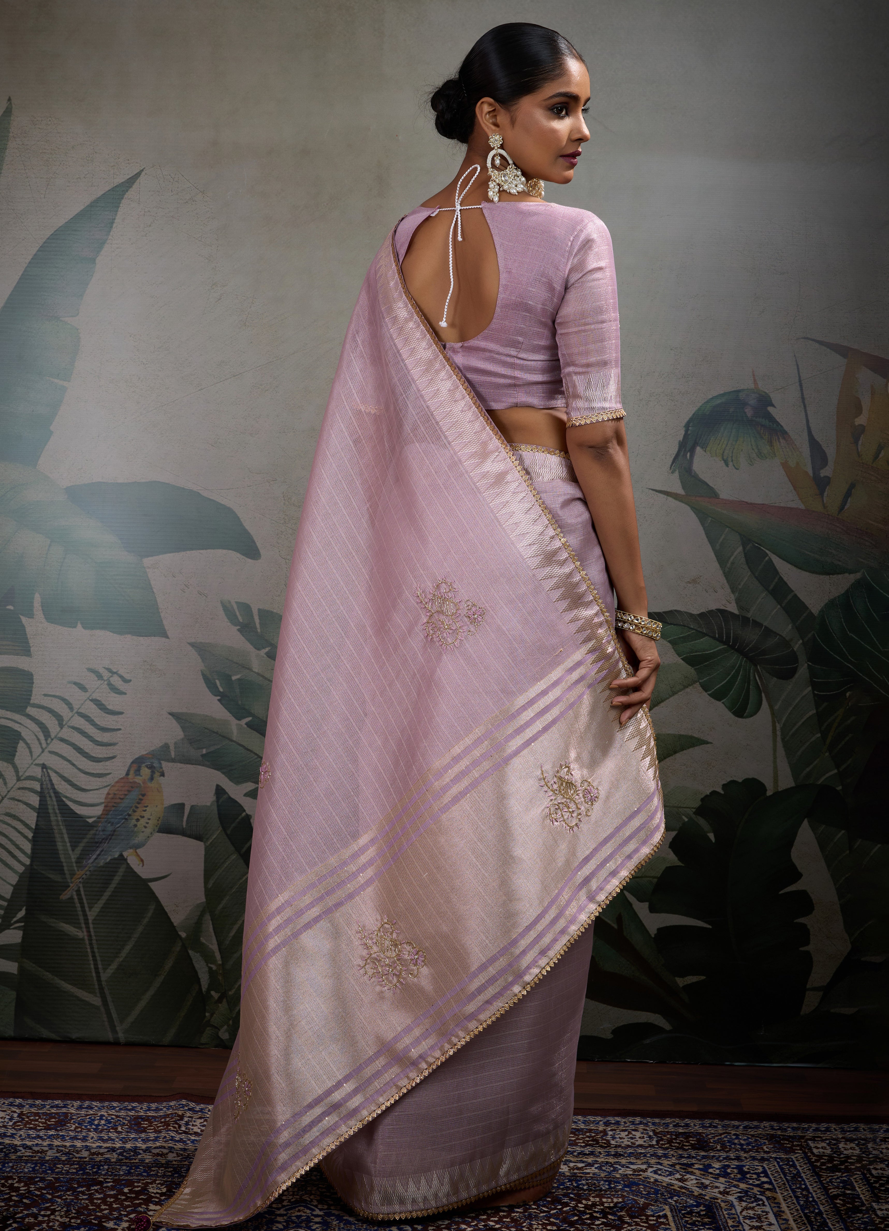Make the heads turn whenever you costume up in such a stunning Lilac Linen Tissue traditional saree.. The border and khatli hand work butta seems chic and great for any party. Comes with matching blouse. (Slight variation in color, fabric & work is possible. Model images are only representative.)