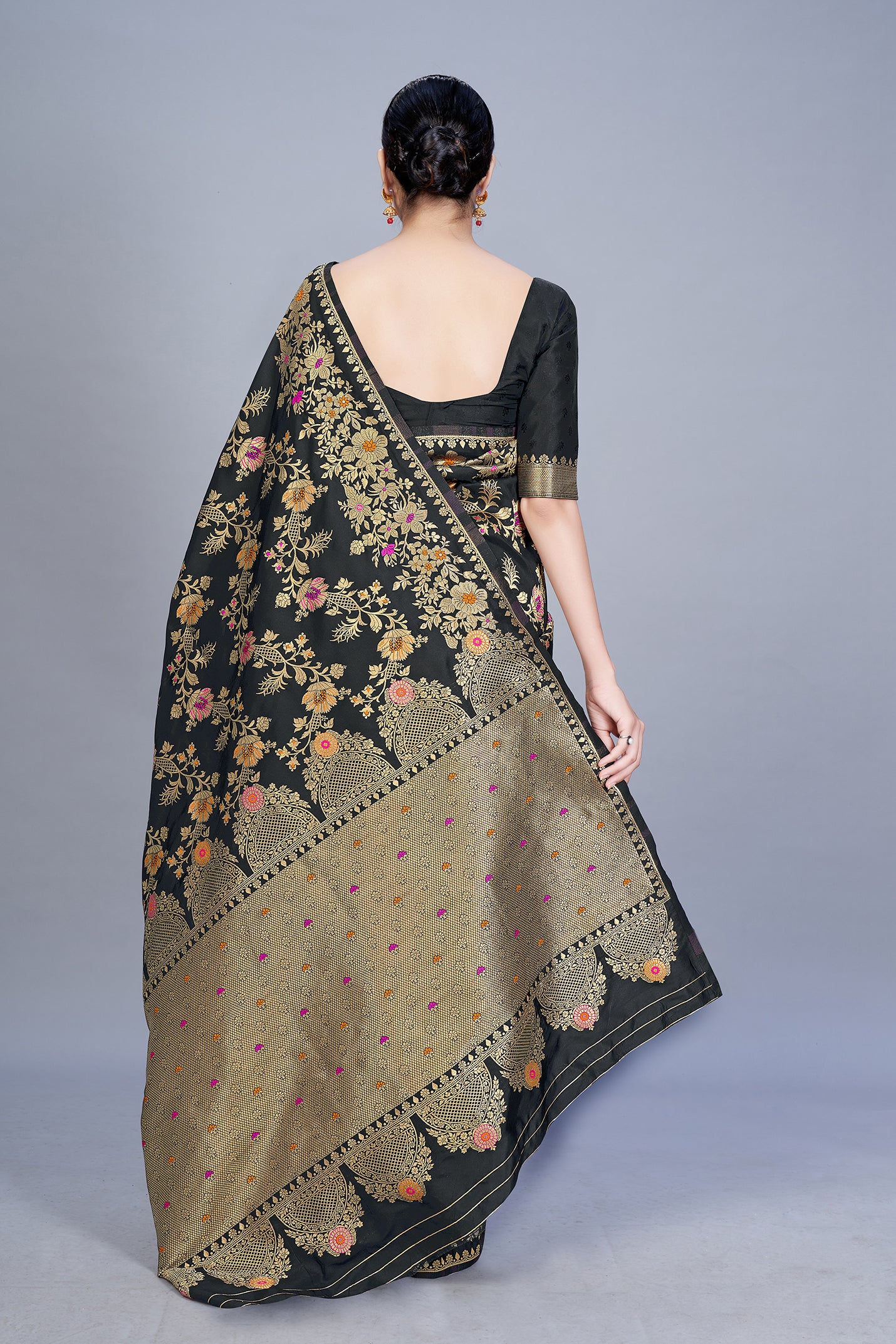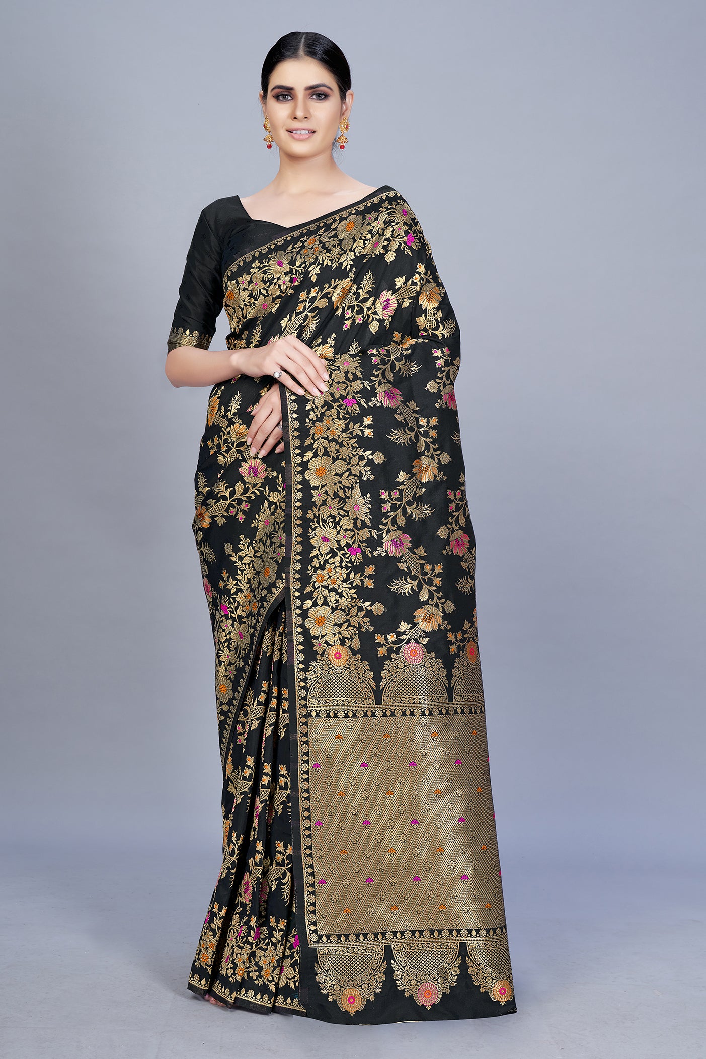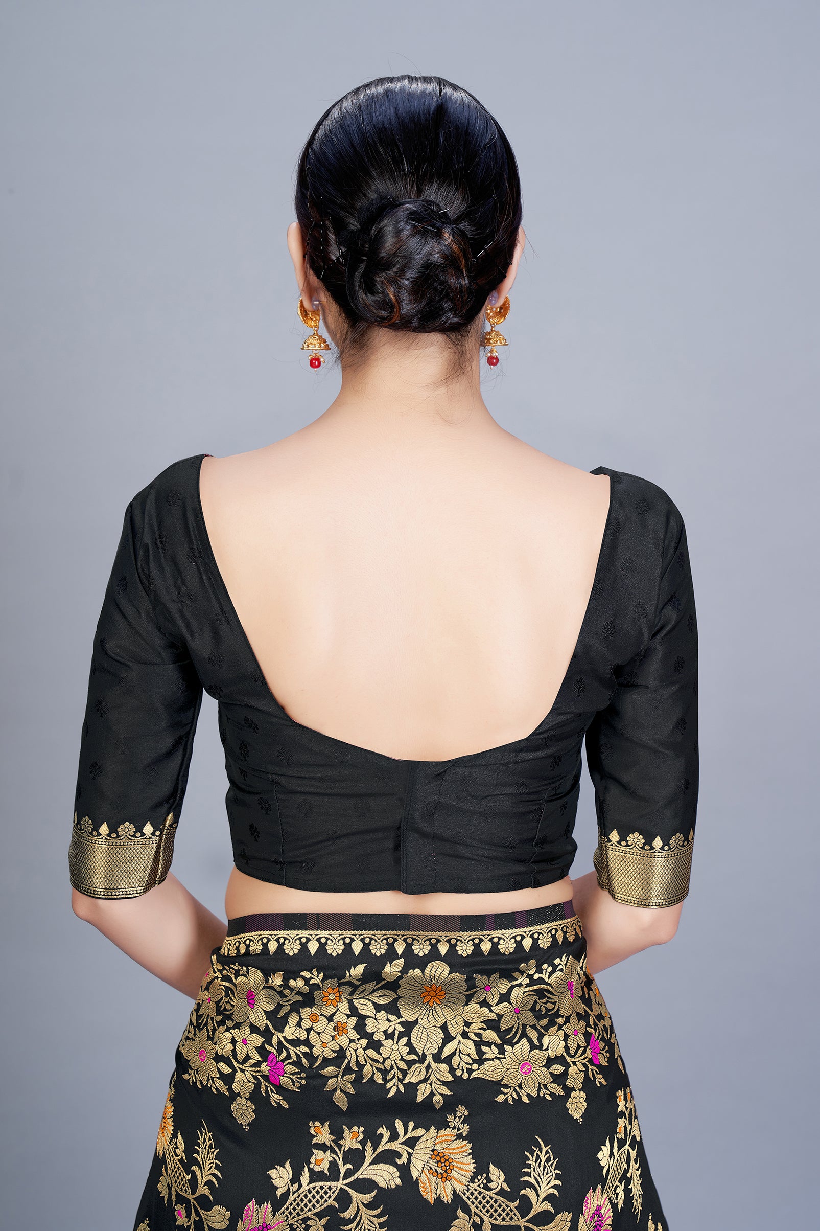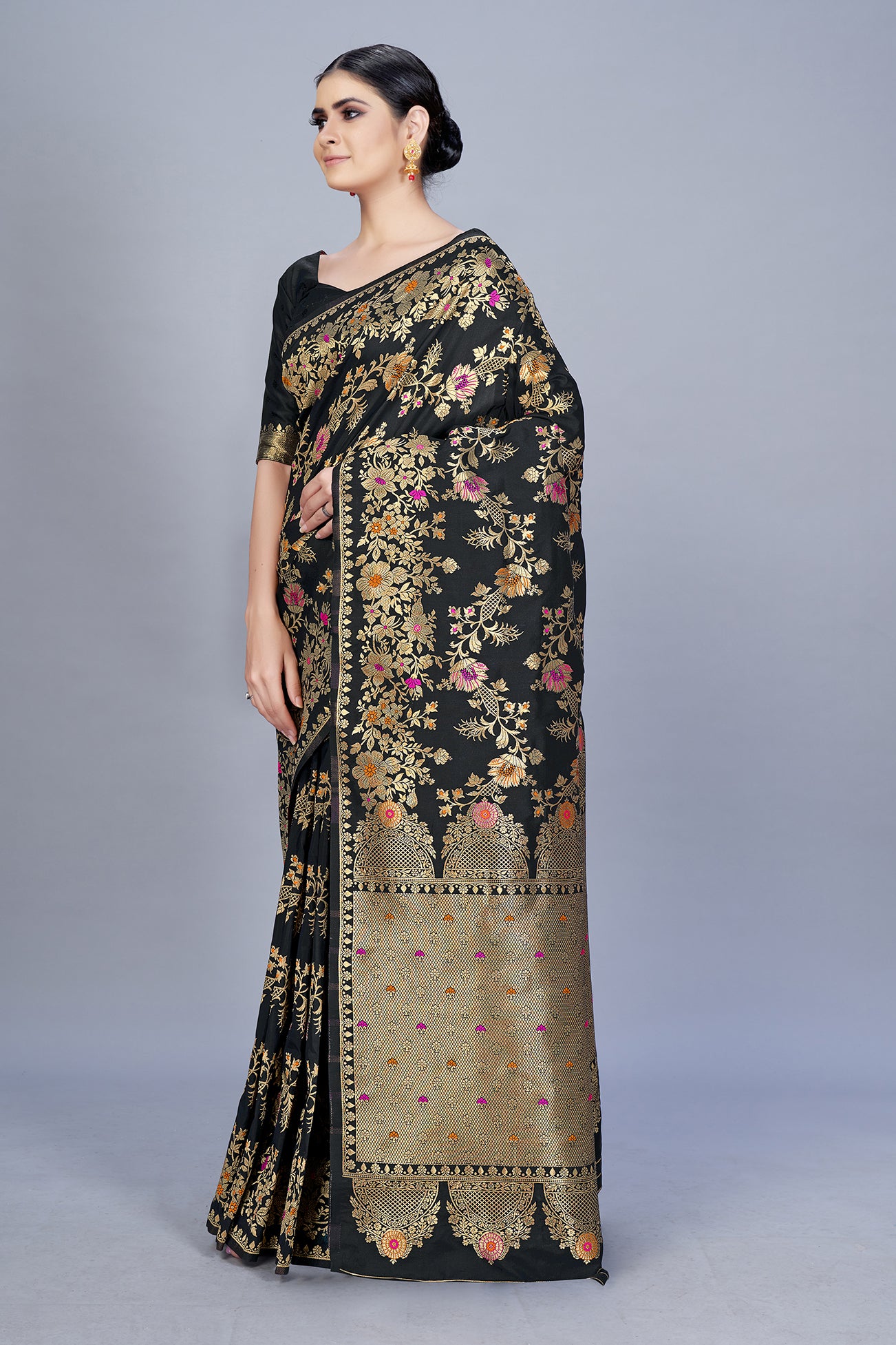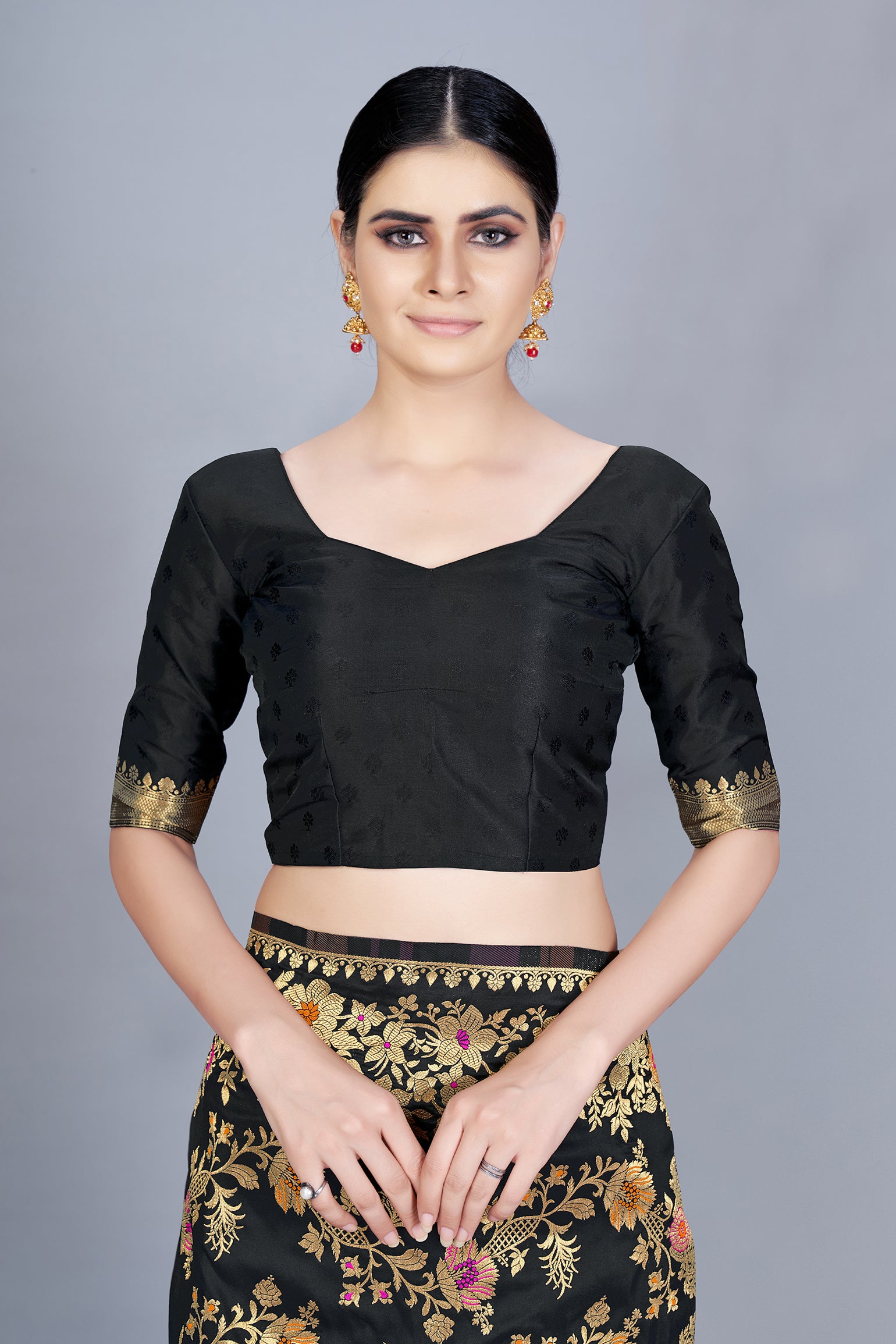 This brilliant array will make you the ultimate classic beauty at the next event you attend. Create a smoldering impact by this Black silk trendy saree. This ravishing attire is amazingly zari with weaving work. Comes with matching blouse. (Slight variation in color, fabric & work is possible. Model images are only representative.)