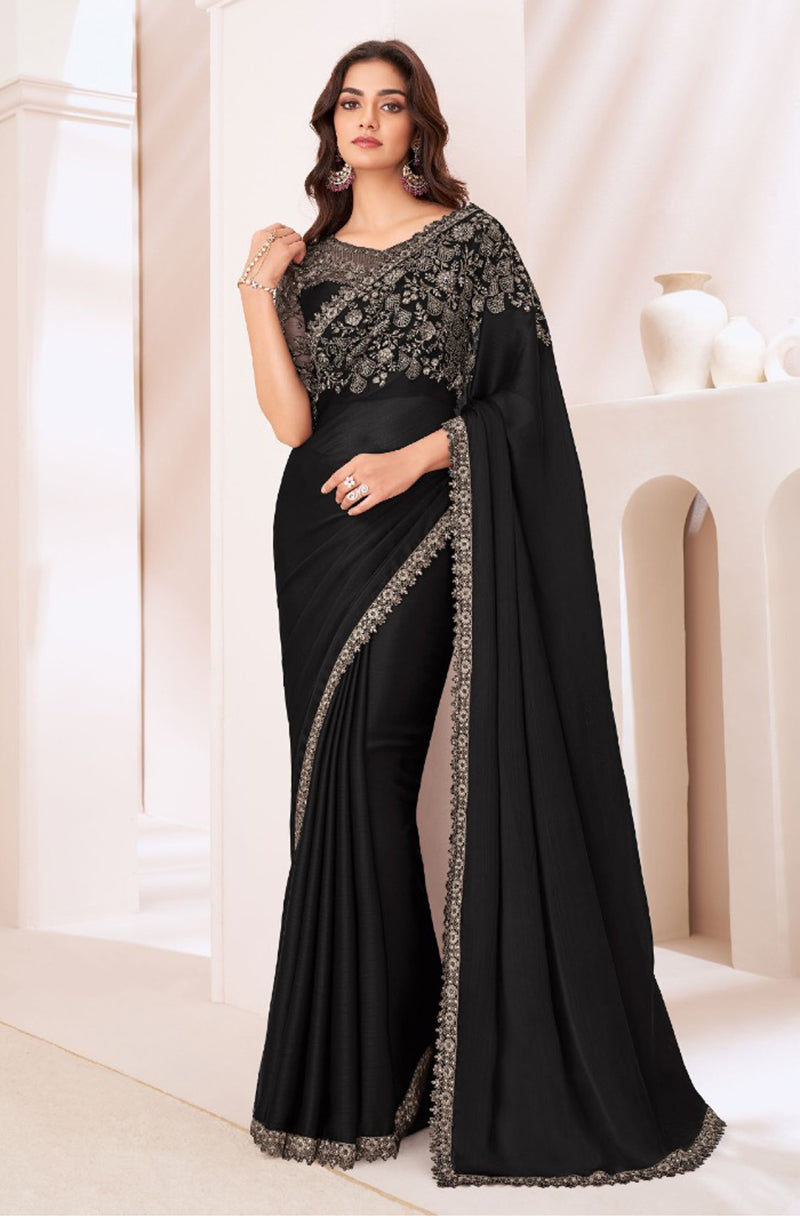 Sensible colors and excellent designs and romantic moods are reflected with an alluring style. We unfurl our the intricacy and exclusivity of our creations highlighted in this lovely black chiffon satin designer saree. This ravishing attire is amazingly embroidered with border and lace work. Comes with matching blouse. (Slight variation in color, fabric & work is possible. Model images are only representative.)