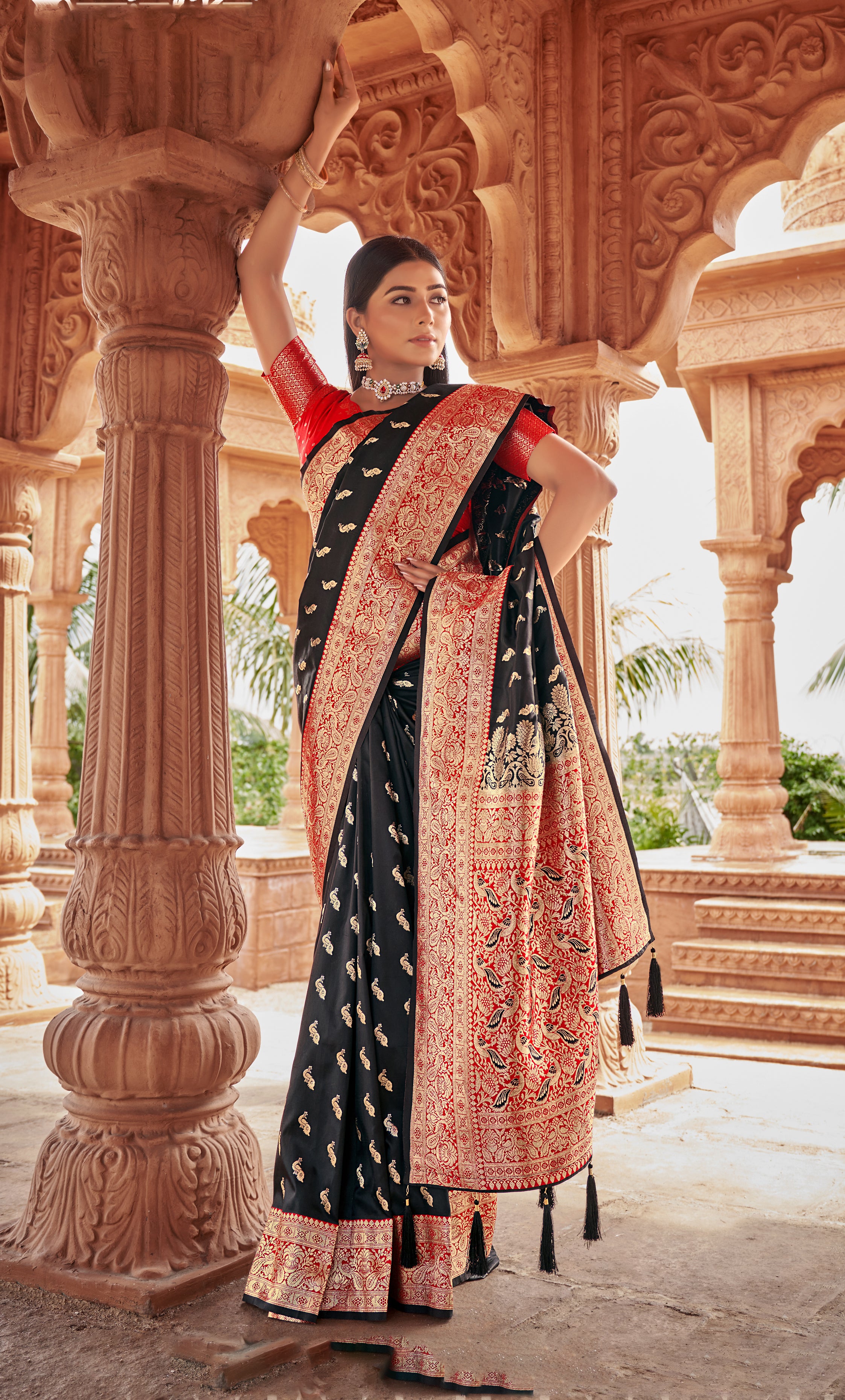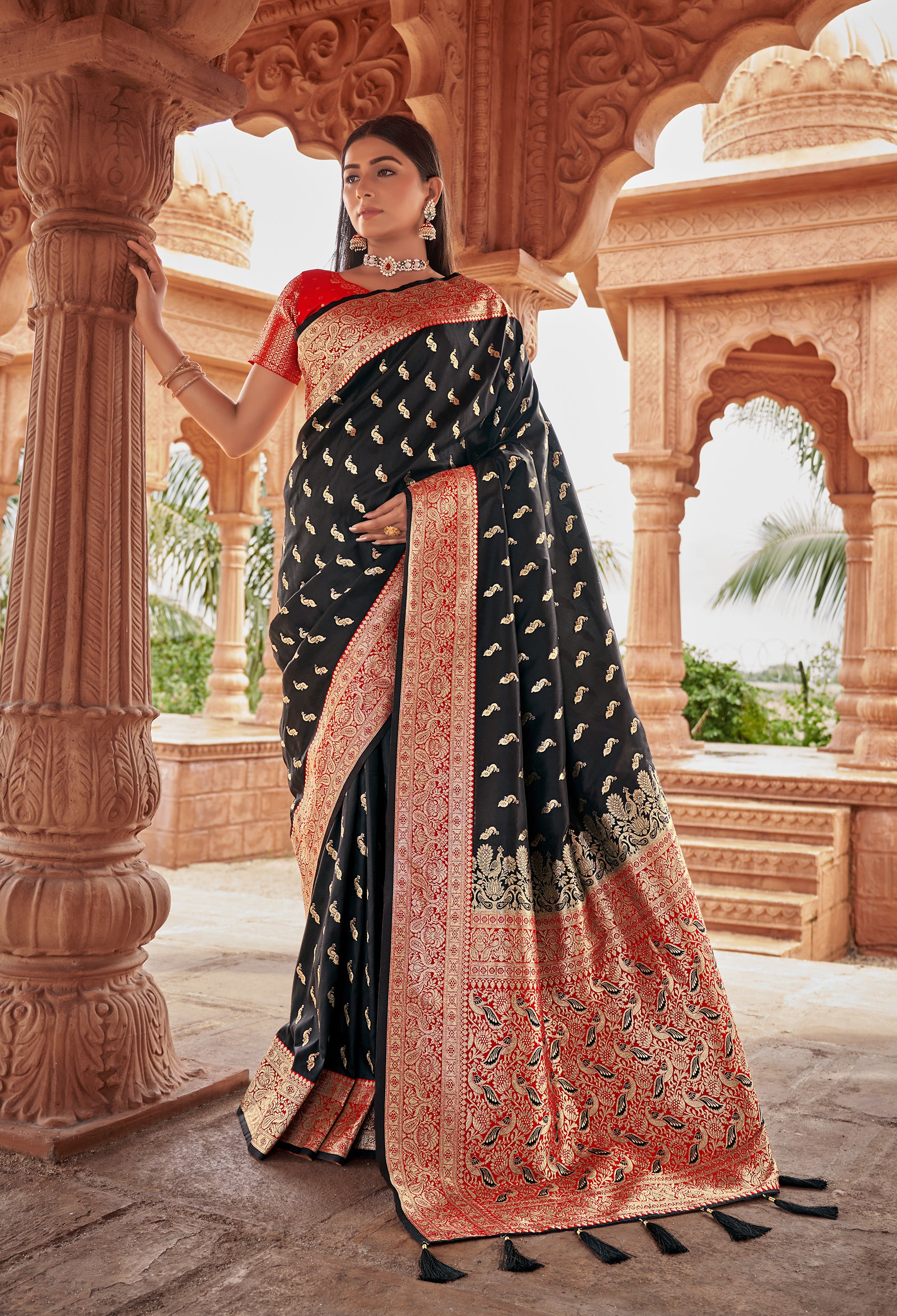 Style and pattern would be on the peak of your elegance after you dresses this Black color Banarasi Silk designer saree. The stunning weaving work in the course of the attire is awe inspiring. Comes with matching blouse. (Slight variation in color, fabric & work is possible. Model images are only representative.)