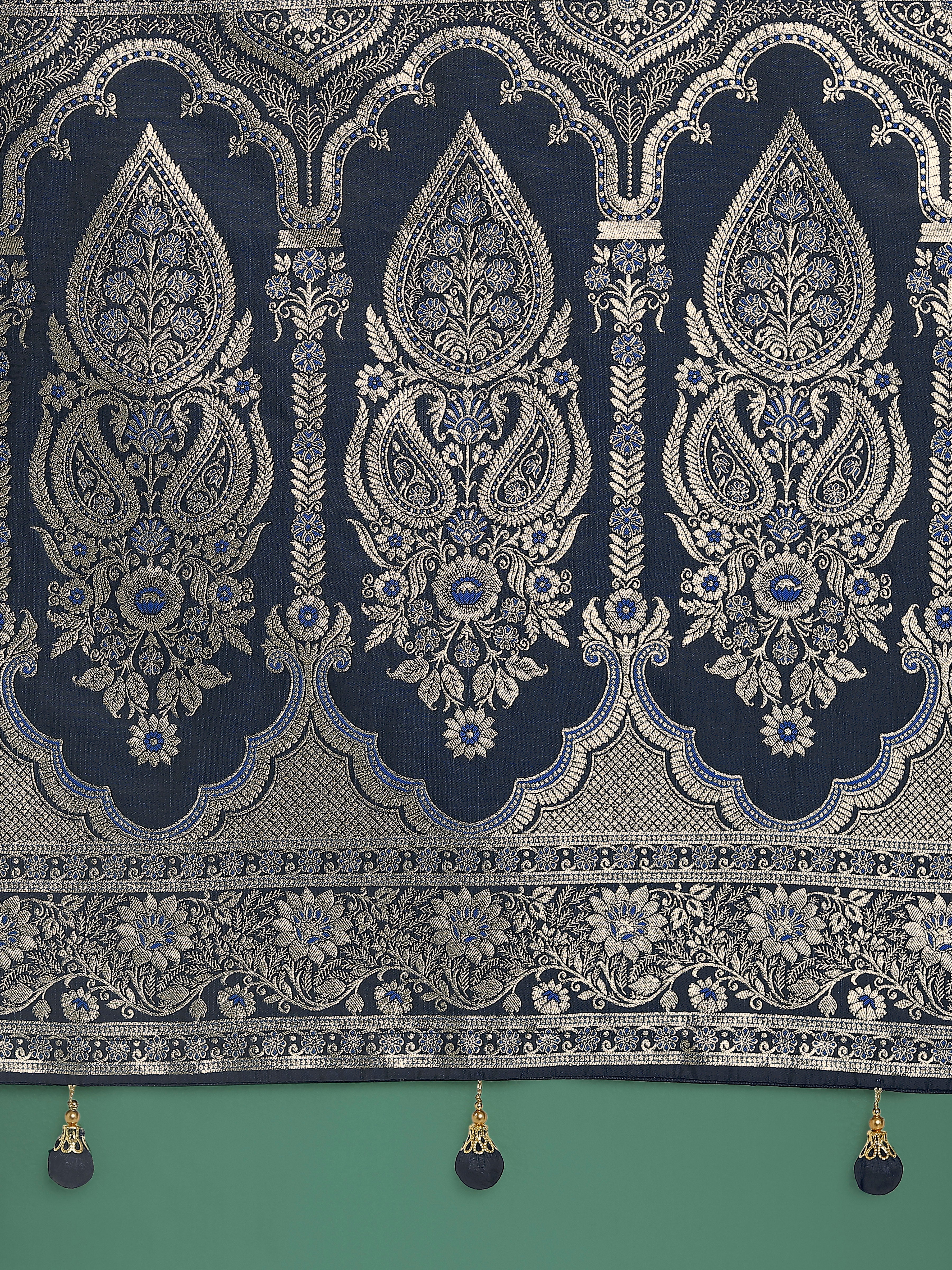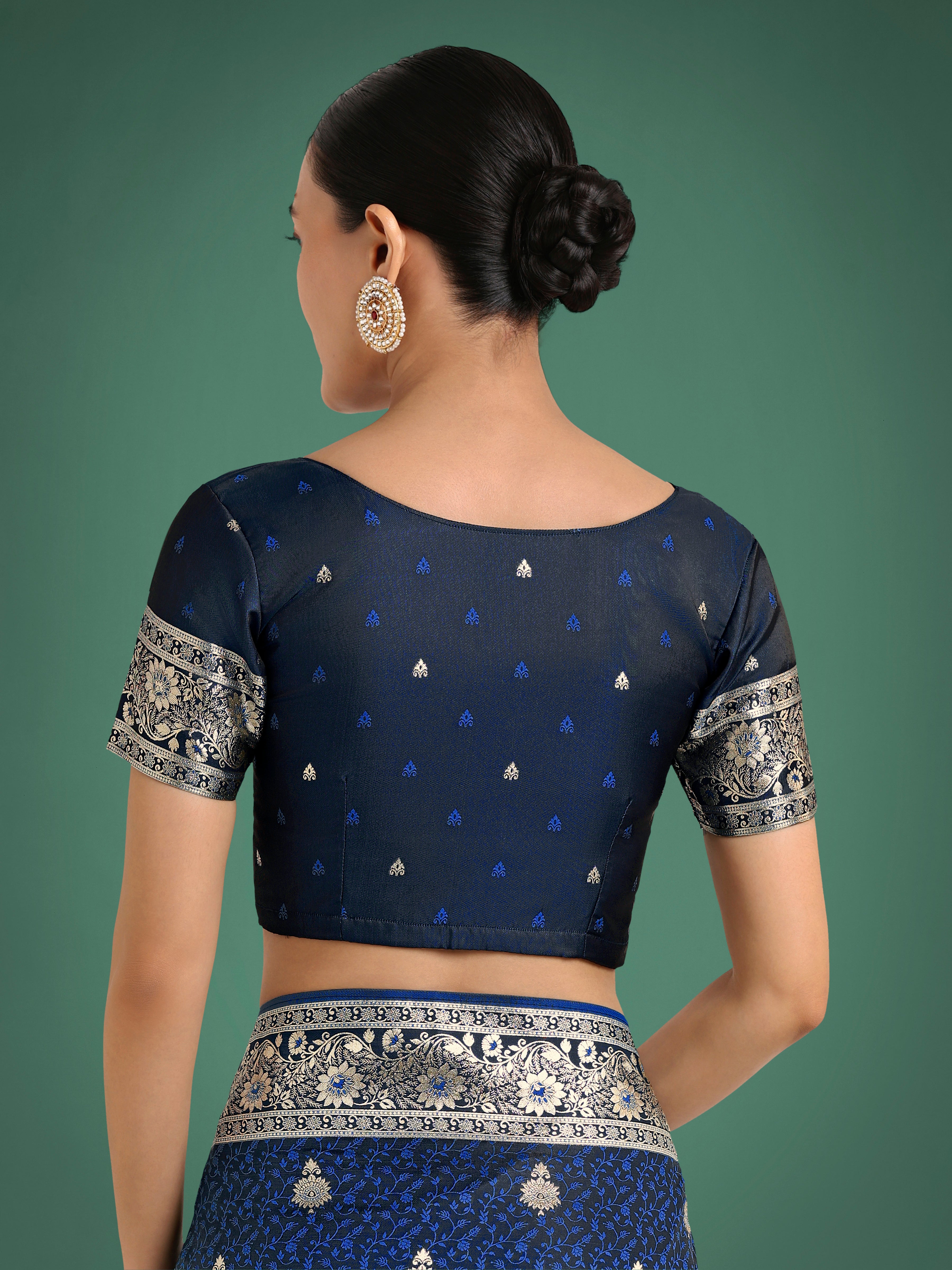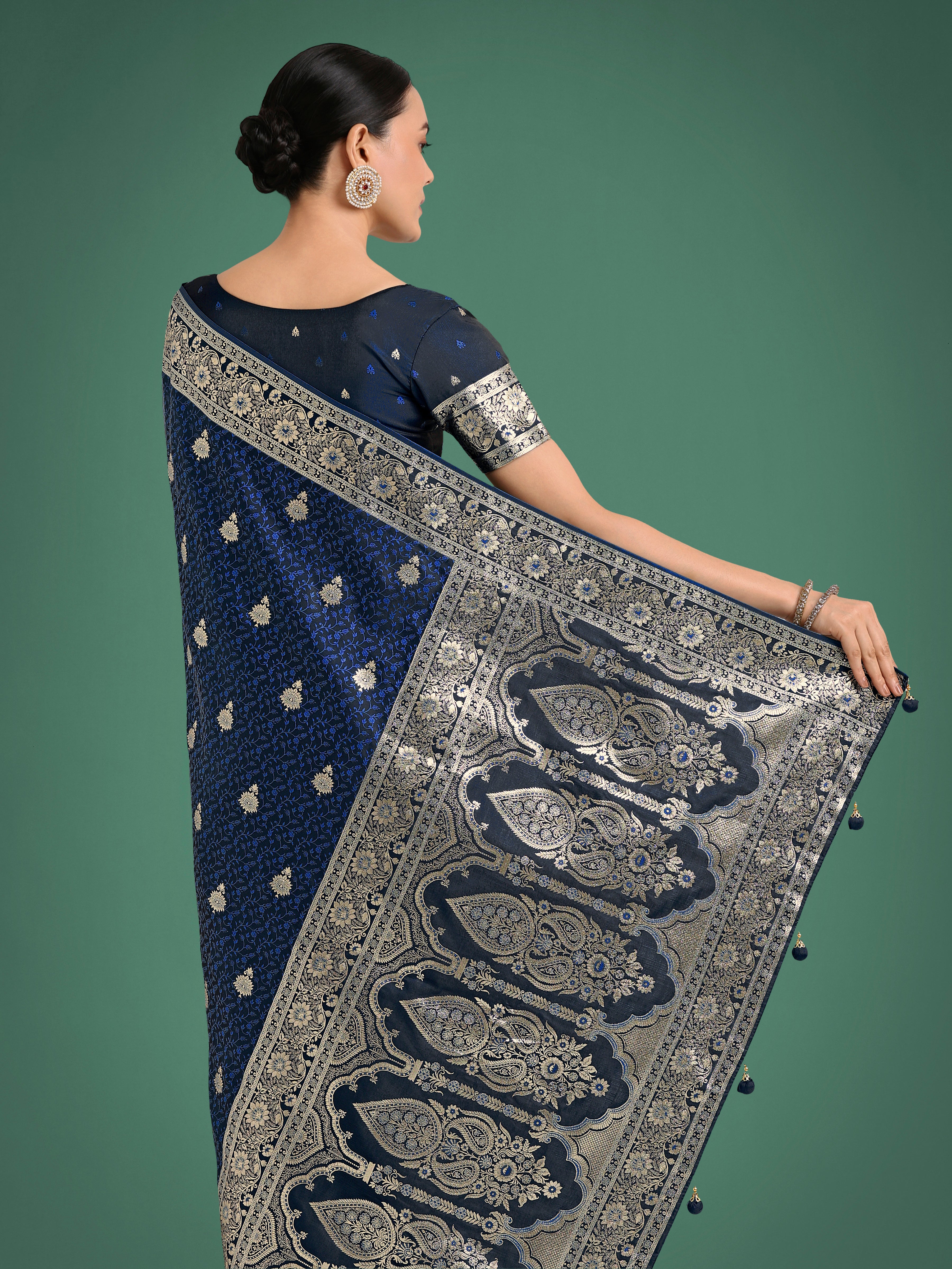 You will be bound to make a powerful style statement with this blue banarasi satin silk trendy saree. The ethnic border, fancy, woven work and zari work for the attire adds a sign of beauty statement to your look. Comes with matching blouse. (Slight variation in color, fabric & work is possible. Model images are only representative.)