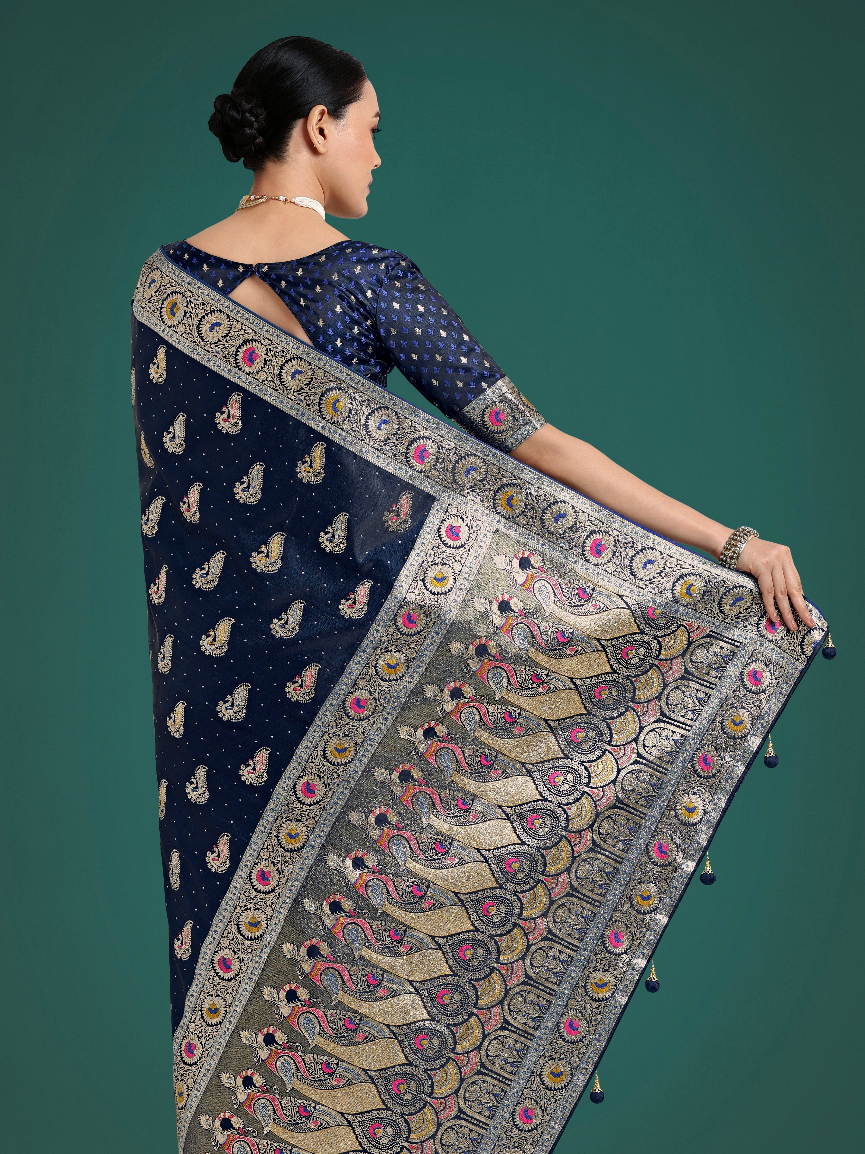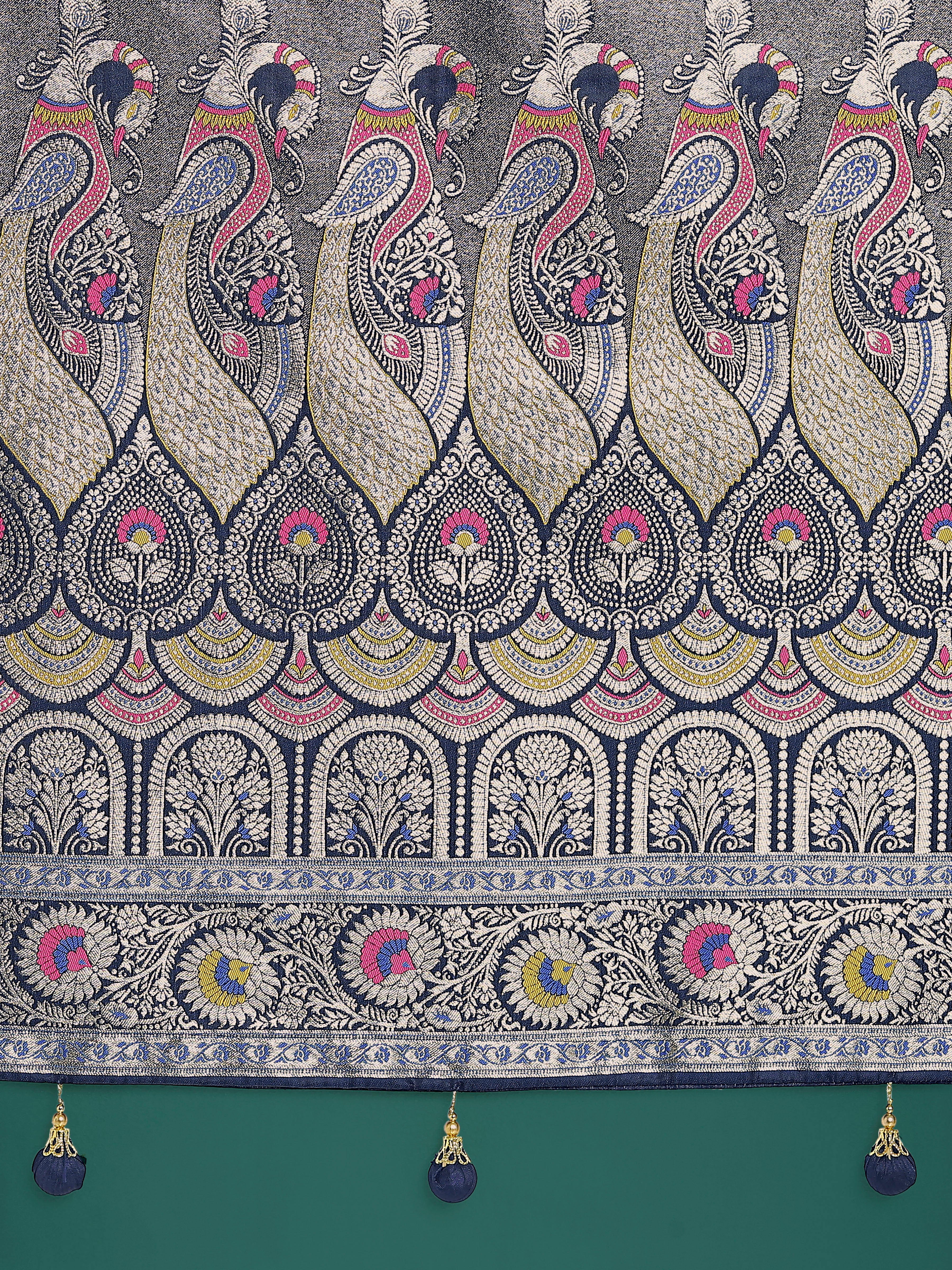 This brilliant array will make you the ultimate classic beauty at the next event you attend. We unfurl our the intricacy and exclusivity of our creations highlighted in this style of a appealing Blue banarasi satin silk and modal traditional saree. The amazing dress creates a dramatic canvas with wonderful Zari weaving work. Comes with matching blouse. (Slight variation in color, fabric & work is possible. Model images are only representative.)