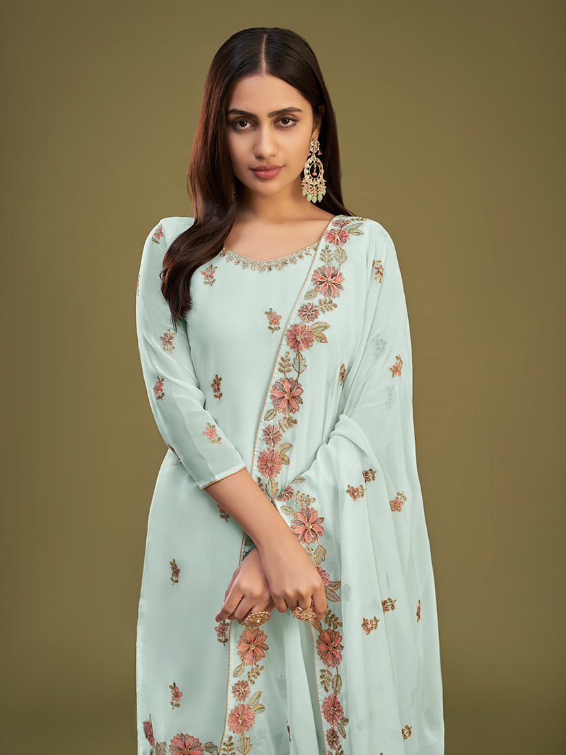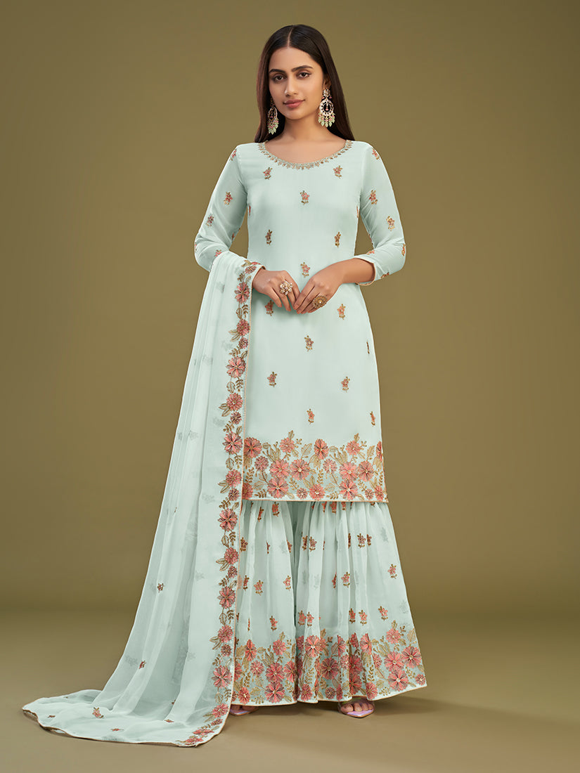 Precise splendor comes out as a result of the dressing style and design with this light blue georgette sharara salwar kameez. You will see some intriguing patterns completed with embroidered, resham and sequins work. Comes with matching bottom and dupatta. (Slight variation in color, fabric & work is possible. Model images are only representative.)