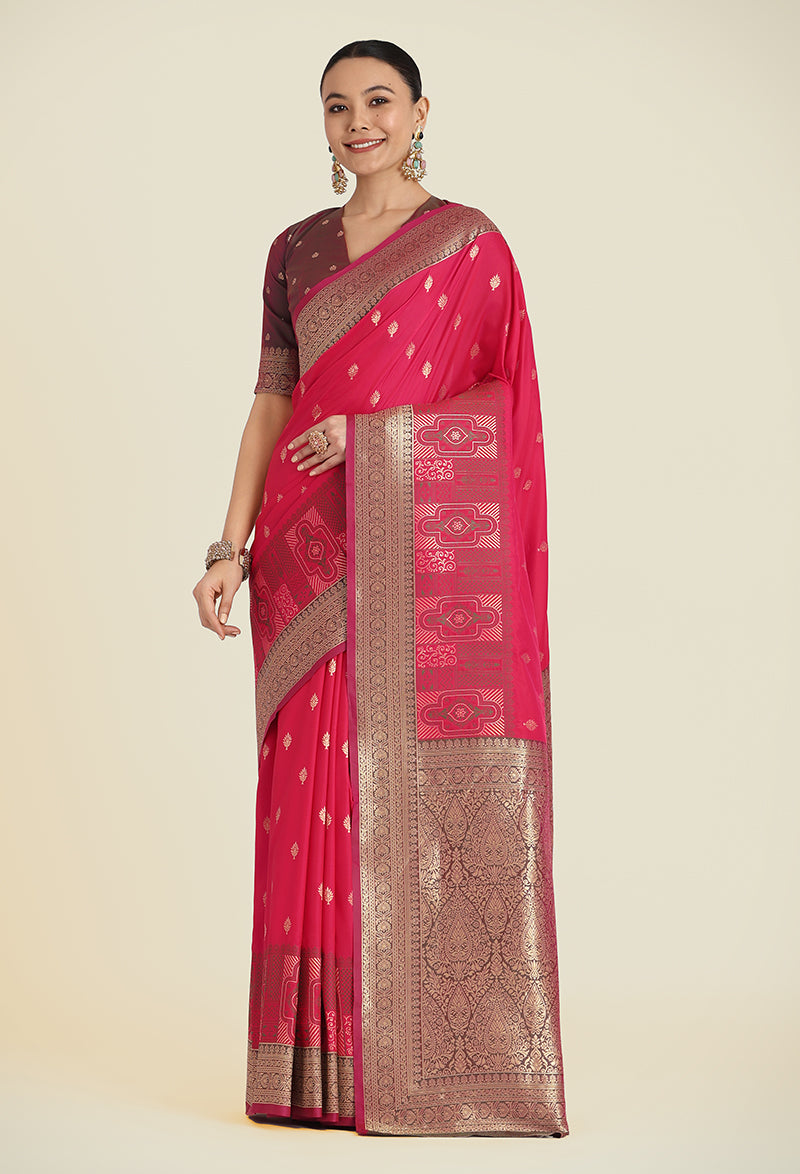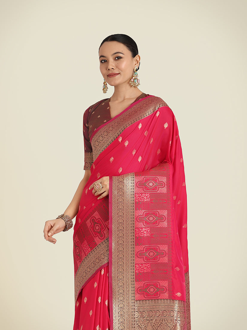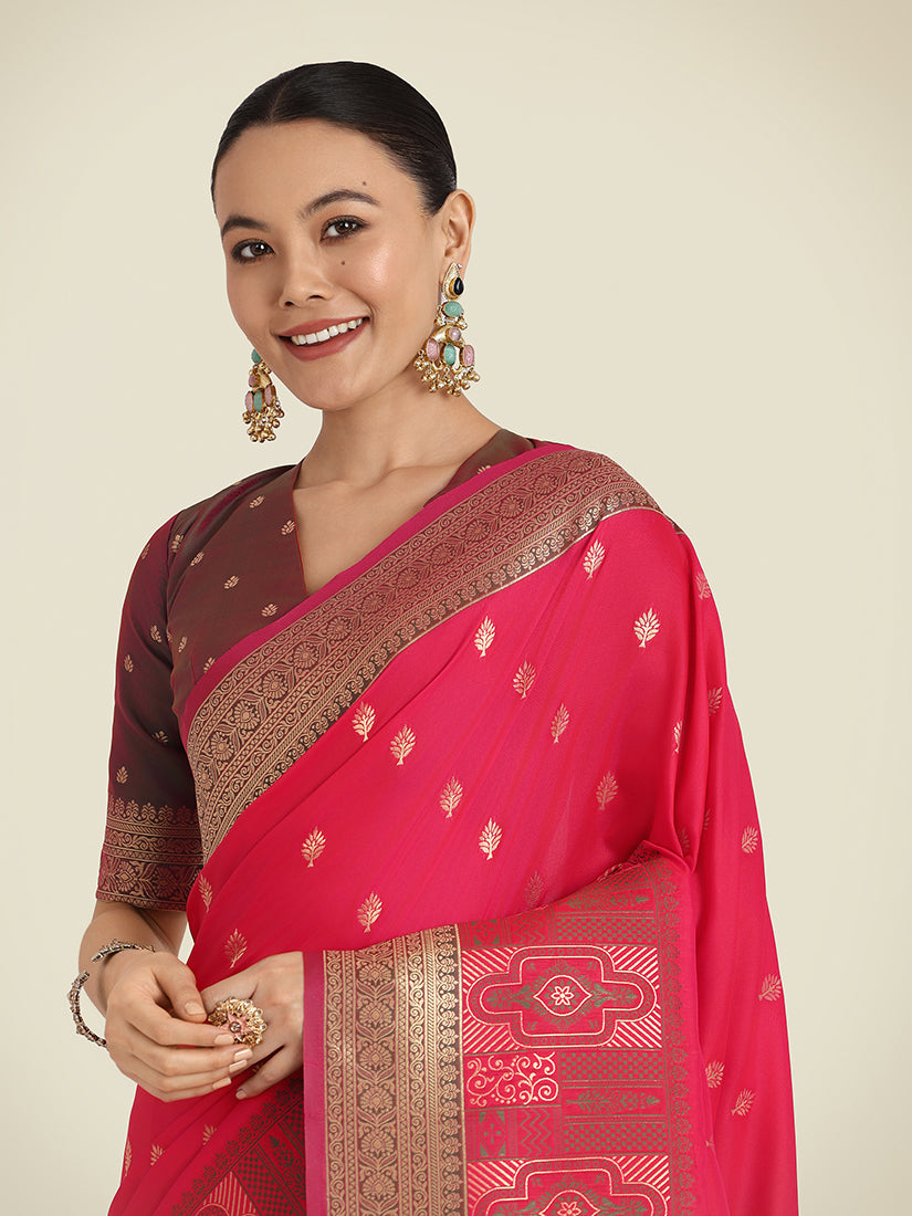 Monjolika Fashion Vogue and pattern would be on the peak of your beauty as soon as you attire this pink color Banarasi Soft silk trendy saree. Look ravishing clad in this dress that's enhanced meenakari and woven work. Comes with matching blouse. (Slight variation in color, fabric & work is possible. Model images are only representative.)