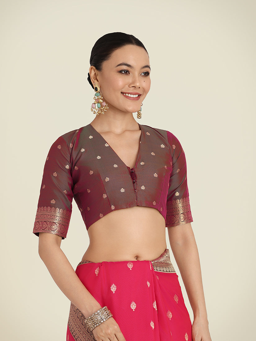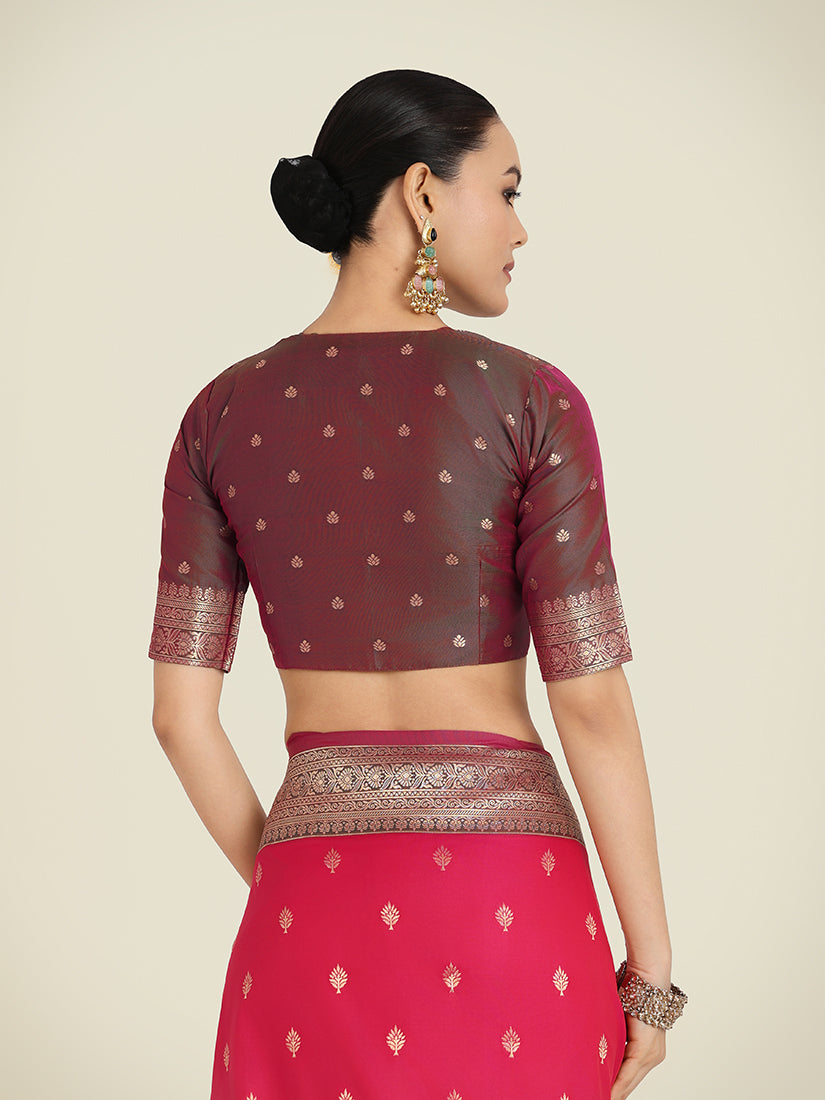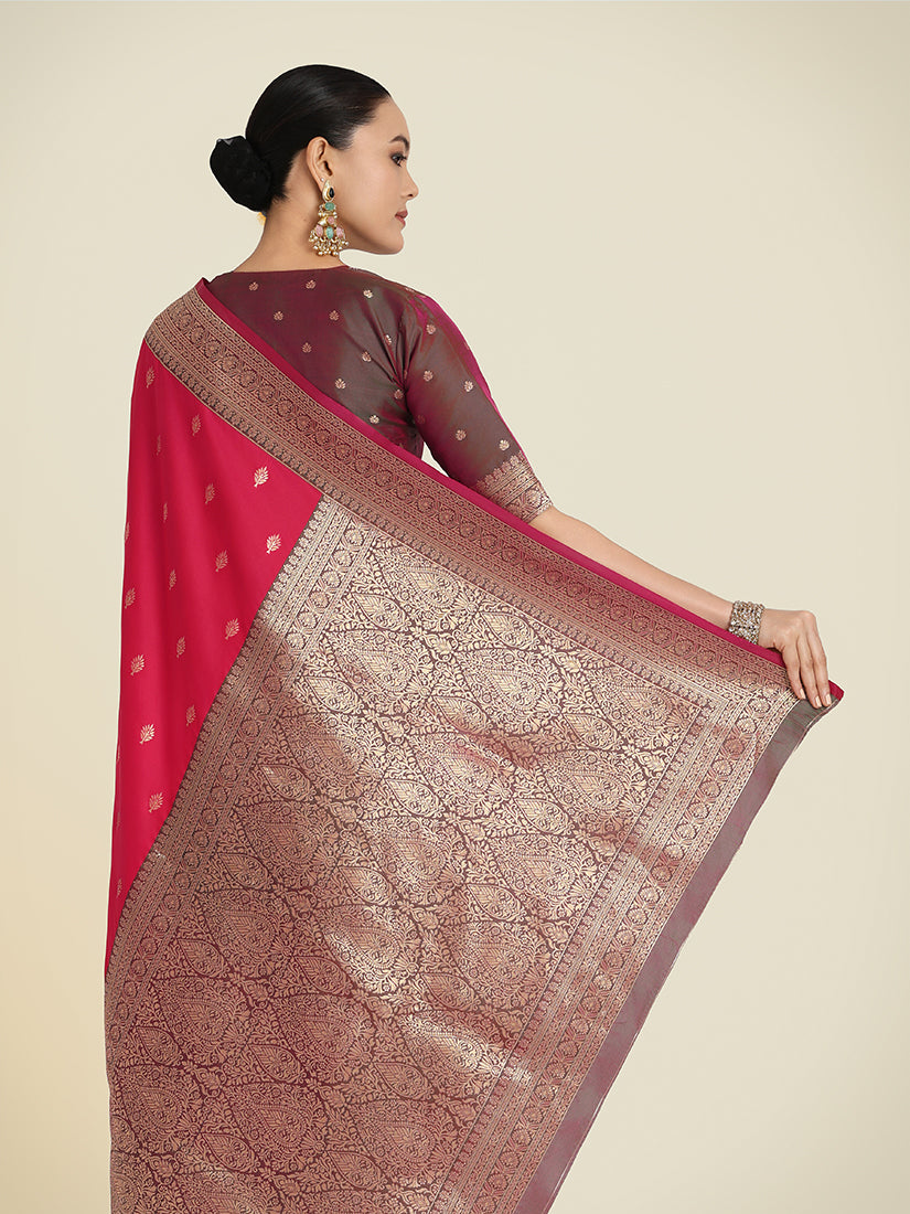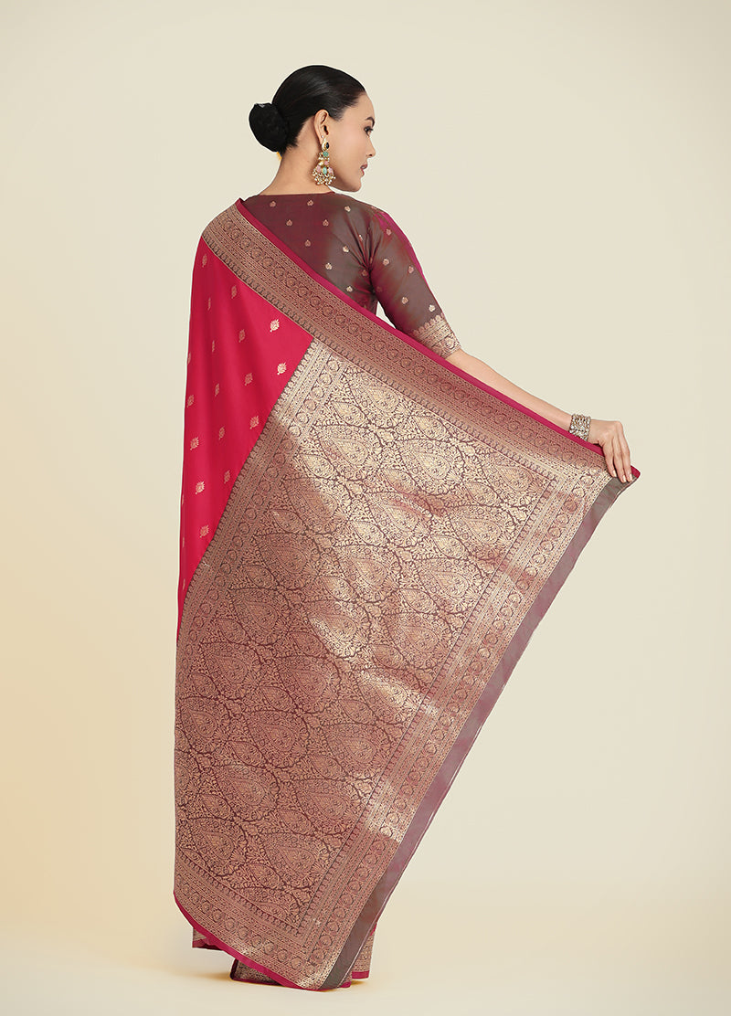 Monjolika Fashion Vogue and pattern would be on the peak of your beauty as soon as you attire this pink color Banarasi Soft silk trendy saree. Look ravishing clad in this dress that's enhanced meenakari and woven work. Comes with matching blouse. (Slight variation in color, fabric & work is possible. Model images are only representative.)