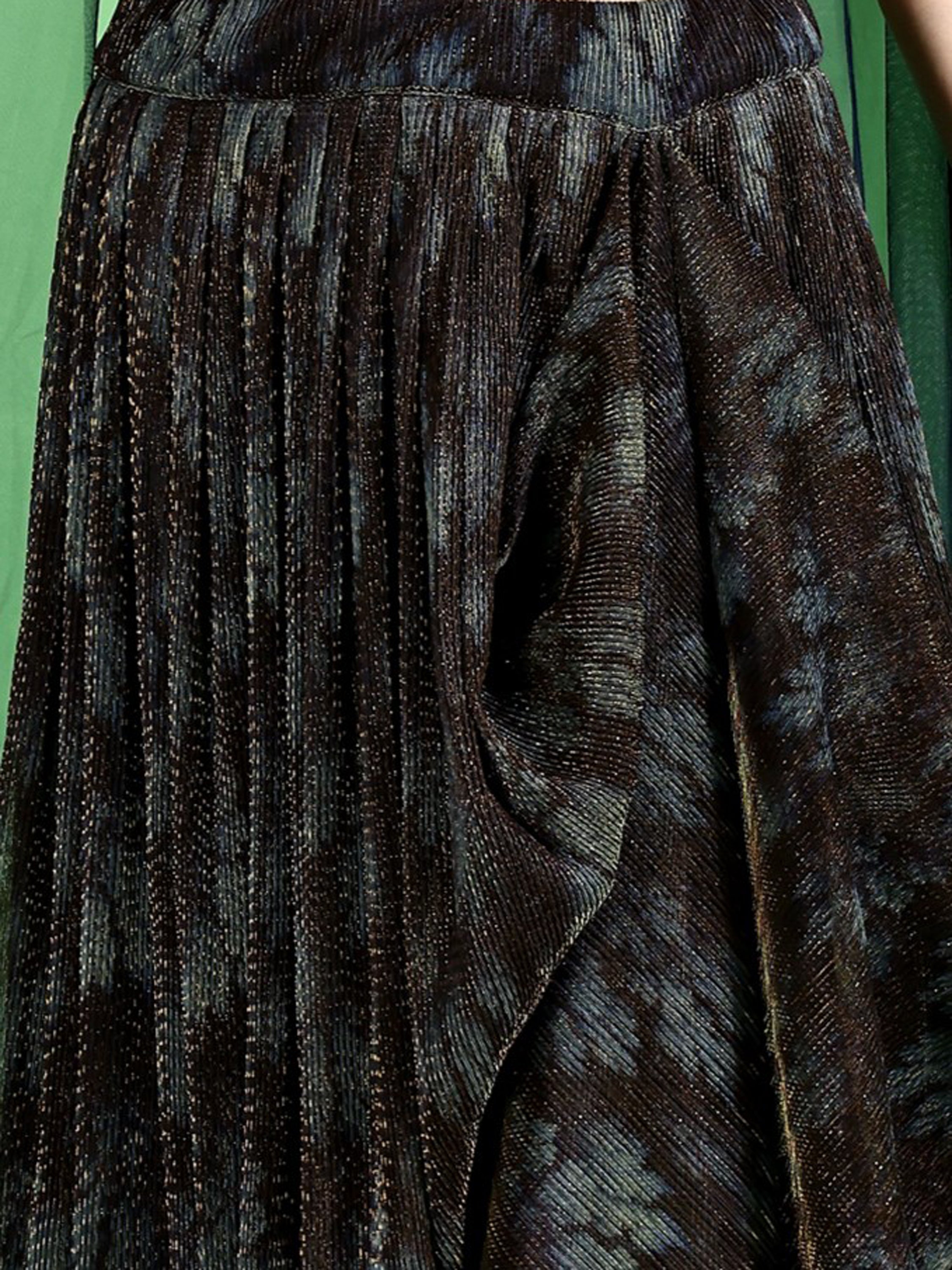 Step into a world of mystique with this unique abstract-printed lycra lehenga choli. The printed patterns add depth and movement to the outfit, while the stretch fabric sculpts your form with grace. The lehenga comes in a free size (stitched), while the unstitched choli can be customized to fit bust sizes ranging from 34 to 42 inches.
