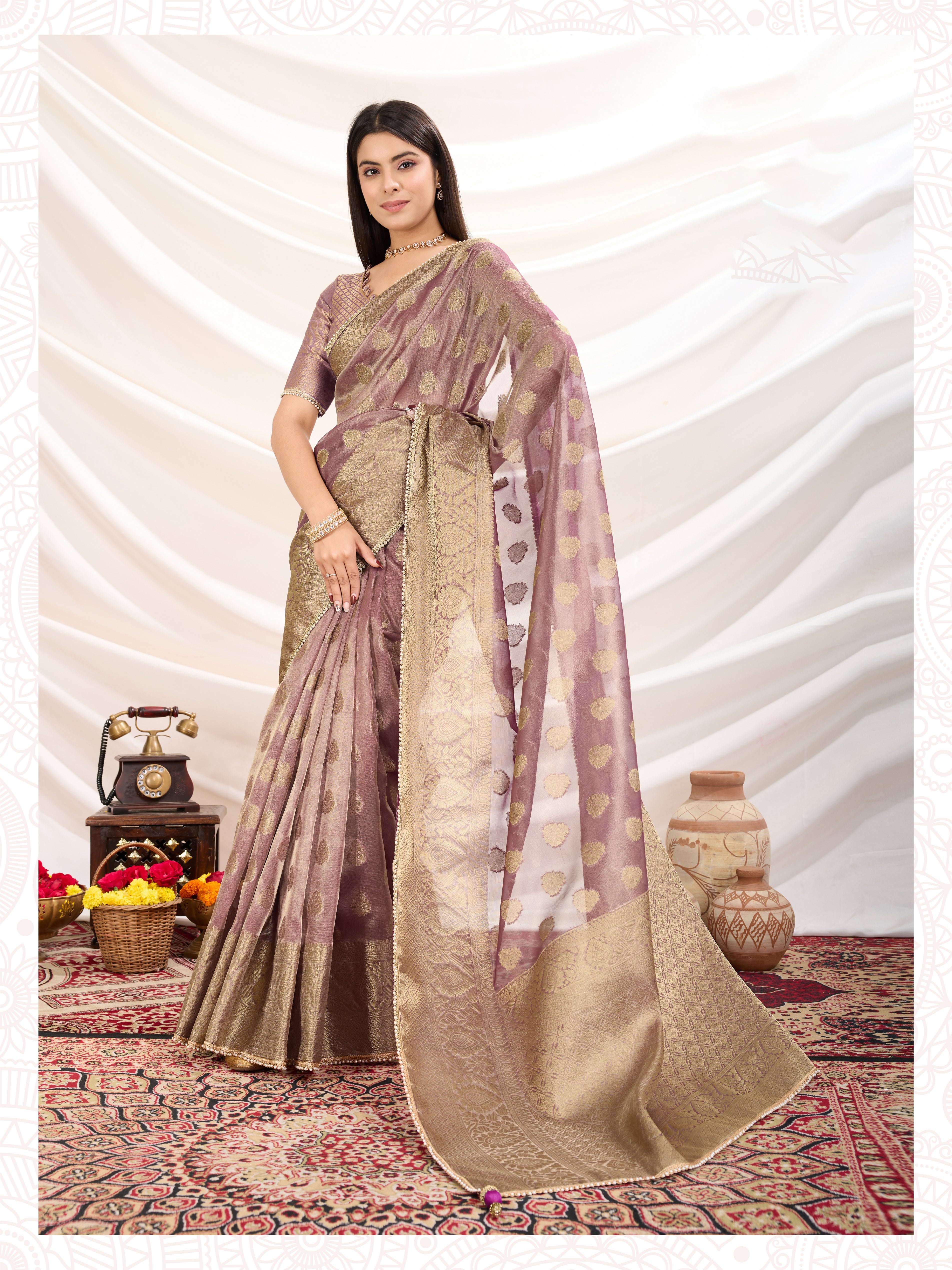 Capture the exuberance of womanhood in its full glory that will bring out your fragility and femininity. You are sure to make a strong fashion statement with this light purple crush tissue designer saree. The border and zari work personifies the entire appearance. Comes with matching blouse. (Slight variation in color, fabric & work is possible. Model images are only representative.)