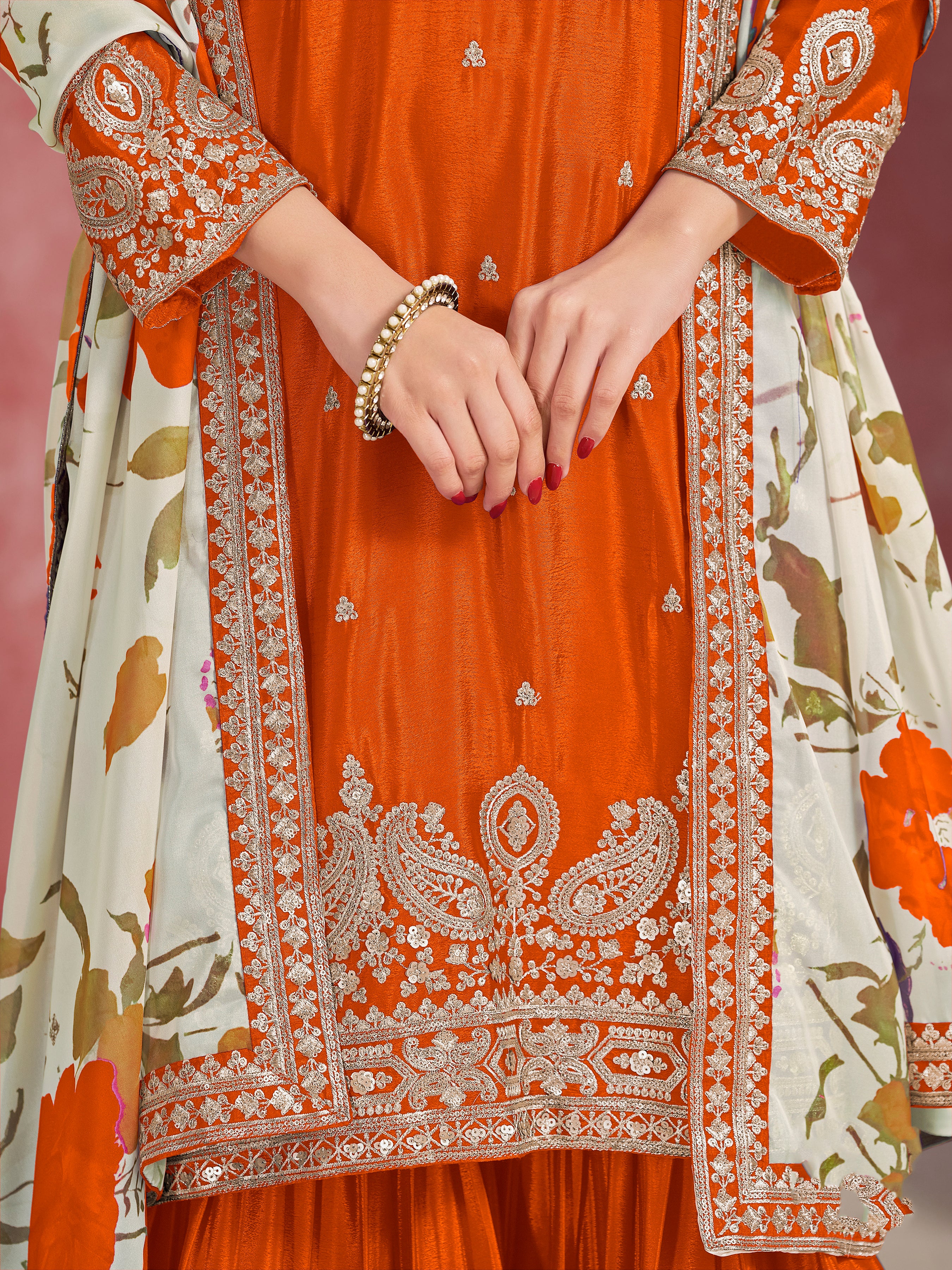 Make the heads turn whenever you dress up in this wonderful orange chinon and silk palazzo salwar suit. This engaging dress is displaying some wonderful embroidery done with embroidered and thread work work. Comes with matching bottom and dupatta. (Slight variation in color, fabric & work is possible. Model images are only representative.)