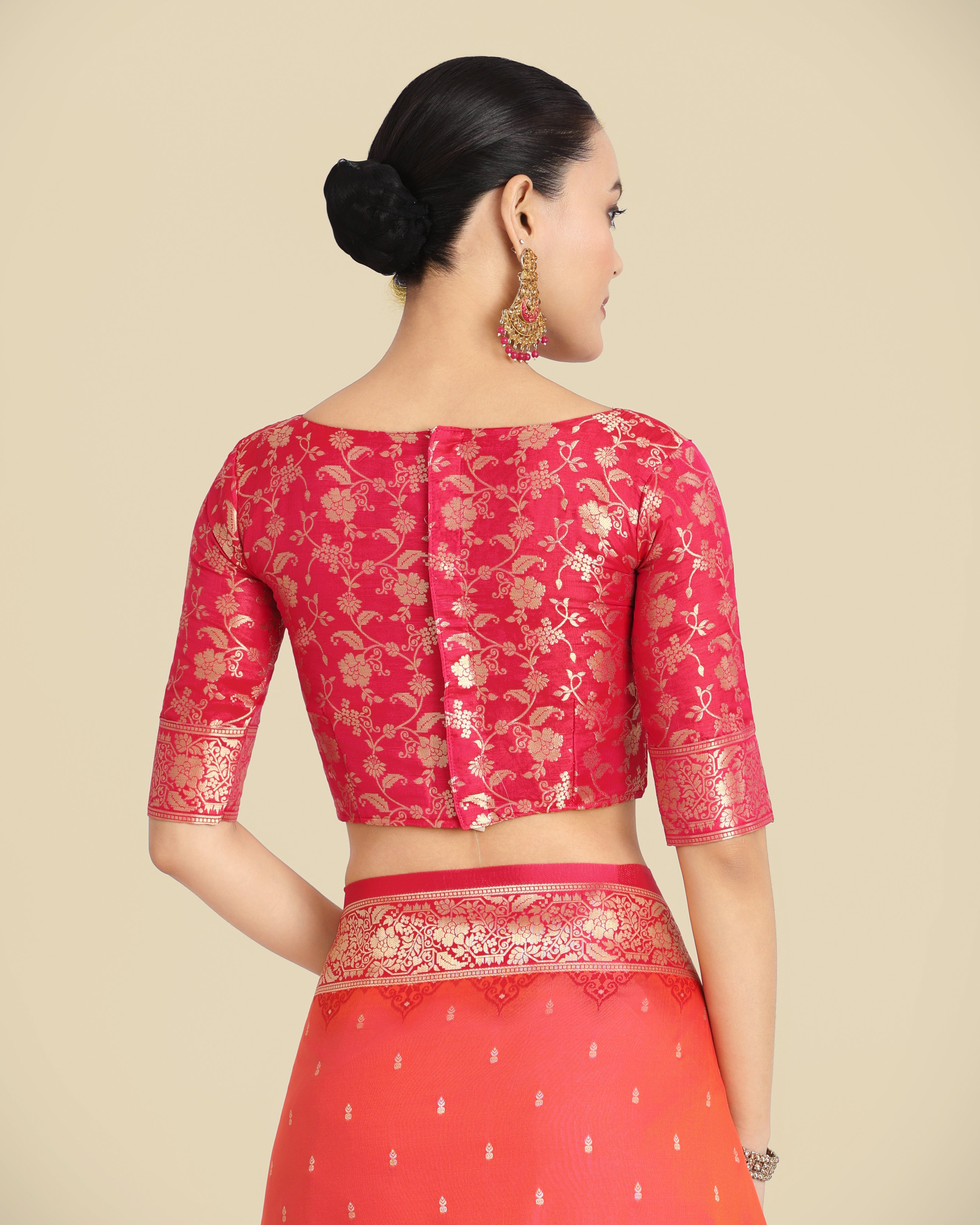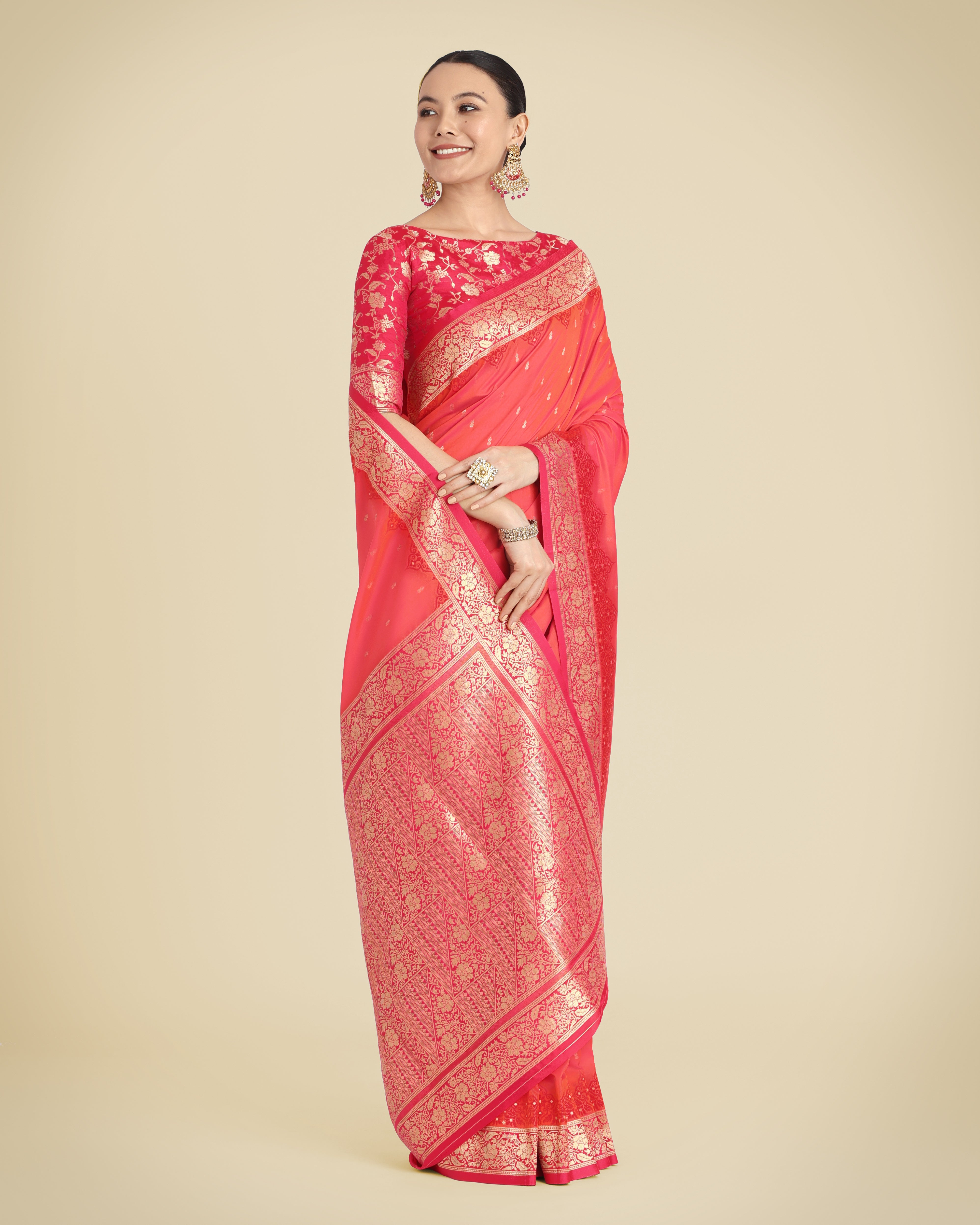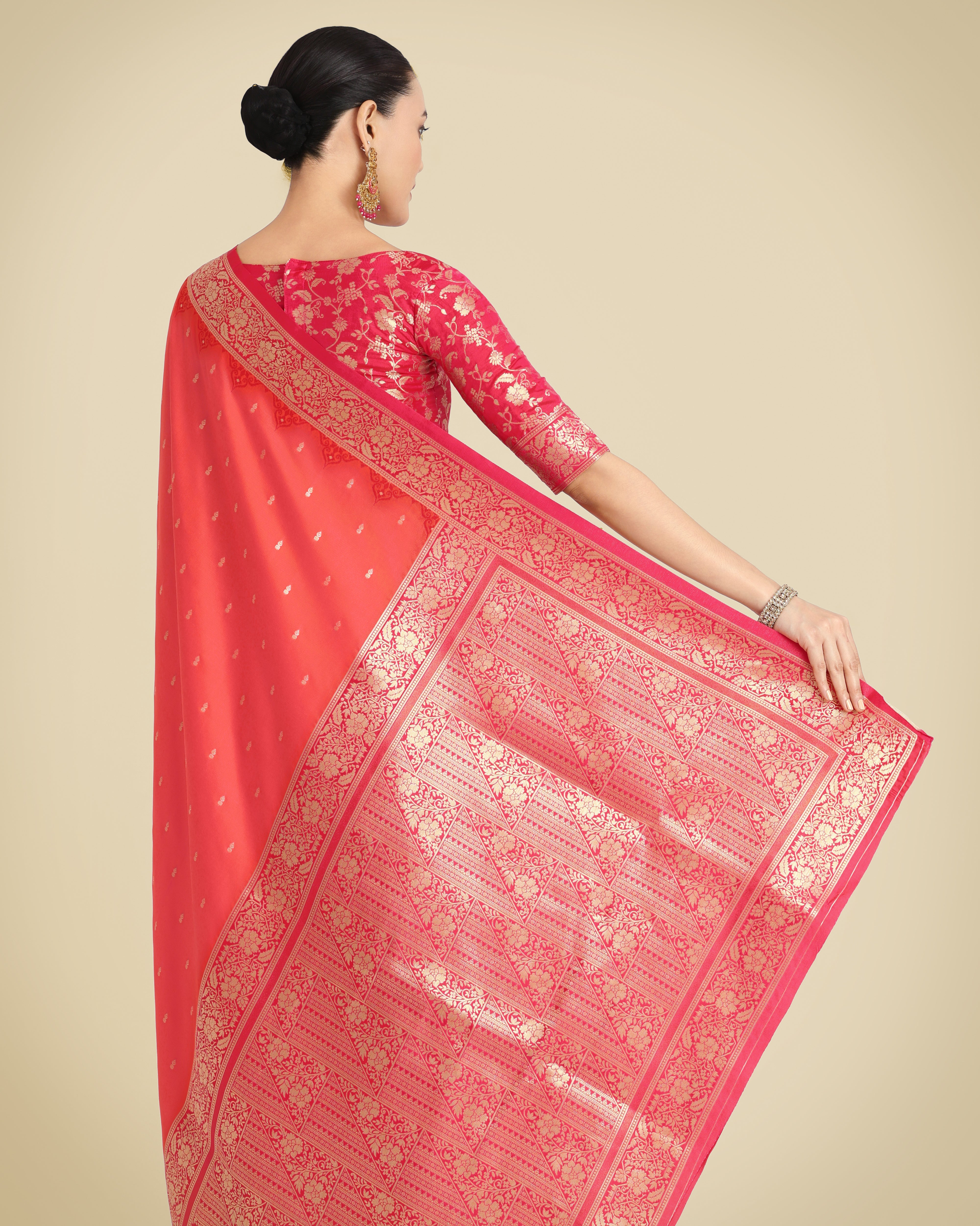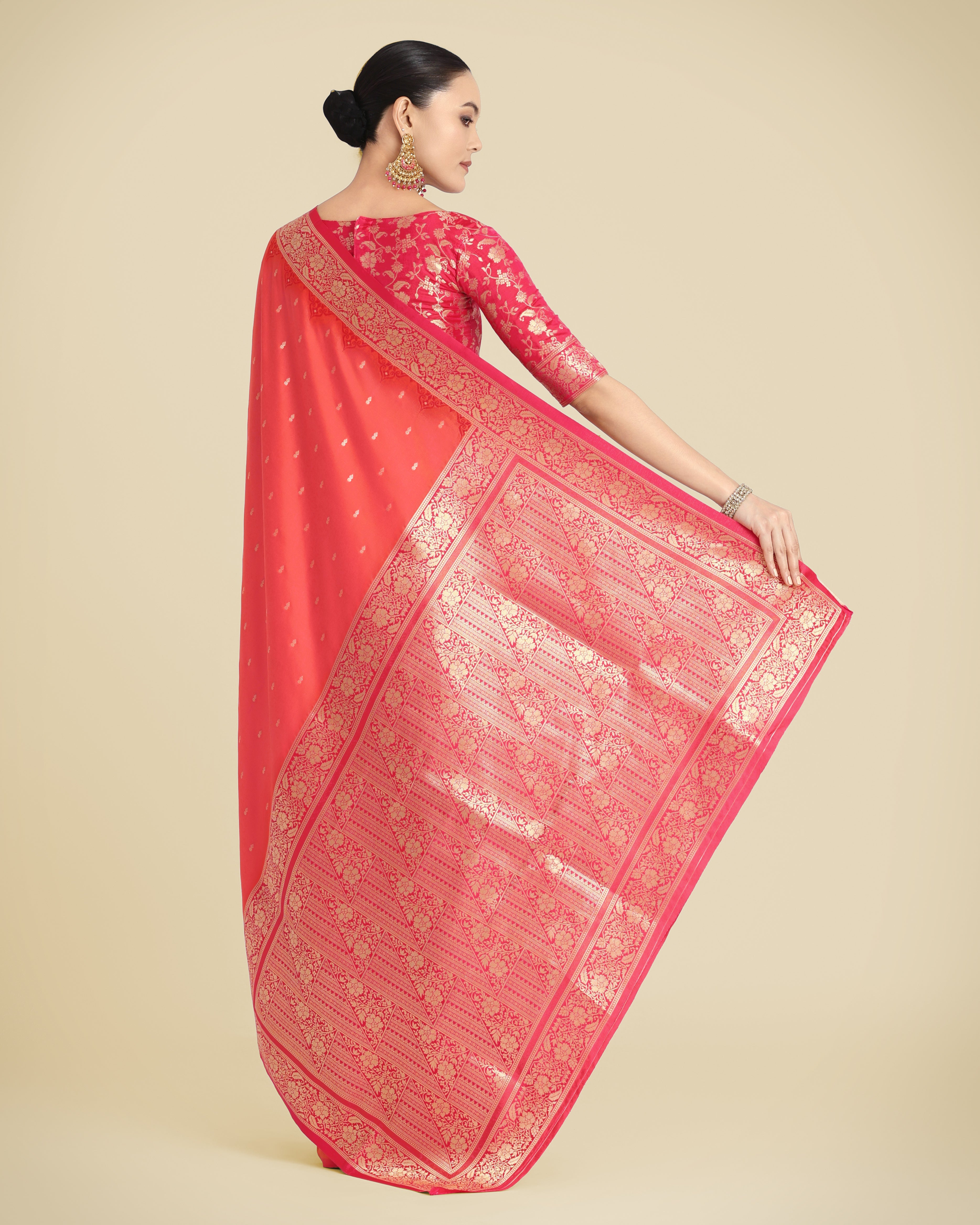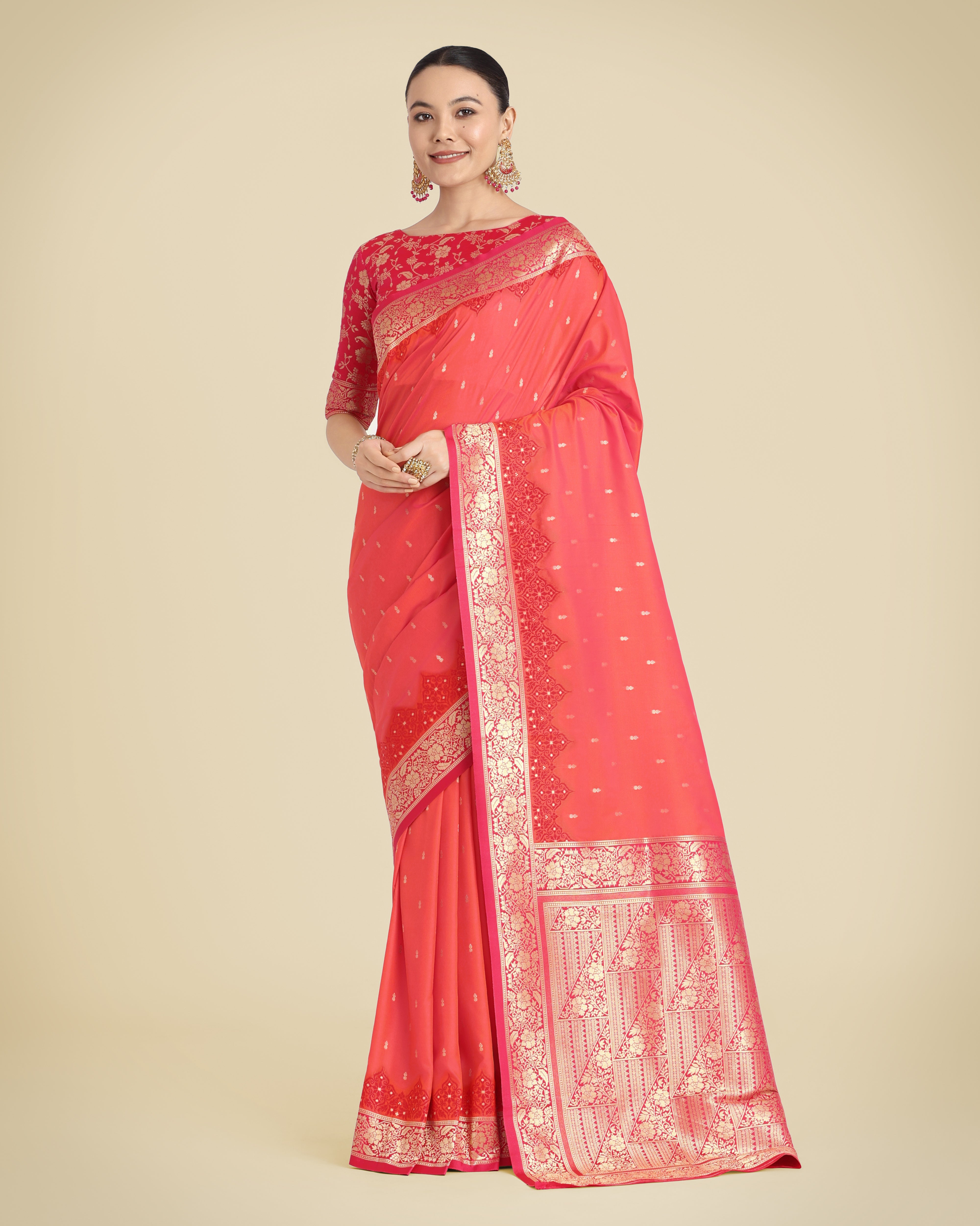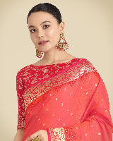 Monjolika Fashion Presents Embrace the perfect blend of tradition and style with this Coral banarasi soft silk saree. Featuring an intricate butti design across the body and rich zari woven borders, this saree is a must-have for your ethnic wardrobe. Its luxurious texture and vibrant hues make it an ideal choice for festive gatherings and celebrations. Pair it with statement jewelry to enhance its timeless beauty and make a lasting impression.