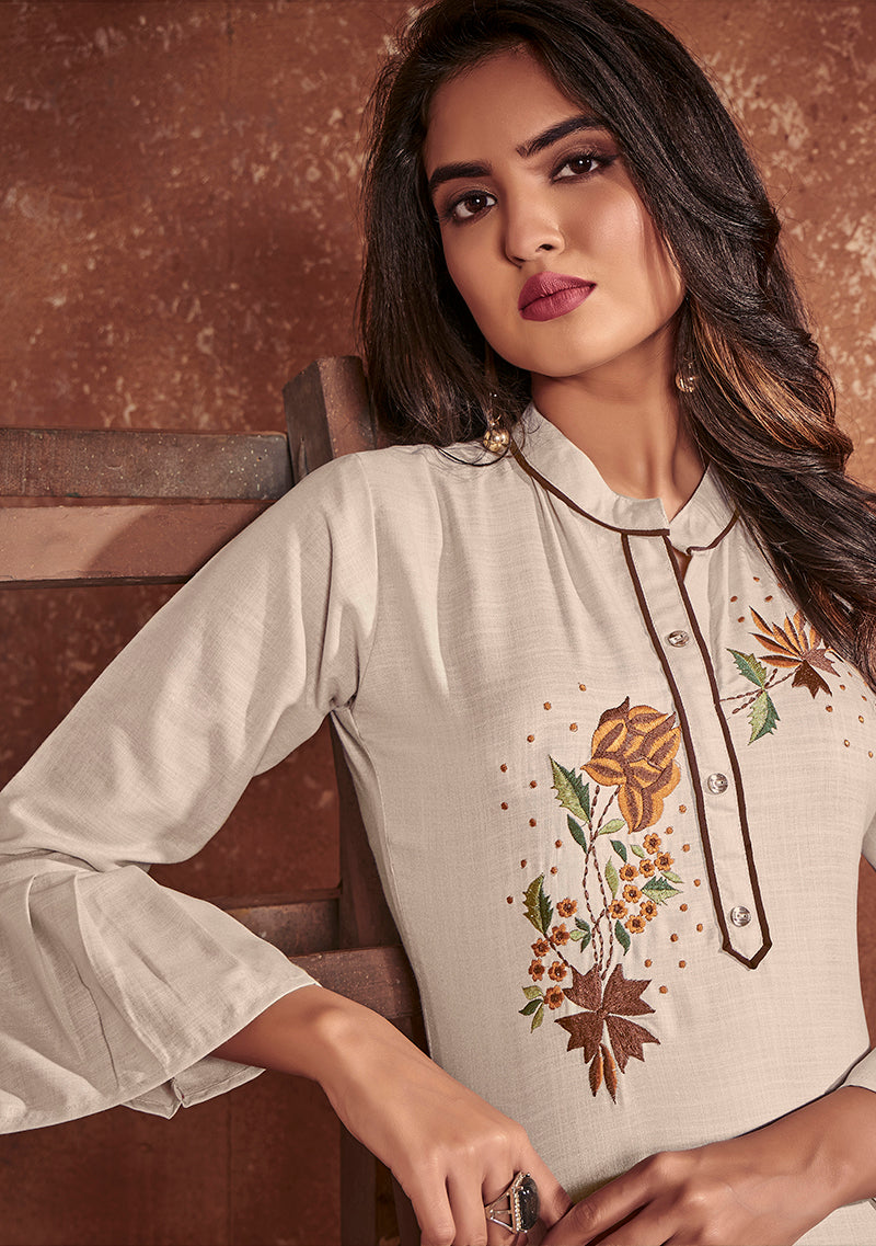 Add a adolescent burst of color inside your wardrobe with this Off White cotton party wear kurti. Beautified with embroidered work all synchronised well with the trend and style of the dress. (Slight variation in color, fabric & work is possible. Model images are only representative.)