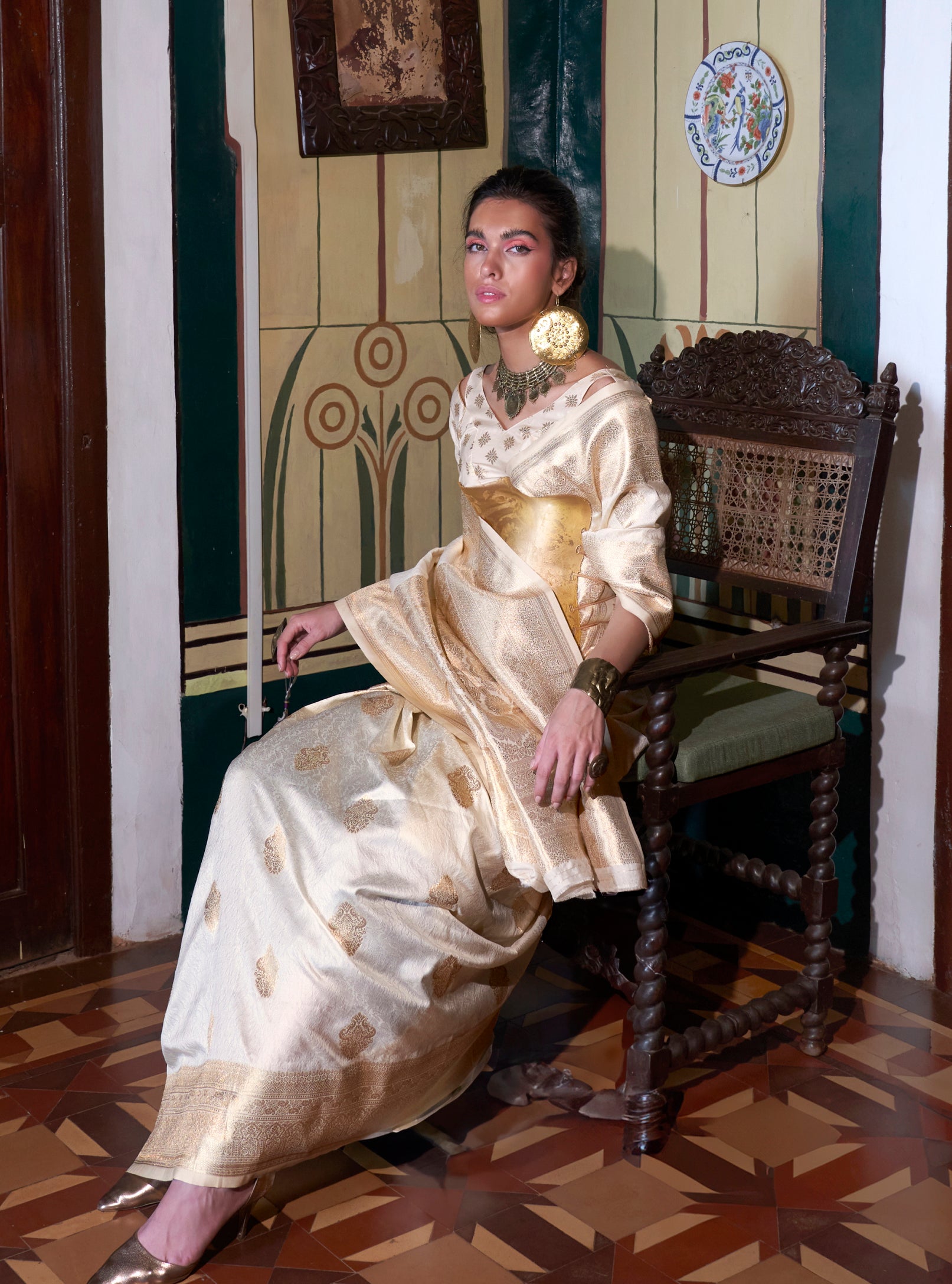 If you are a diva who loves to turn heads wherever you go and this delightful drape is a must have item for your closet. Fashion and trend will be at the peak of your magnificence the moment you dresses this cream twotone weaving silk classic saree. This engaging attire is displaying some amazing done with weaving zari work. Comes with matching brocade blouse. (Slight variation in color, fabric & work is possible. Model images are only representative.)