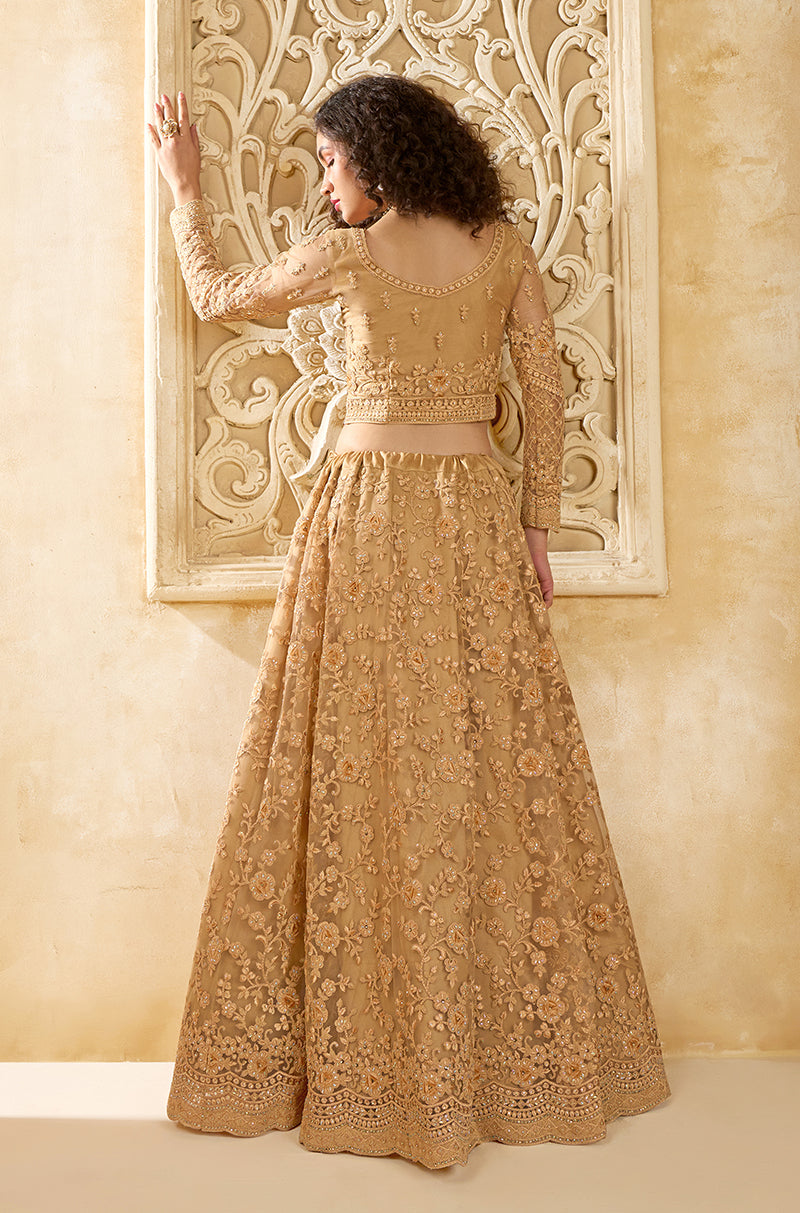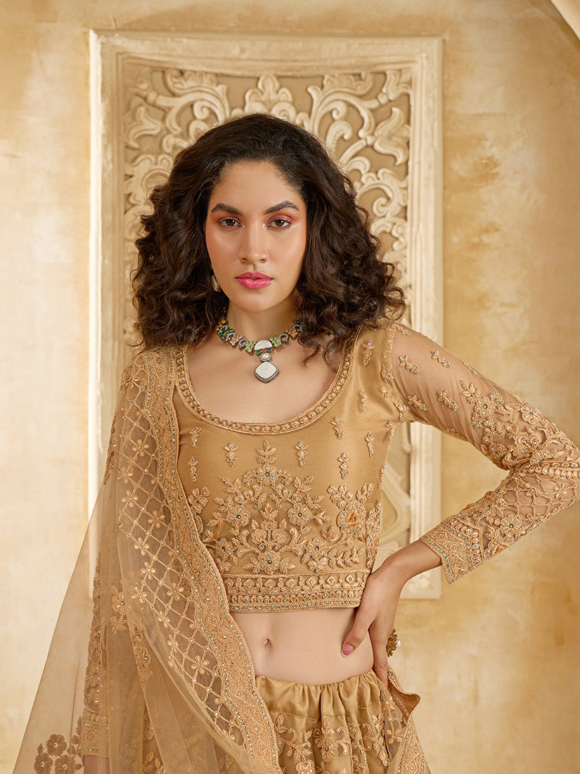 Be an angel and create and ascertain a smashing effect on everyone by carrying this chiku net designer lehenga choli. The ethnic embroidered, resham and stone work to your dress adds a sign of attractiveness statement for the look. The unstitched lehenga choli bust size can be customized from 34 to 42 inches.Comes with a matching choli and dupatta. (Slight variation in color, fabric & work is possible. Model images are only representative.)