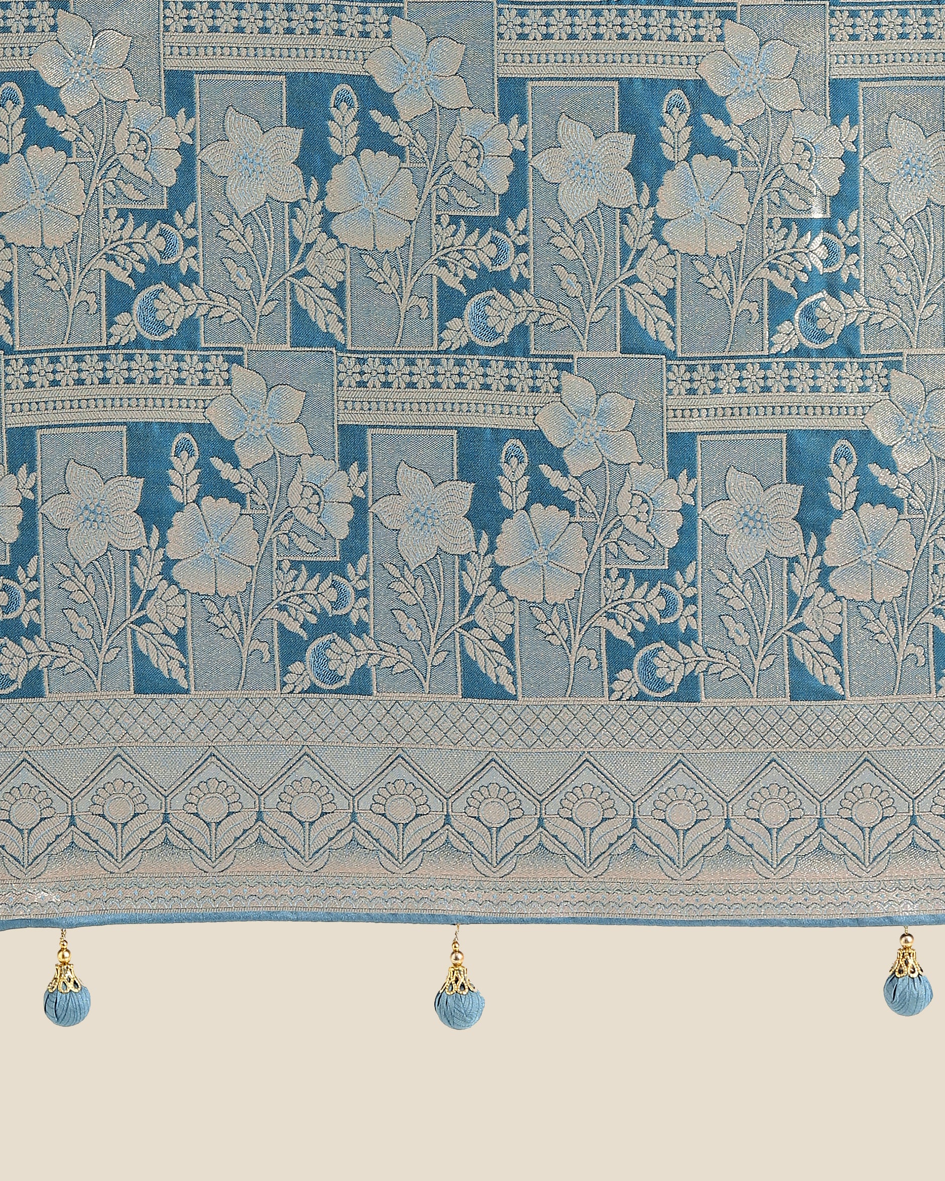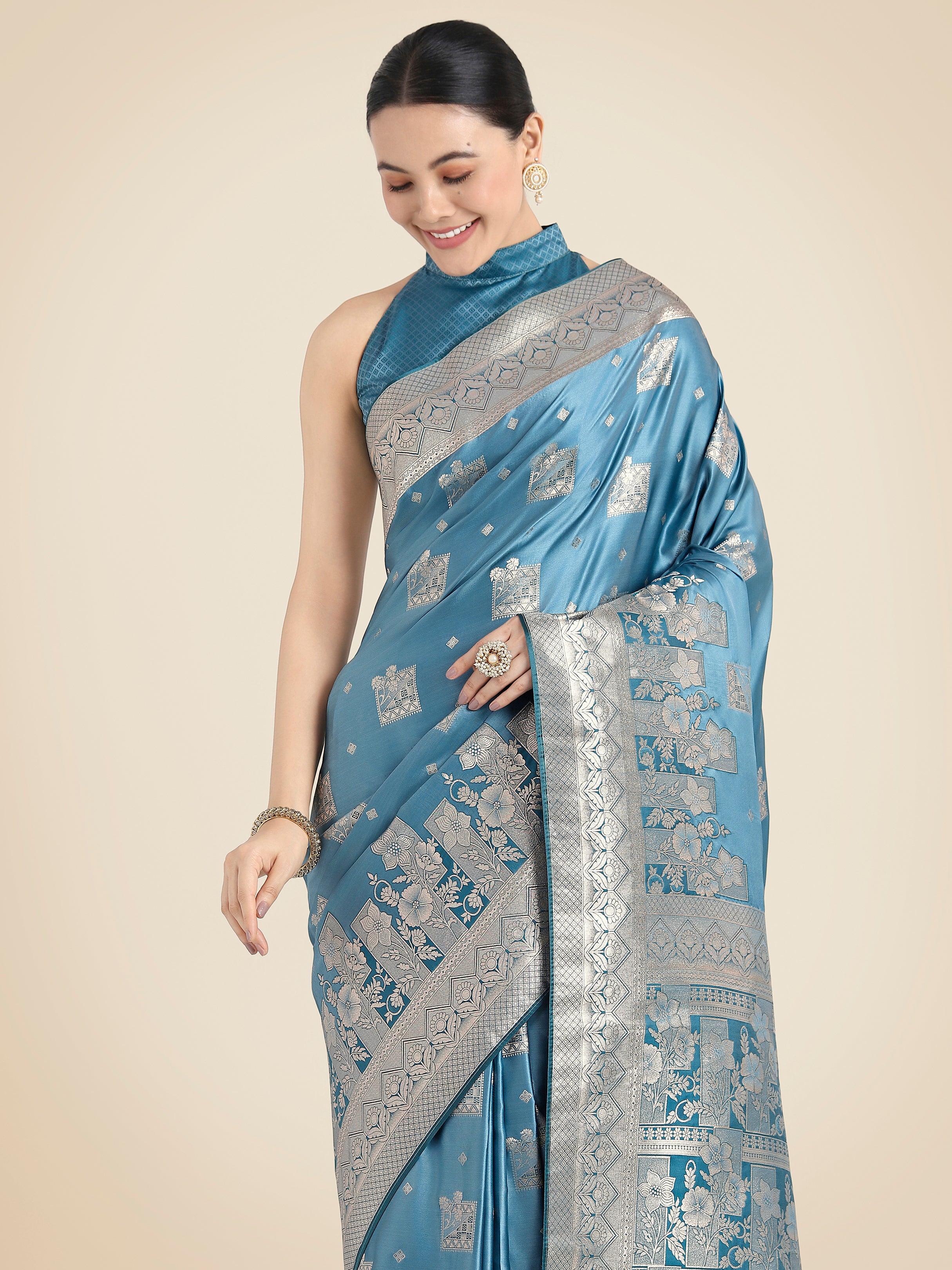 We have ensemble a symphony of enchanting piece to restyle your senses. Real beauty comes out from your dressing style with this Cyan blue Banarasi satin silk traditional saree. This attire is showing some really mesmerizing and innovative patterns with weaving work. Comes with matching blouse. (Slight variation in color, fabric & work is possible. Model images are only representative.)