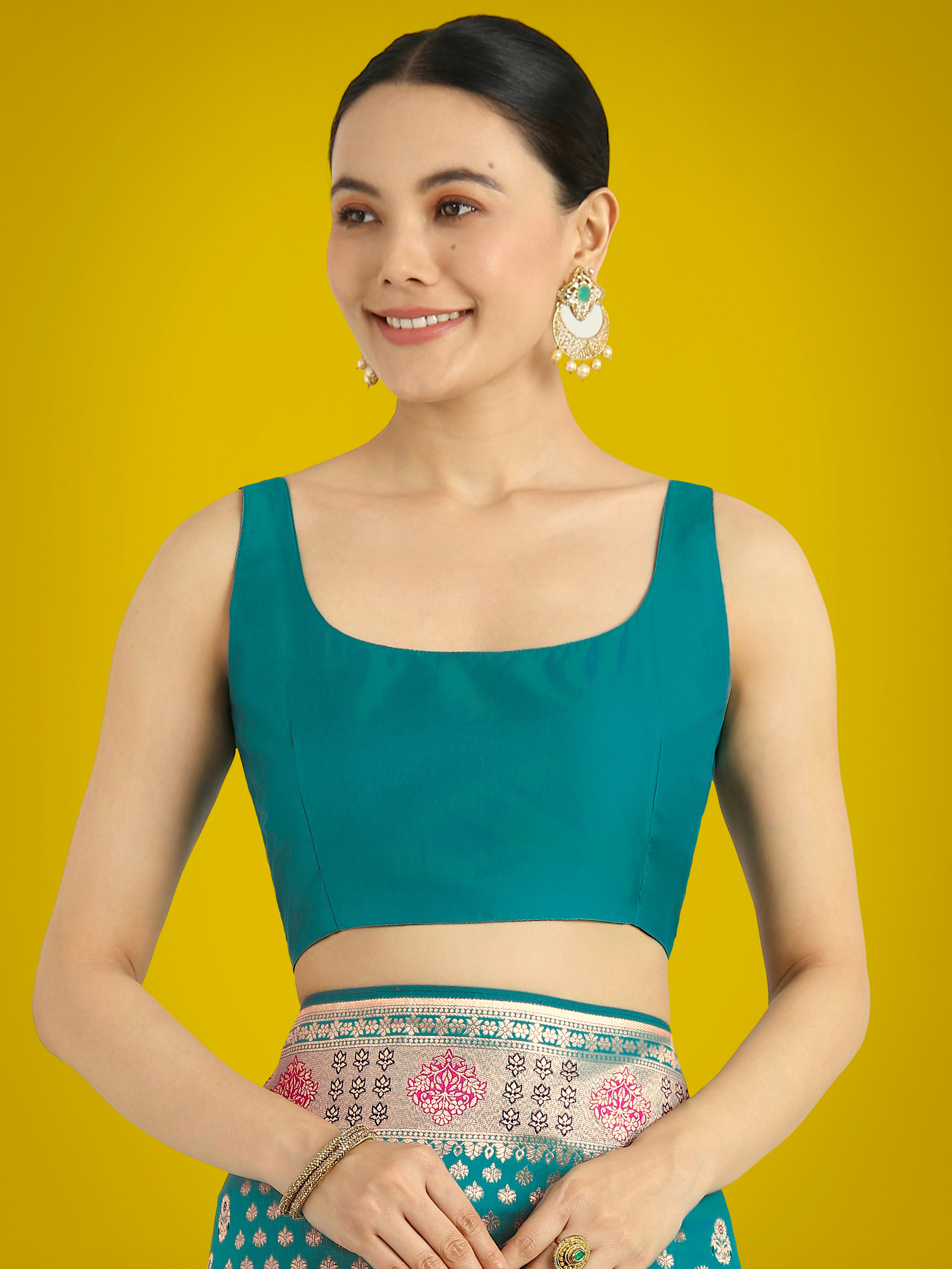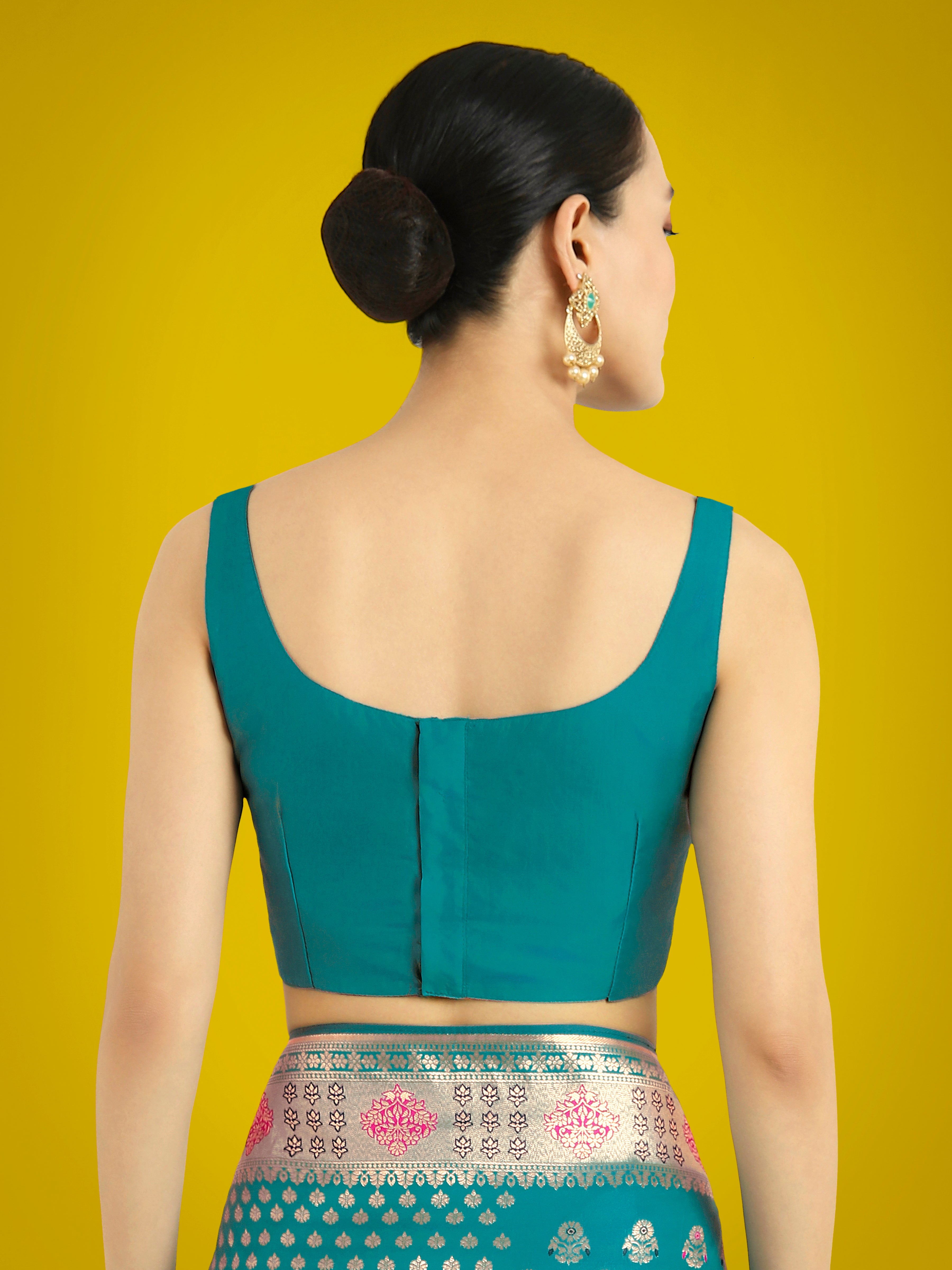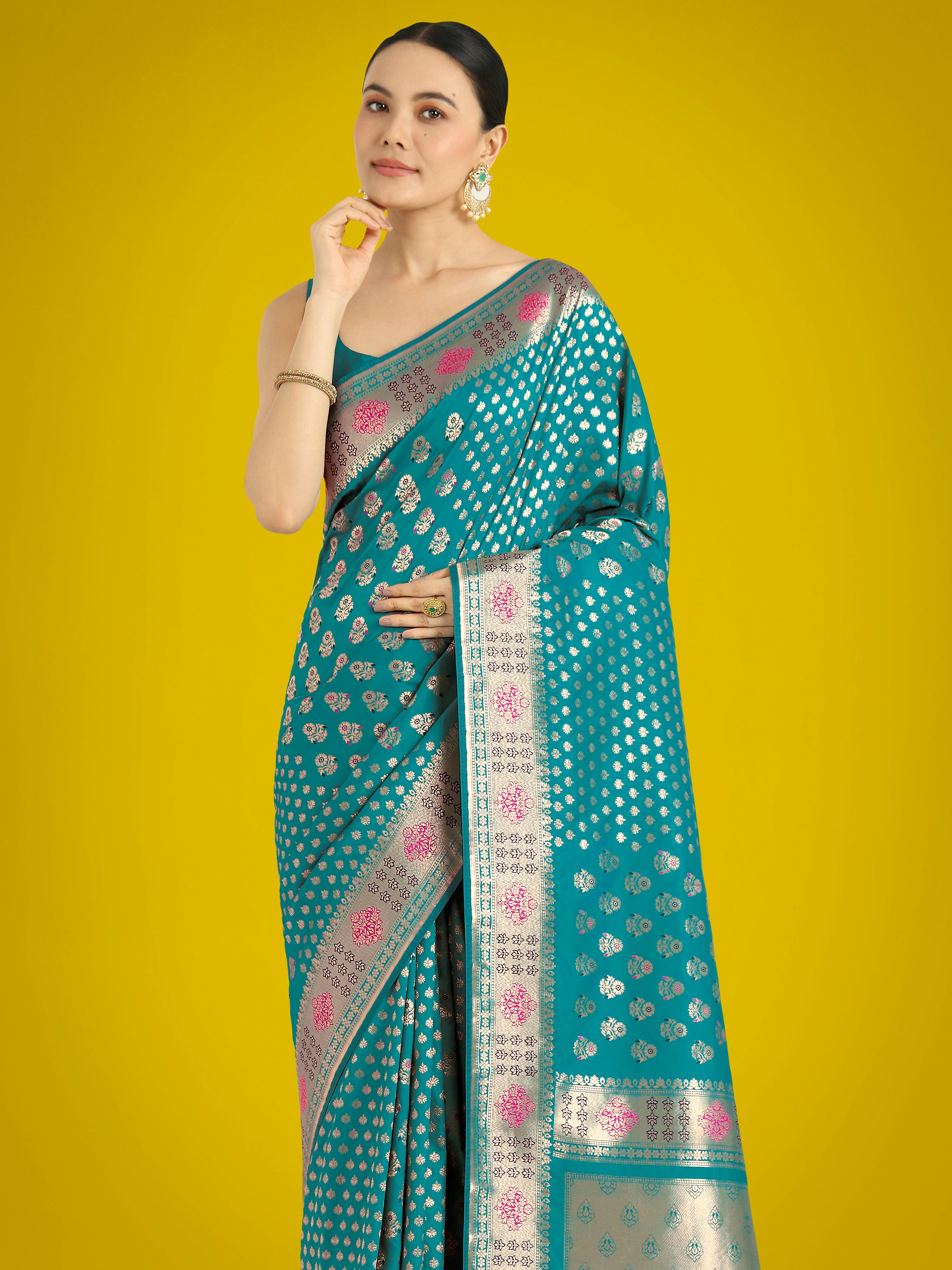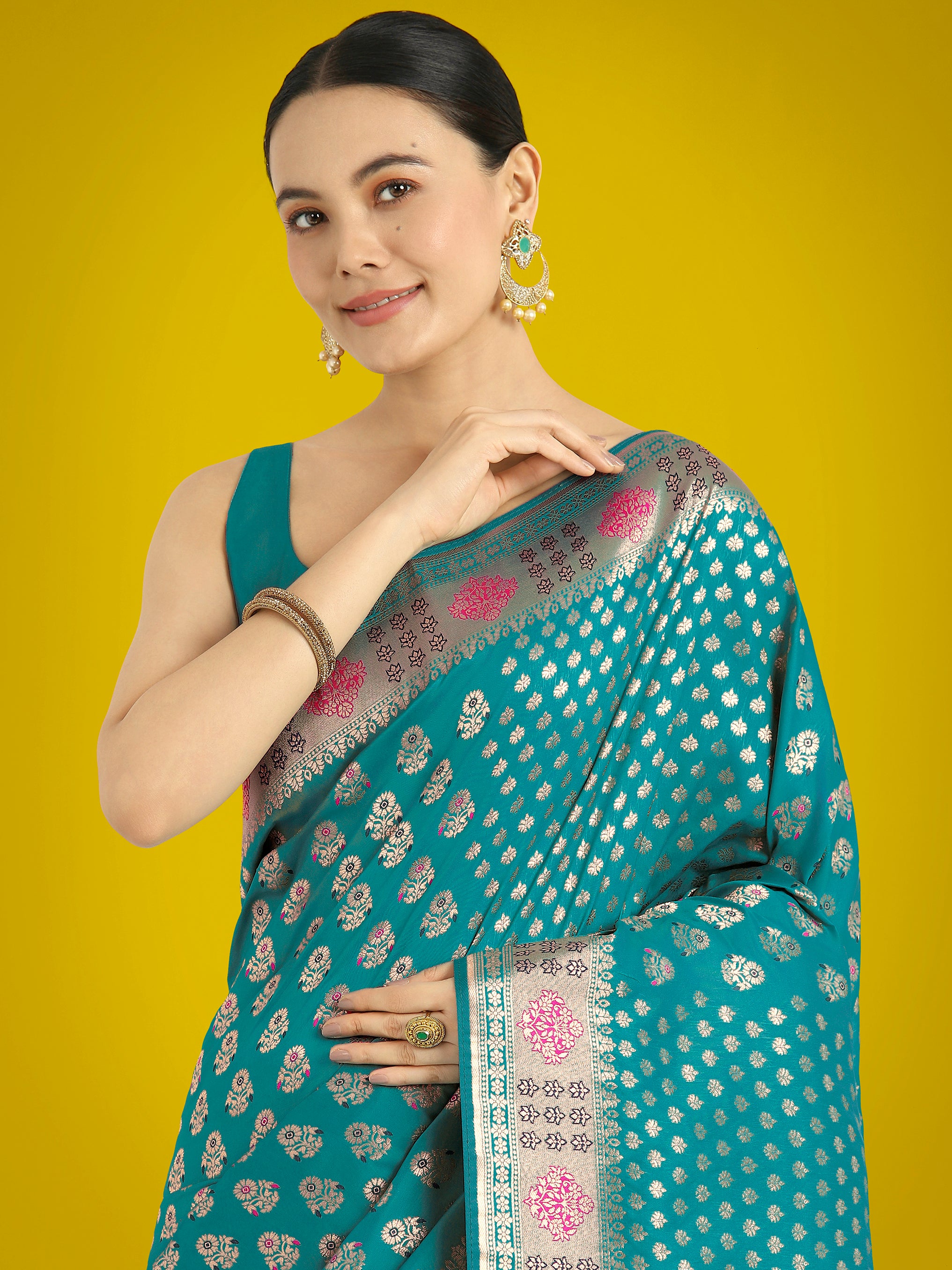 This Cyan blue Banarasi silk classic saree is adding the pretty glamorous showing the feel of cute and graceful. The desirable woven work through the dress is awe inspiring. Comes with matching blouse. (Slight variation in color, fabric & work is possible. Model images are only representative.)