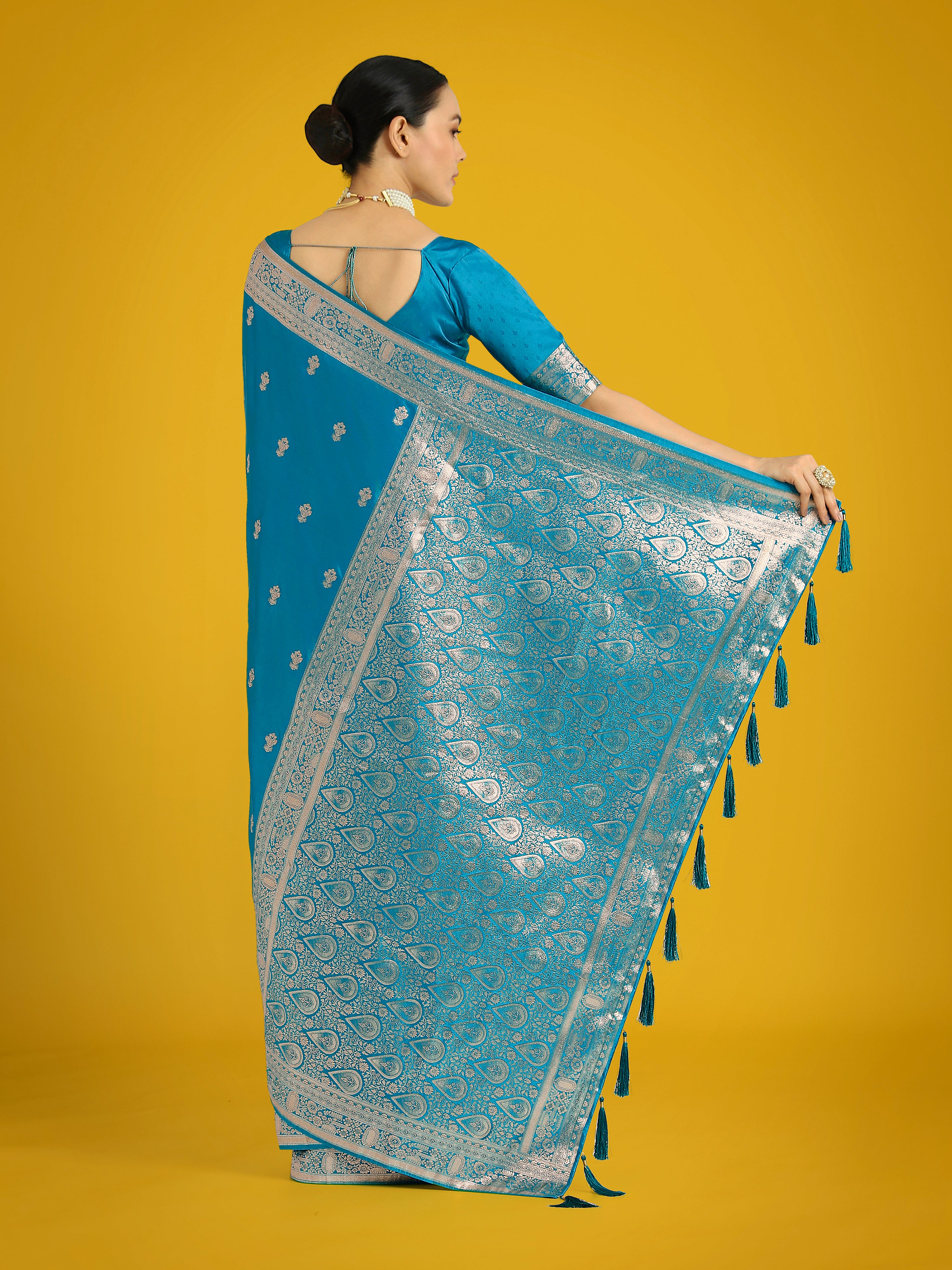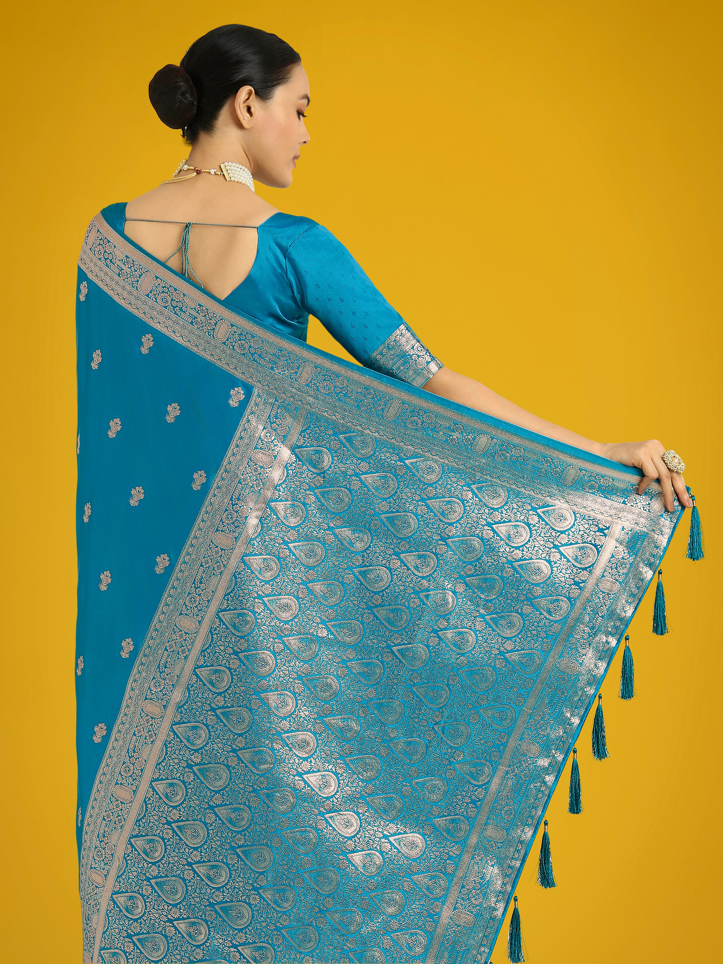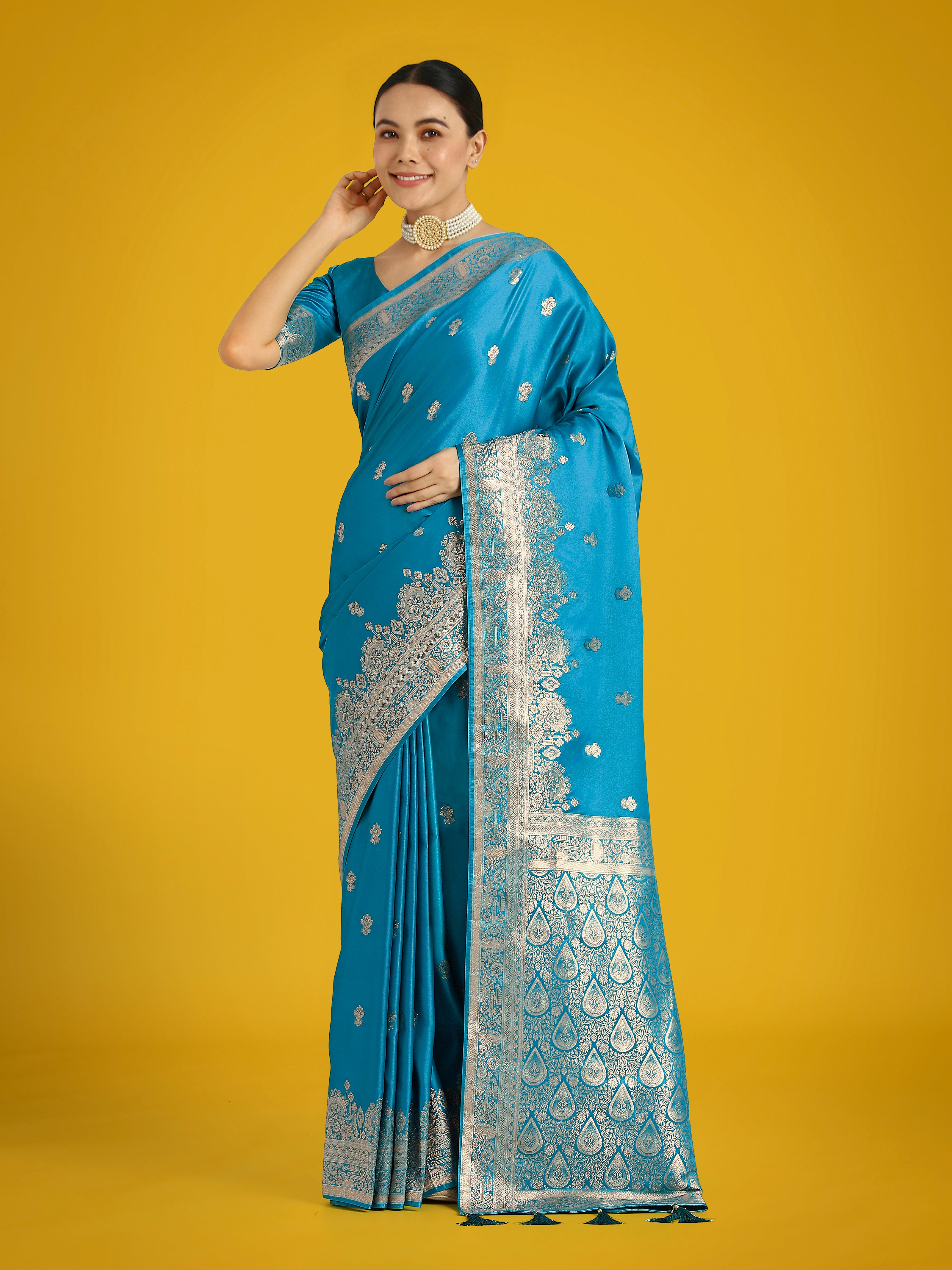 Design and trend will be at the peak of your magnificence after you dresses this Cyan blue color banarasi satin silk contemporary saree. This dress is beautifully adorned with woven and zari work. Comes with matching blouse. (Slight variation in color, fabric & work is possible. Model images are only representative.)