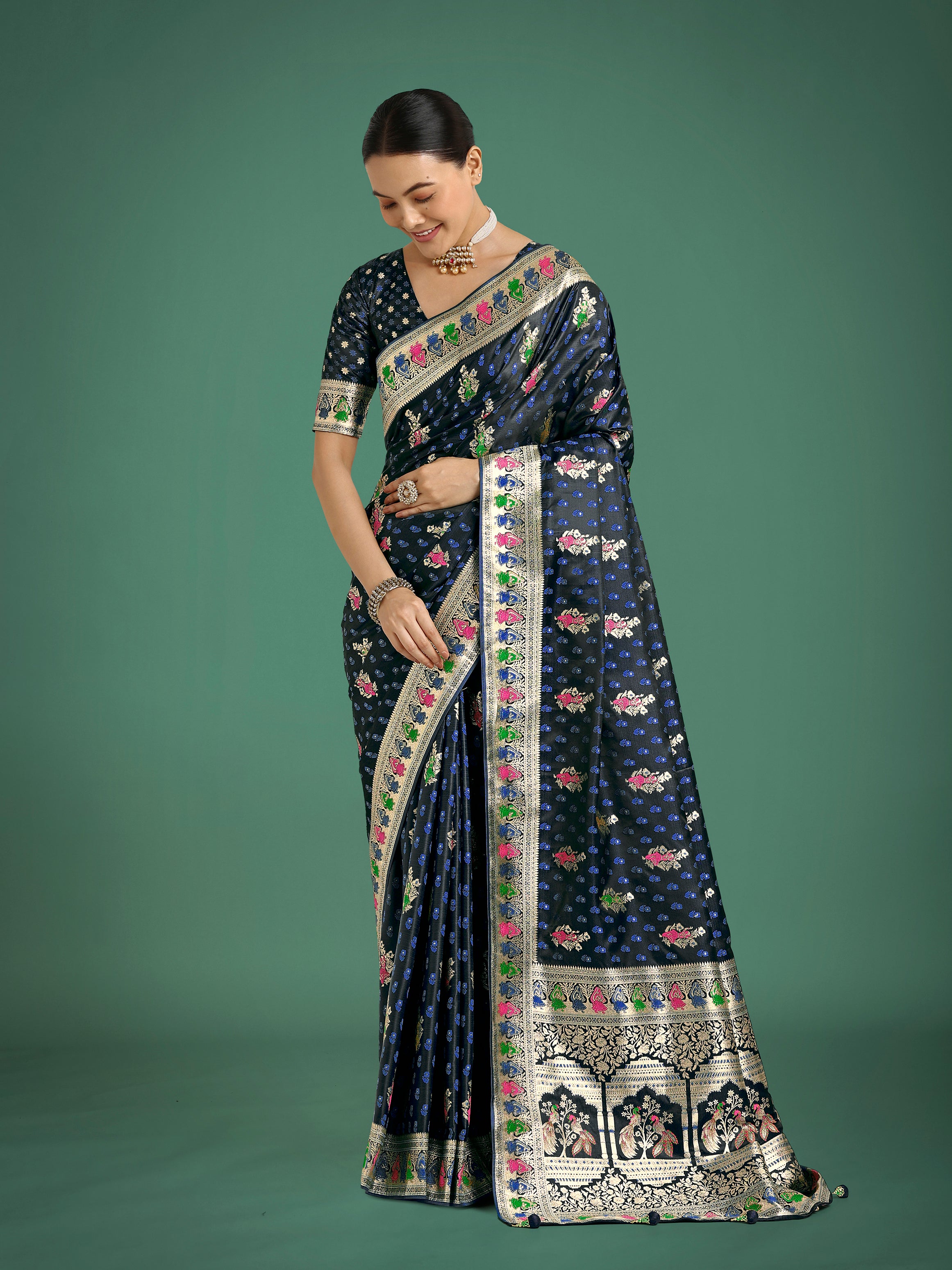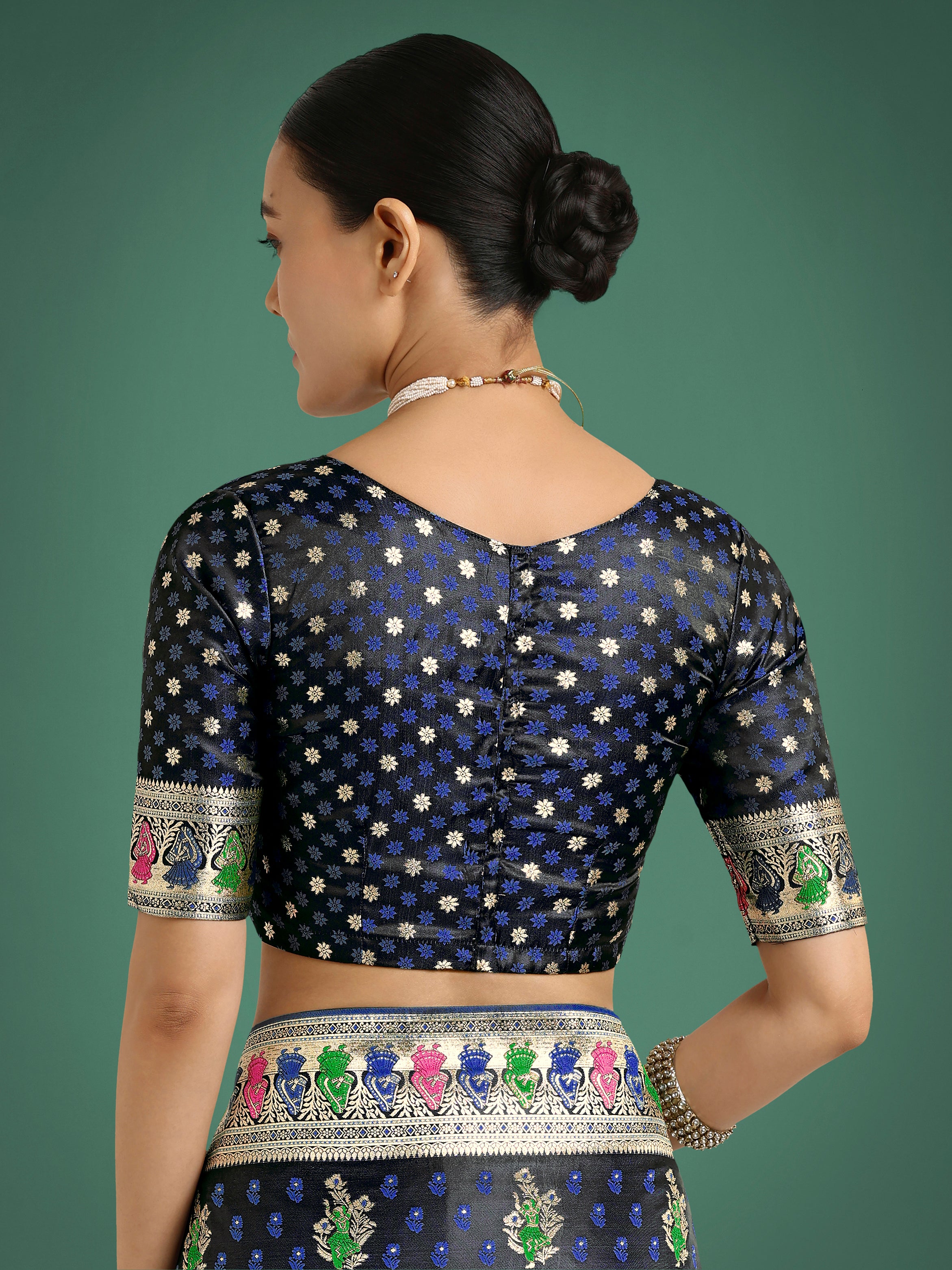 This delightful diva accoutre features unique styling and unusual material. Women magnificence is magnified tenfold in this alluring Dark Blue Banarasi satin silk contemporary saree. The ethnic border, fancy, zari weaving work and lace work for the attire adds a sign of magnificence statement with a look. Comes with matching blouse. (Slight variation in color, fabric & work is possible. Model images are only representative.)