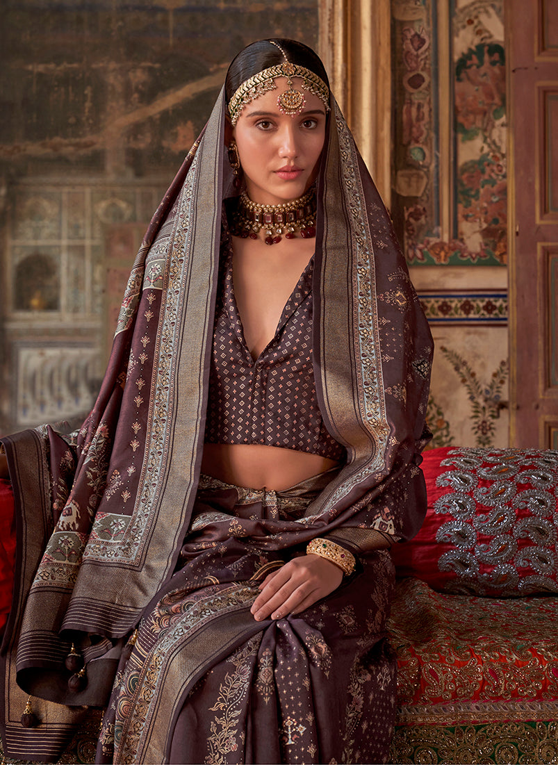 This pretty piece is a fairy tale that begins to unfold as you reveal your beauty in it. Get the simplicity and grace with this dark brown silk classic saree. This attire is encrafted with printed work. Comes with matching blouse. Do Note: All the accessories shown are for styling purposes only. Slilght color variation may occur due to photographic reasons.