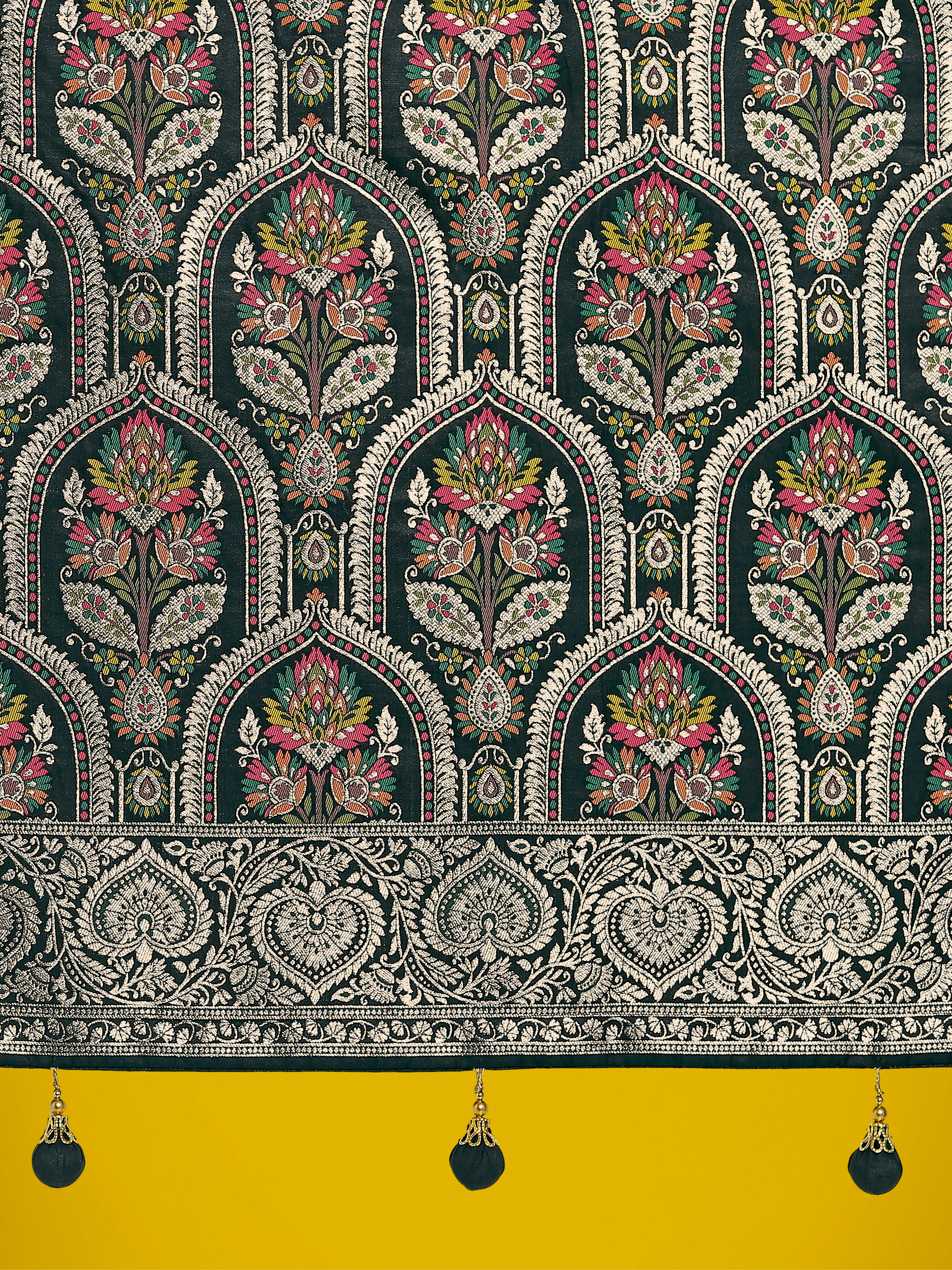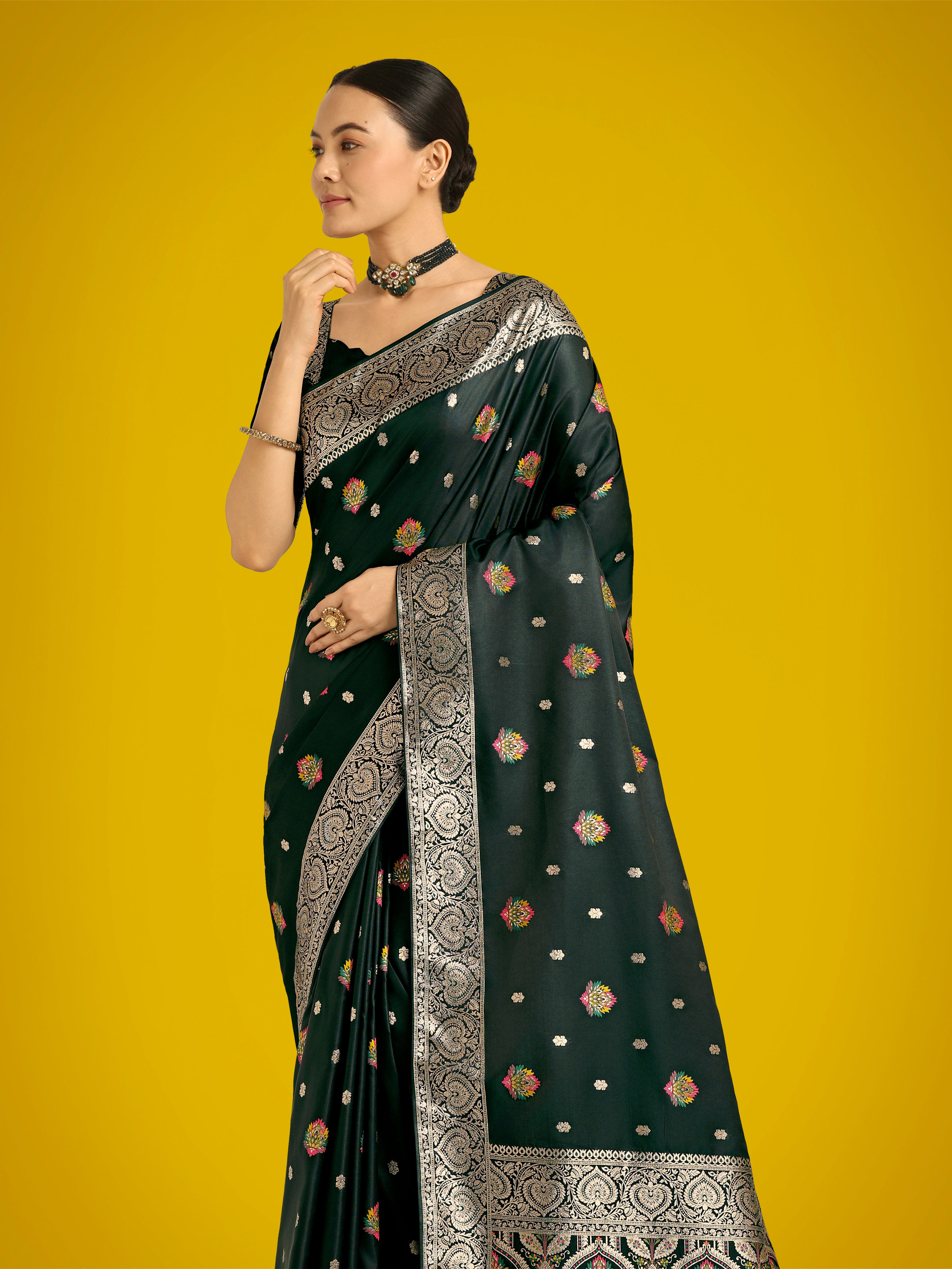 This pretty piece is a fairy tale that begins to unfold as you reveal your beauty in it. We unfurl our the intricacy and exclusivity of our creations highlighted in this lovely Dark Green banarasi satin silk contemporary saree. The brilliant attire creates a dramatic canvas with amazing zari woven work. Comes with matching blouse. (Slight variation in color, fabric & work is possible. Model images are only representative.)