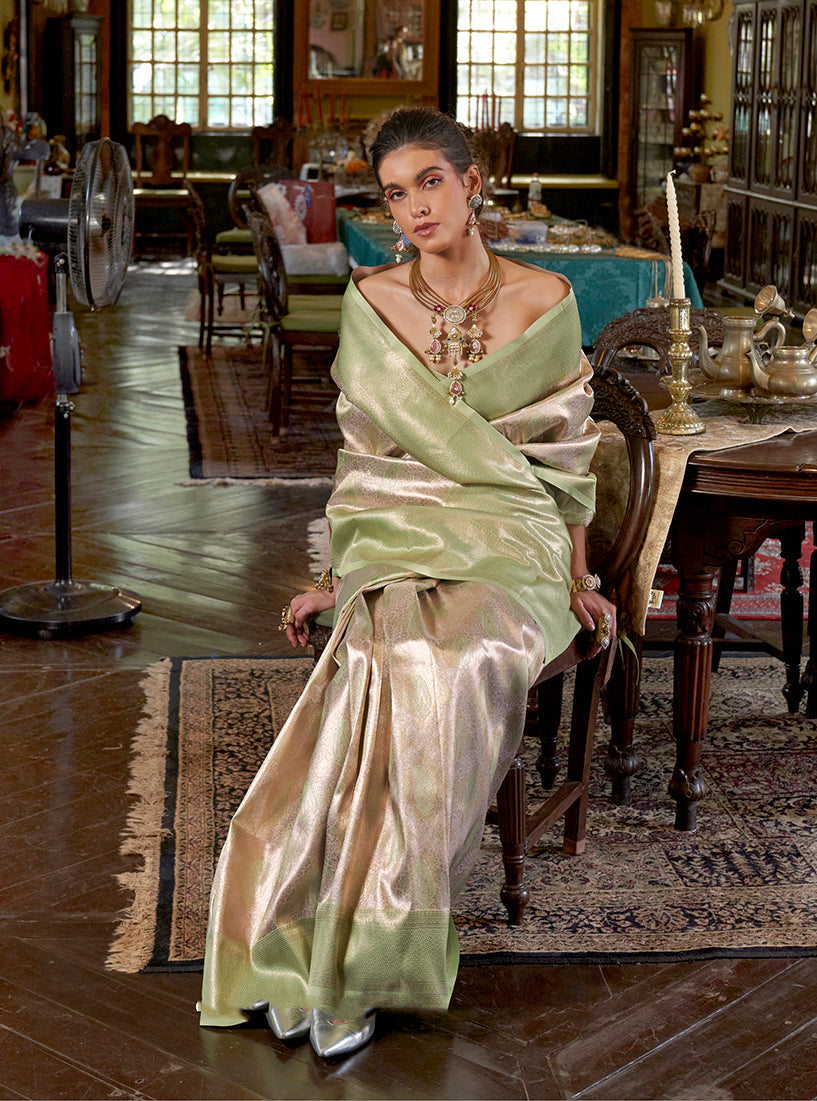 Add grace and charm for your appearance in this appealing light green kanjivaram silk blend classic saree. The ethnic woven work to the dress adds a sign of attractiveness statement with your look. Comes with matching blouse. (Slight variation in color, fabric & work is possible. Model images are only representative.)