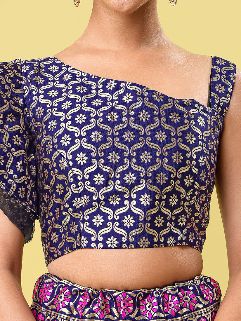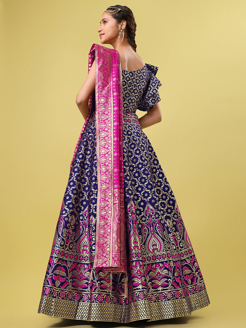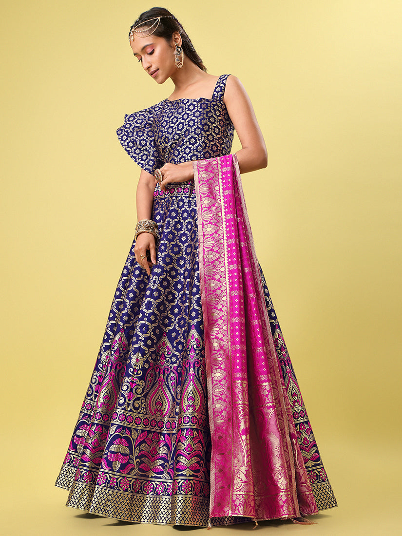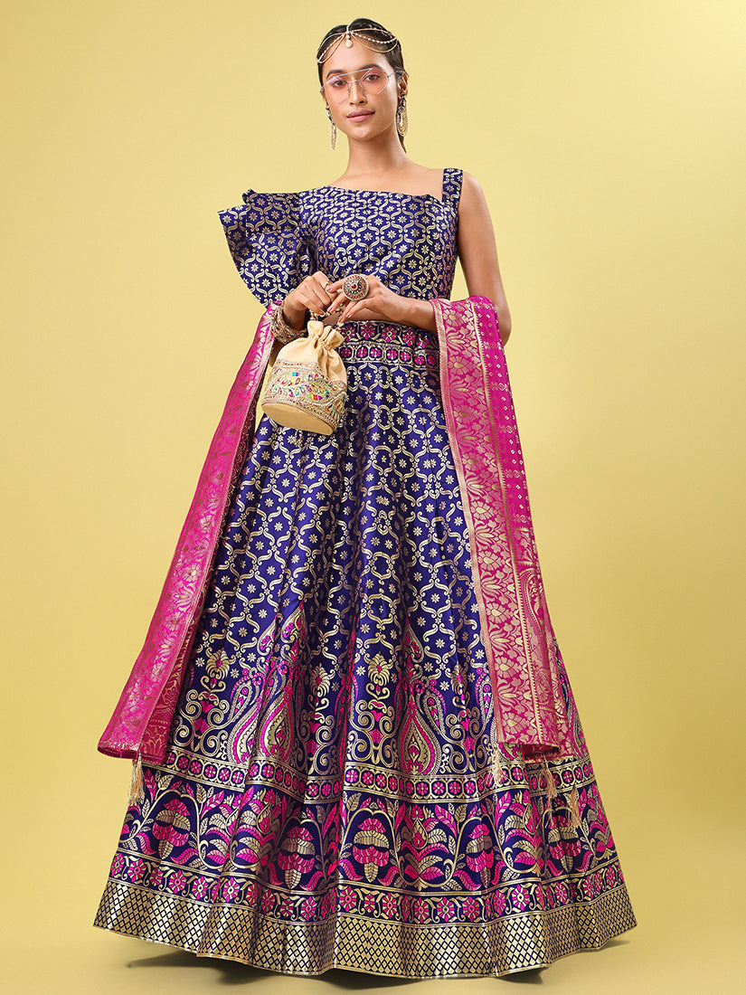 Style And Trend Would Be At The Peak Of Your Magnificence The Moment You Attire This Navy Blue Color Jacquard Lehenga Choli. Beautified With Zari Woven Work All Synchronized Very Well Through The Design And Design Of The Dress. Comes With Matching Jacquard Choli And Jacquard Dupatta. The Stitched Lehenga, Unstitched Choli Bust Size Can Be Customized From 34 To 42 Inches.