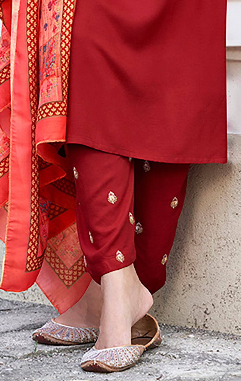 Make the heads turn whenever you costume up in this Red Rayon designer salwar kameez. The floral sequence work appears chic and fantastic for festival and party. Comes with matching bottom and dupatta.