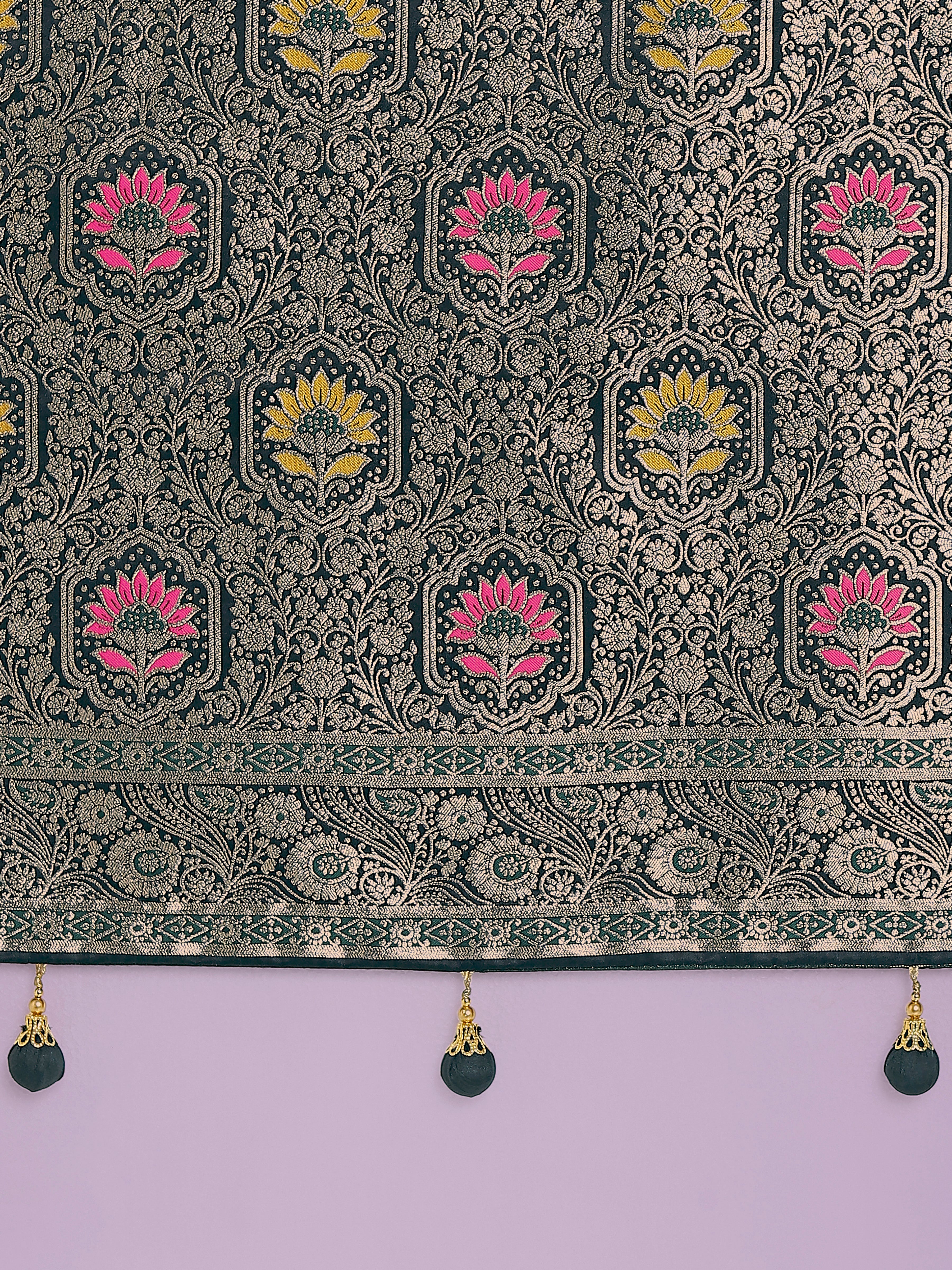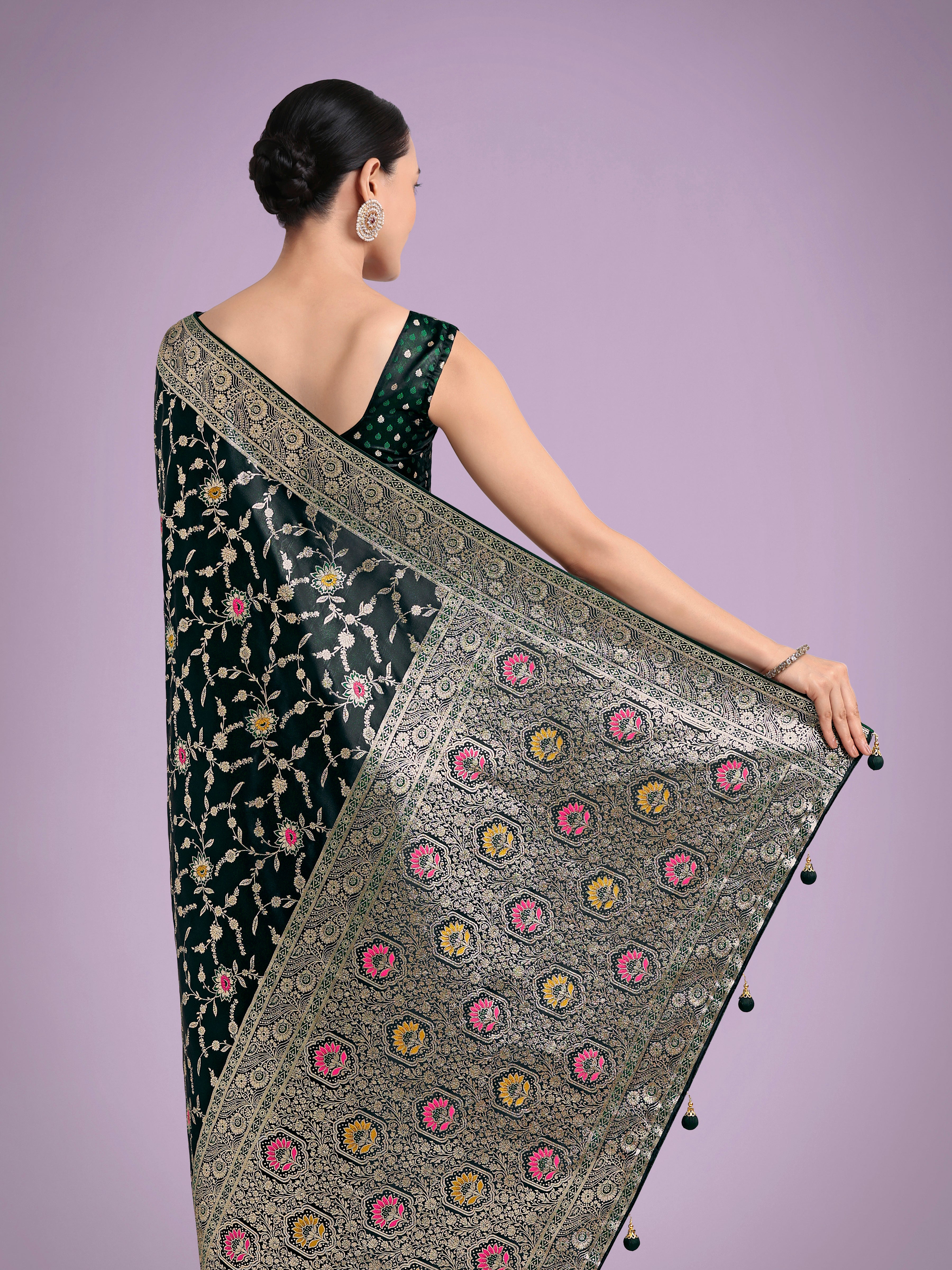 This brilliant array will make you the ultimate classic beauty at the next event you attend. Look ethnic in this affluent Dark Green Banarasi satin silktraditional saree. Beautified and stylized with border, fancy, weaving work and lace work to give you an attractive look. Comes with matching blouse. (Slight variation in color, fabric & work is possible. Model images are only representative.)