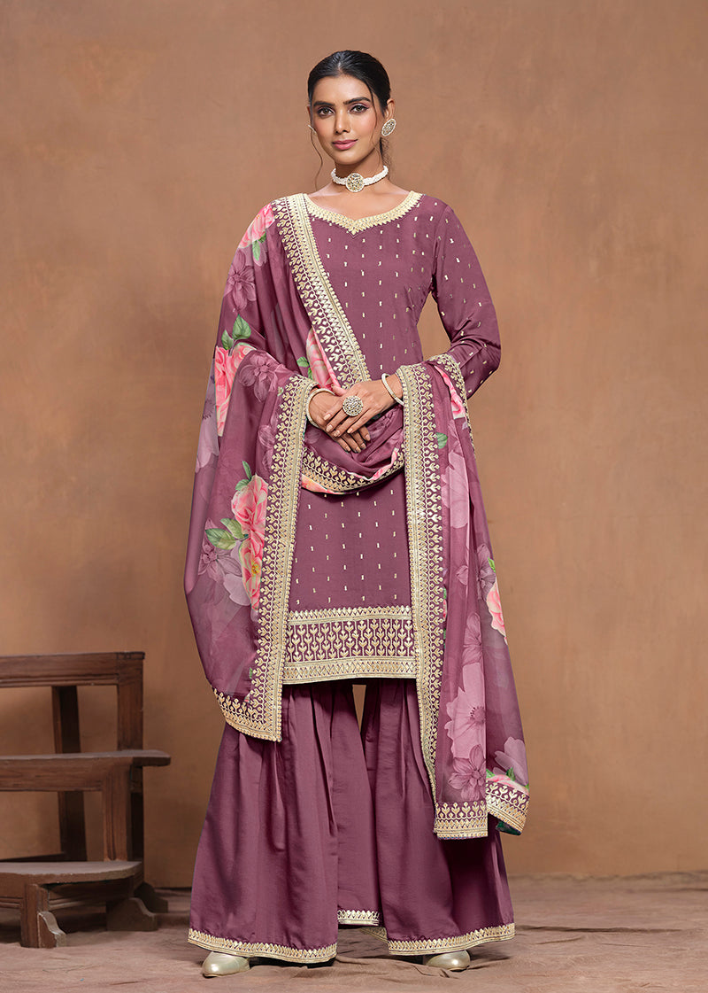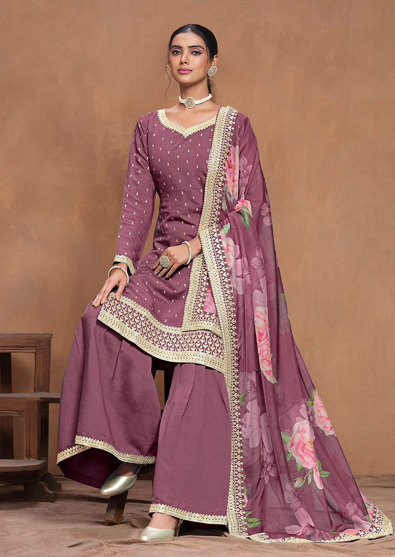Vogue and trend could be on the peak of your elegance the moment you attire this dark mauve silk palazzo salwar kameez. The desirable embroidered work a substantial attribute of this attire. Comes with matching bottom and dupatta.