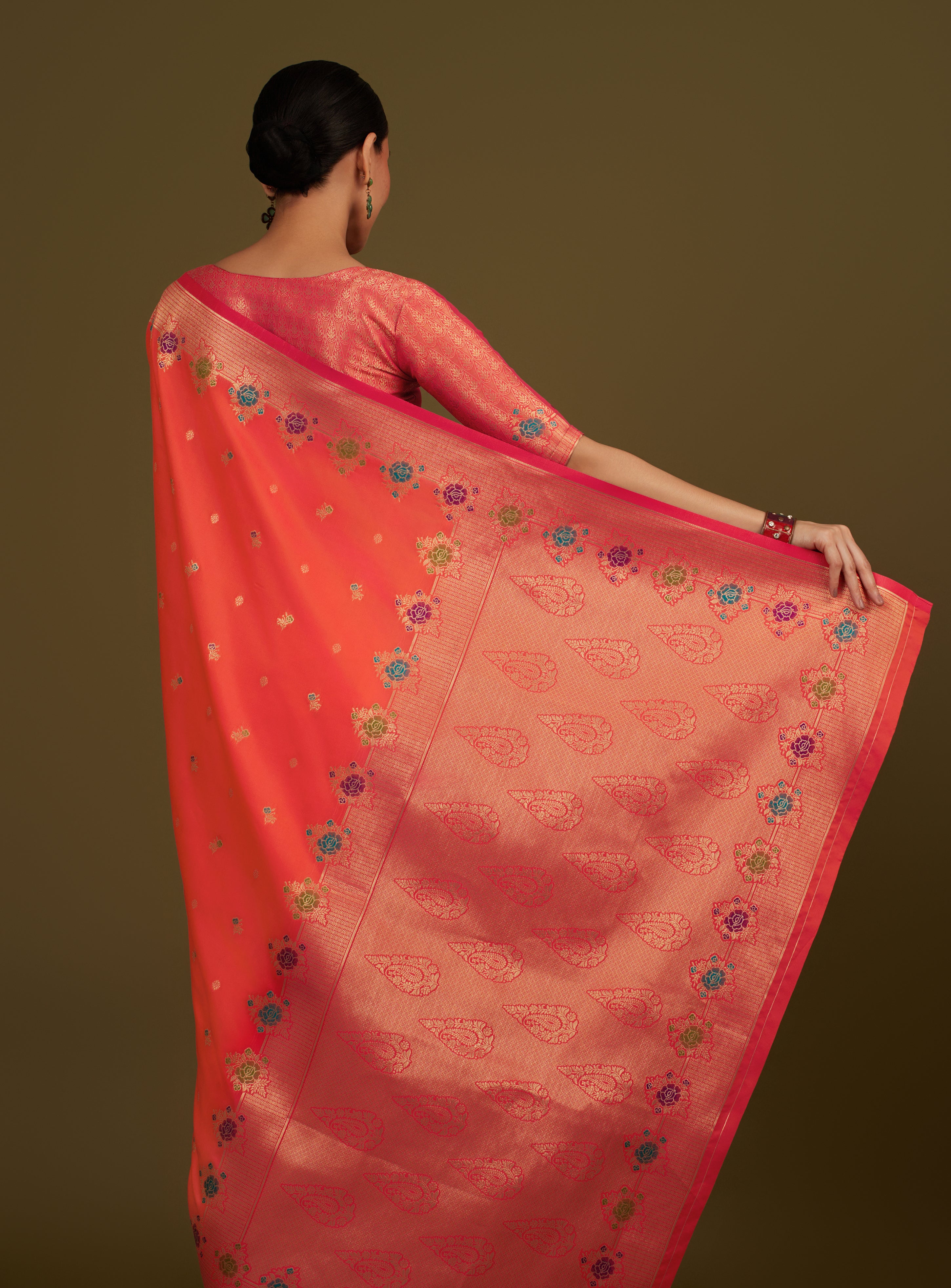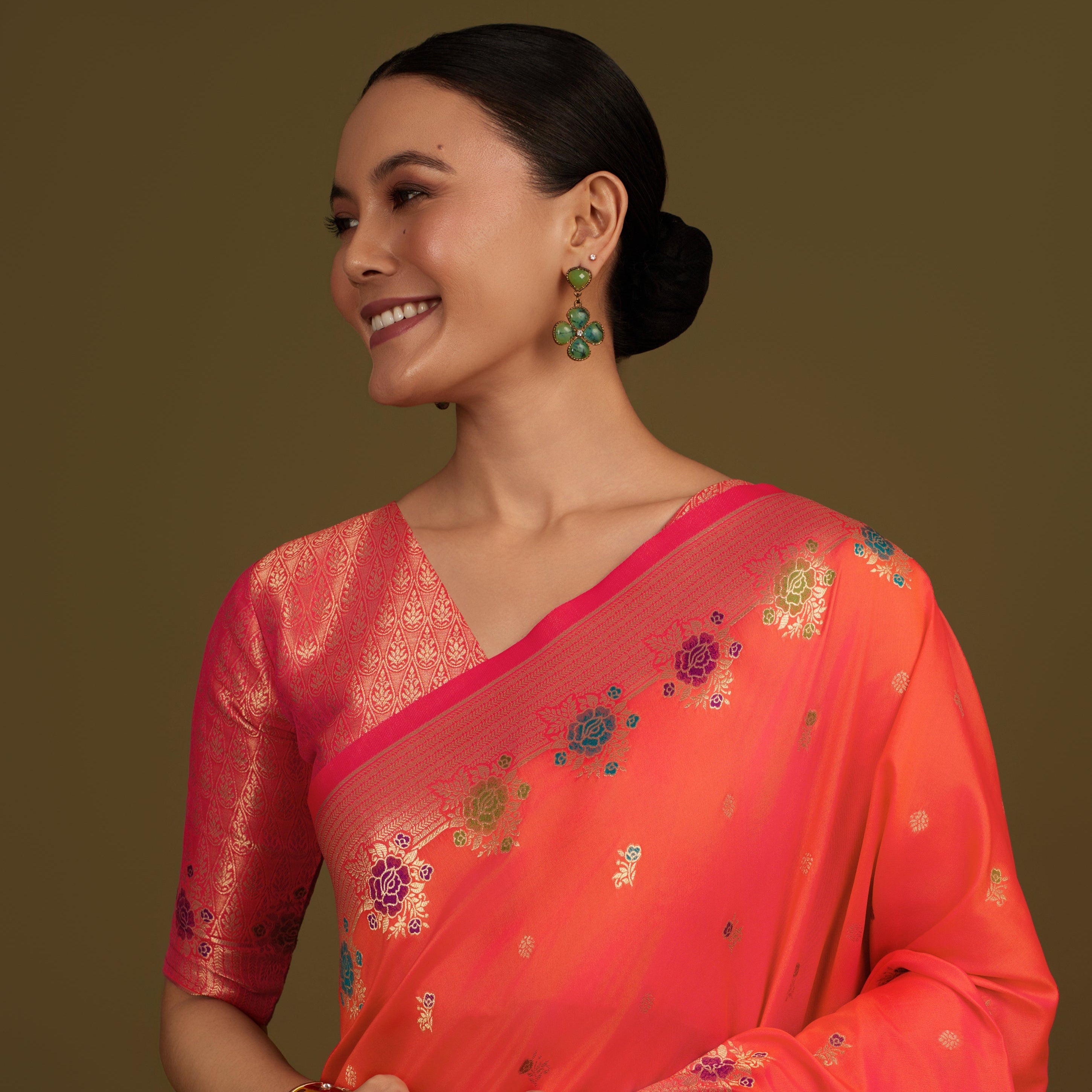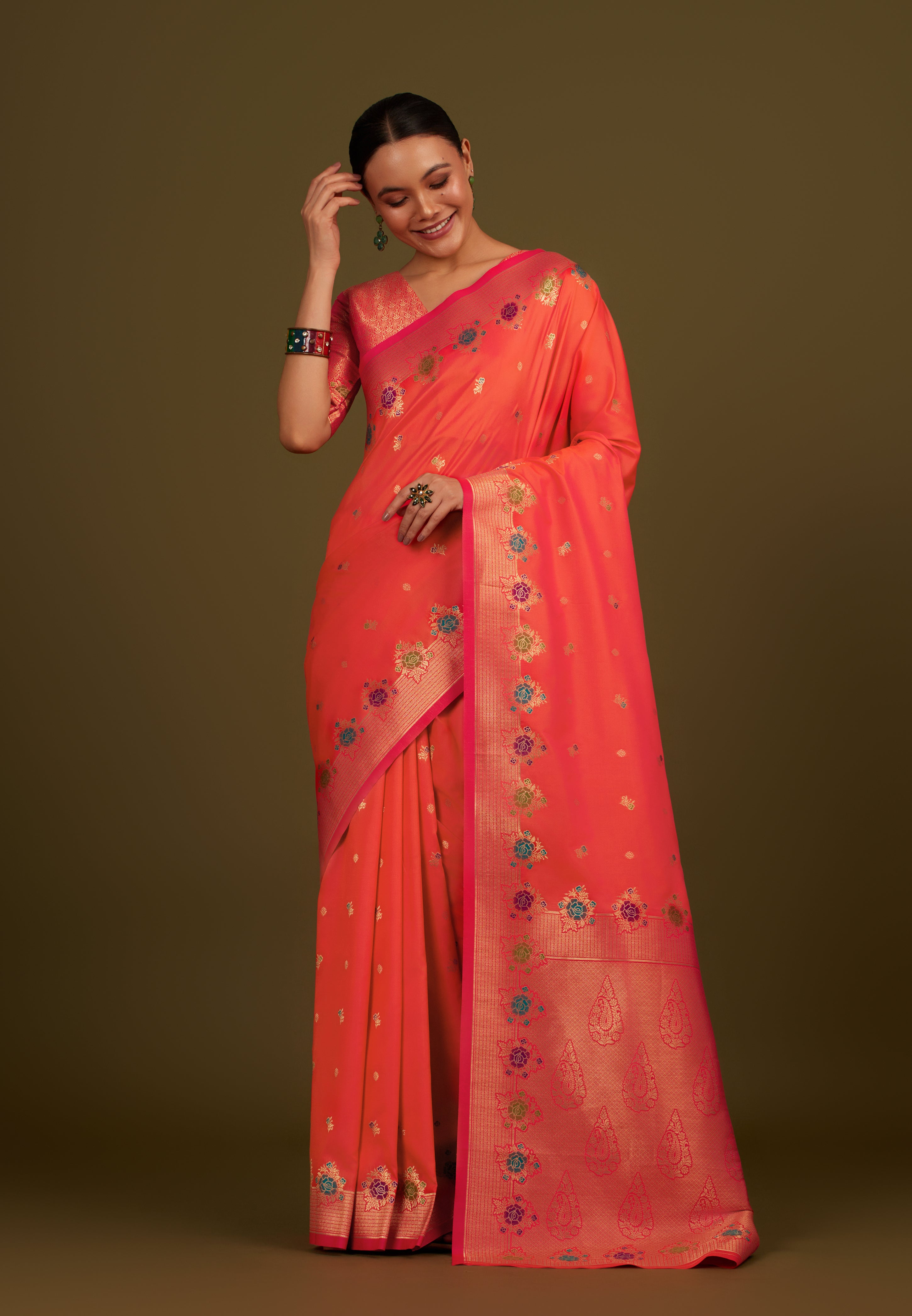 Be an angel and create and ascertain a smashing effect on anybody by carrying this Dark Peach Color silk contemporary saree. The fancy, weaving and zari work seems chic and fantastic for any occasion. Comes with matching blouse. (Slight variation in color, fabric & work is possible. Model images are only representative.)
