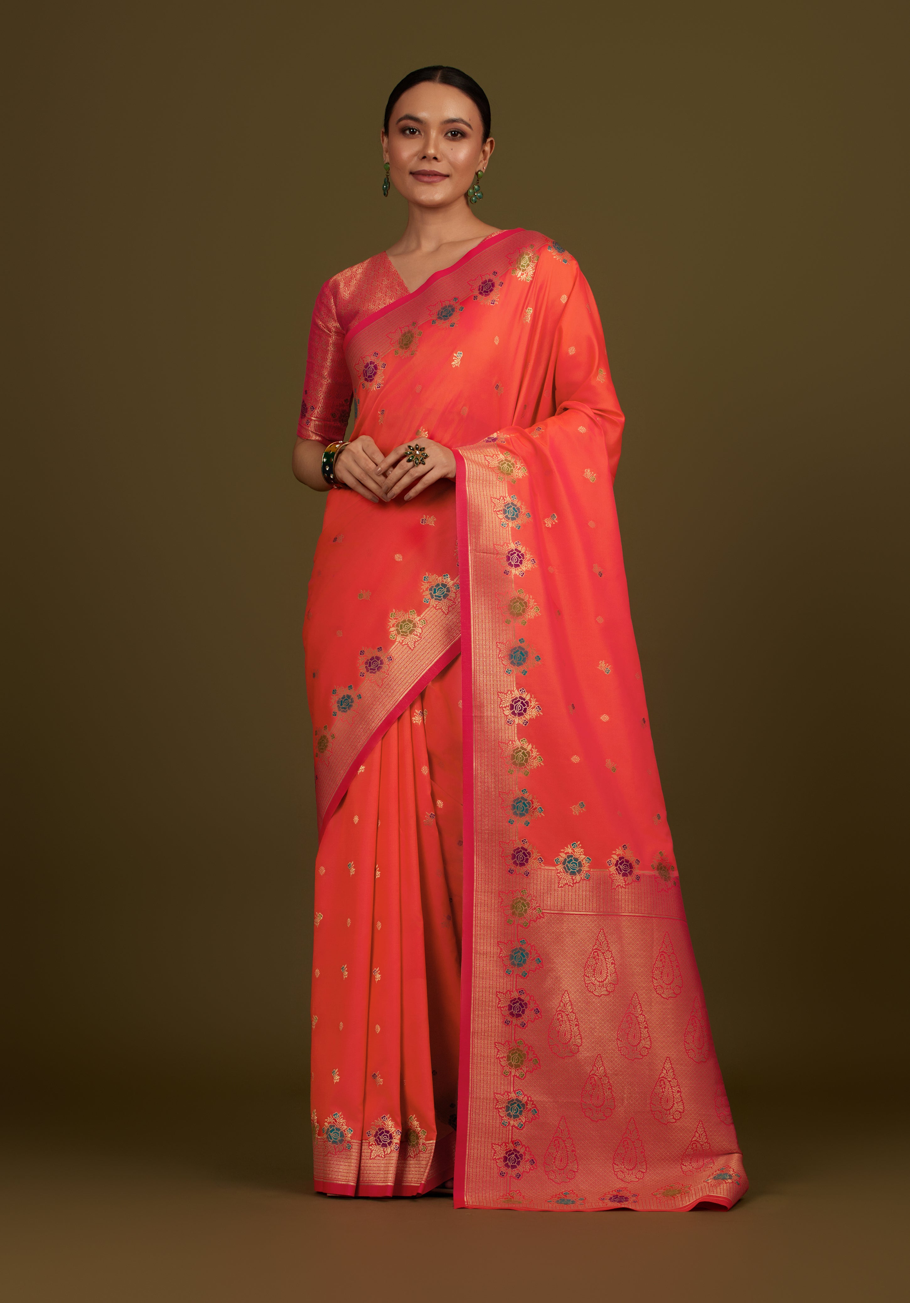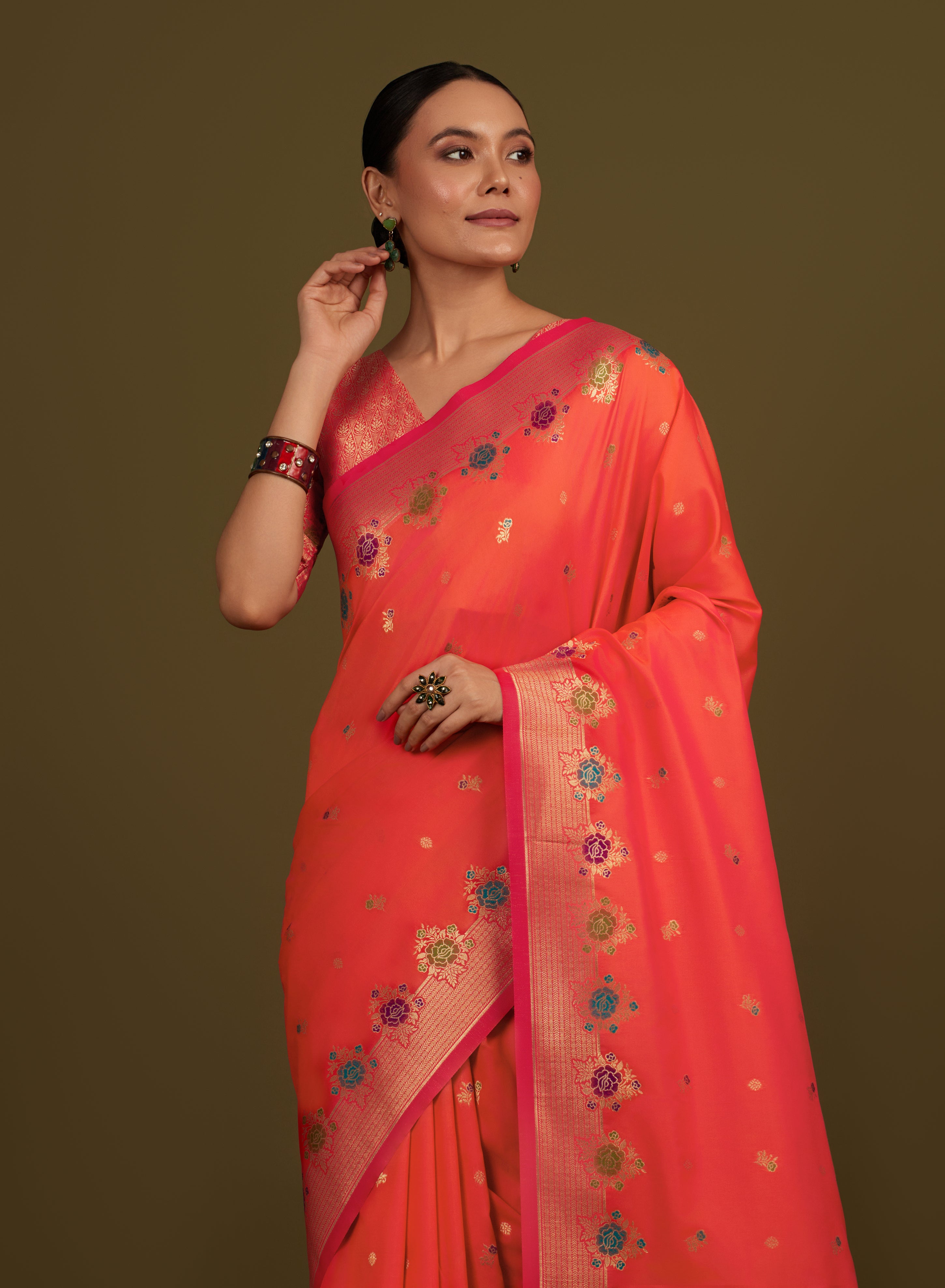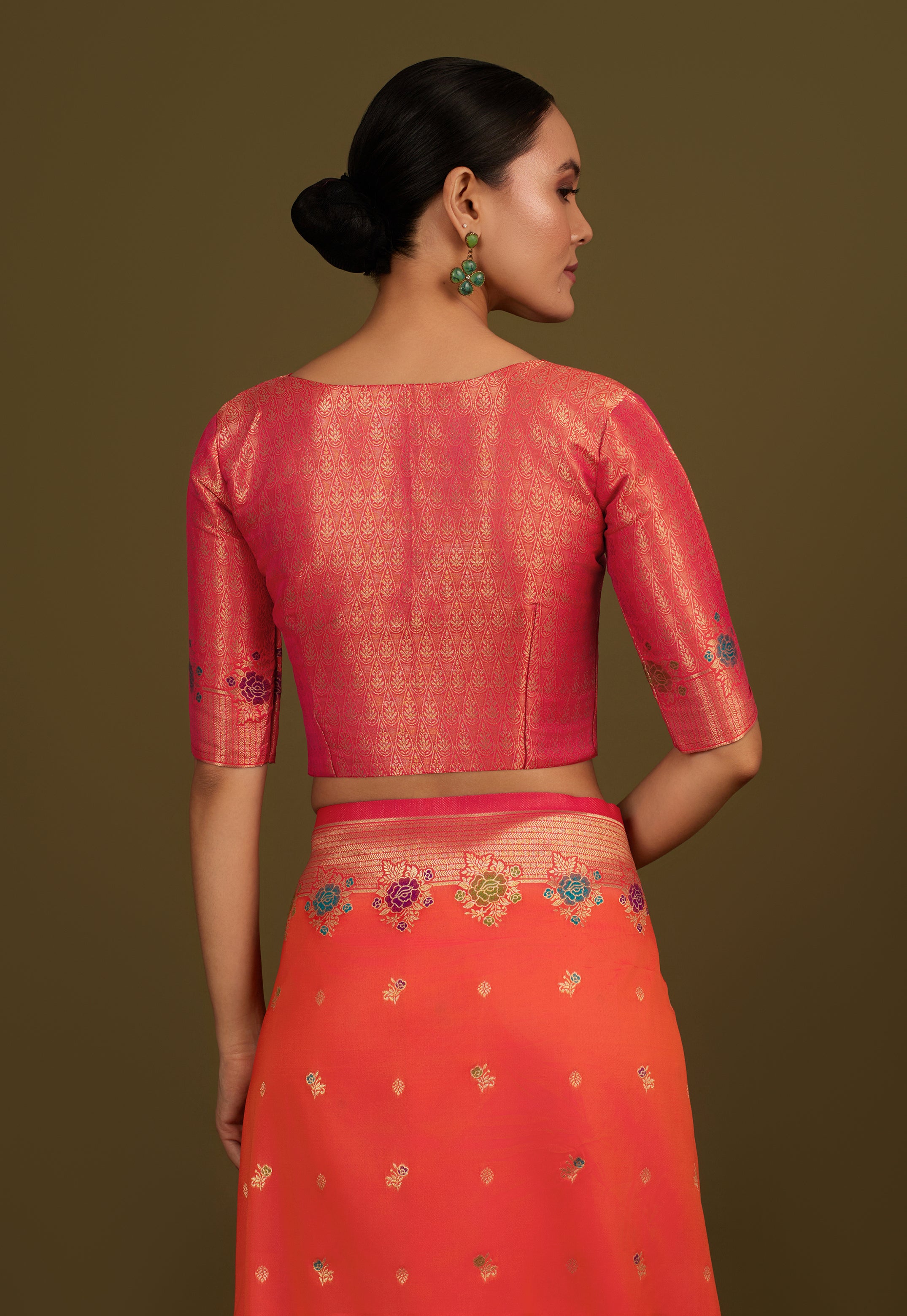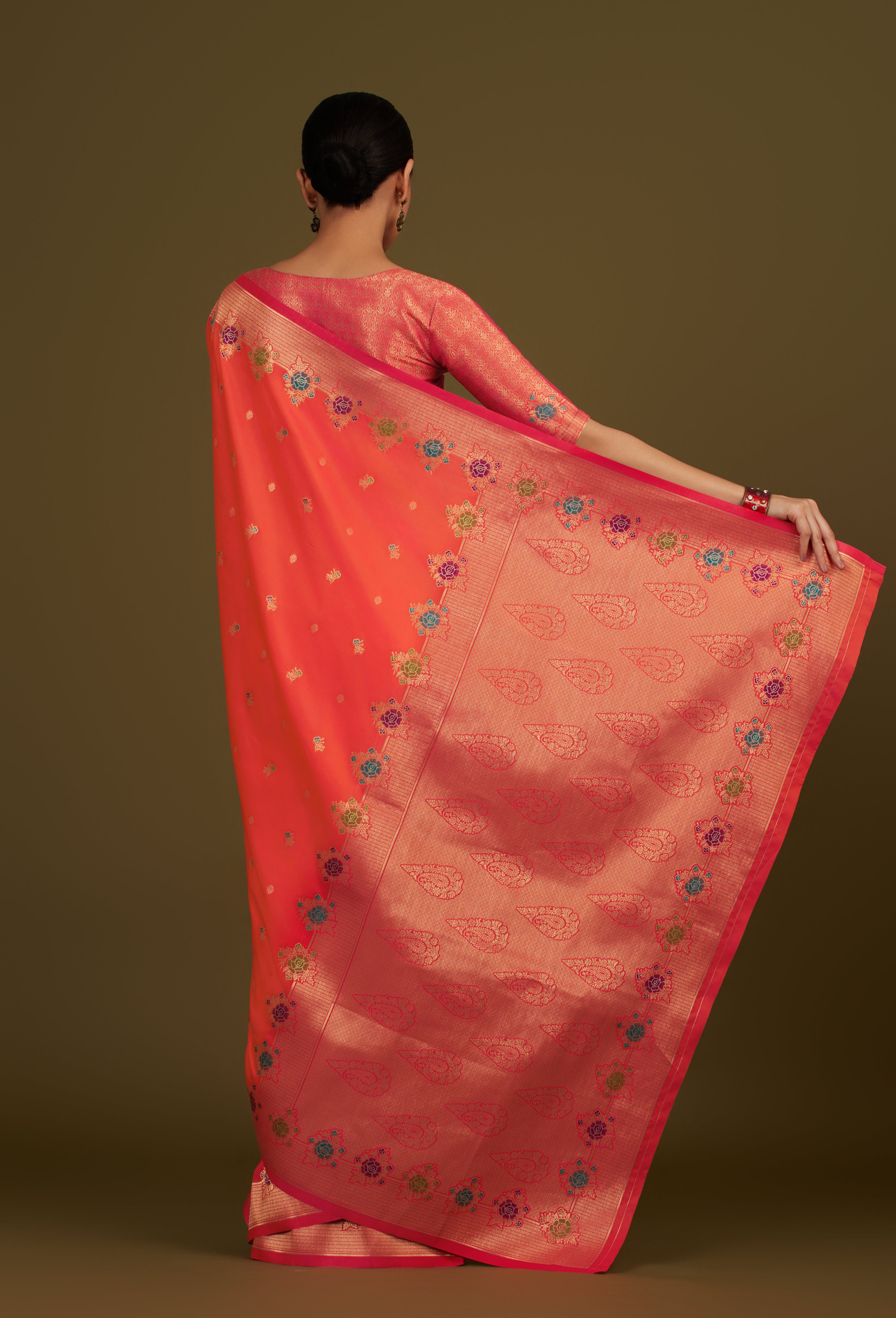 Be an angel and create and ascertain a smashing effect on anybody by carrying this Dark Peach Color silk contemporary saree. The fancy, weaving and zari work seems chic and fantastic for any occasion. Comes with matching blouse. (Slight variation in color, fabric & work is possible. Model images are only representative.)