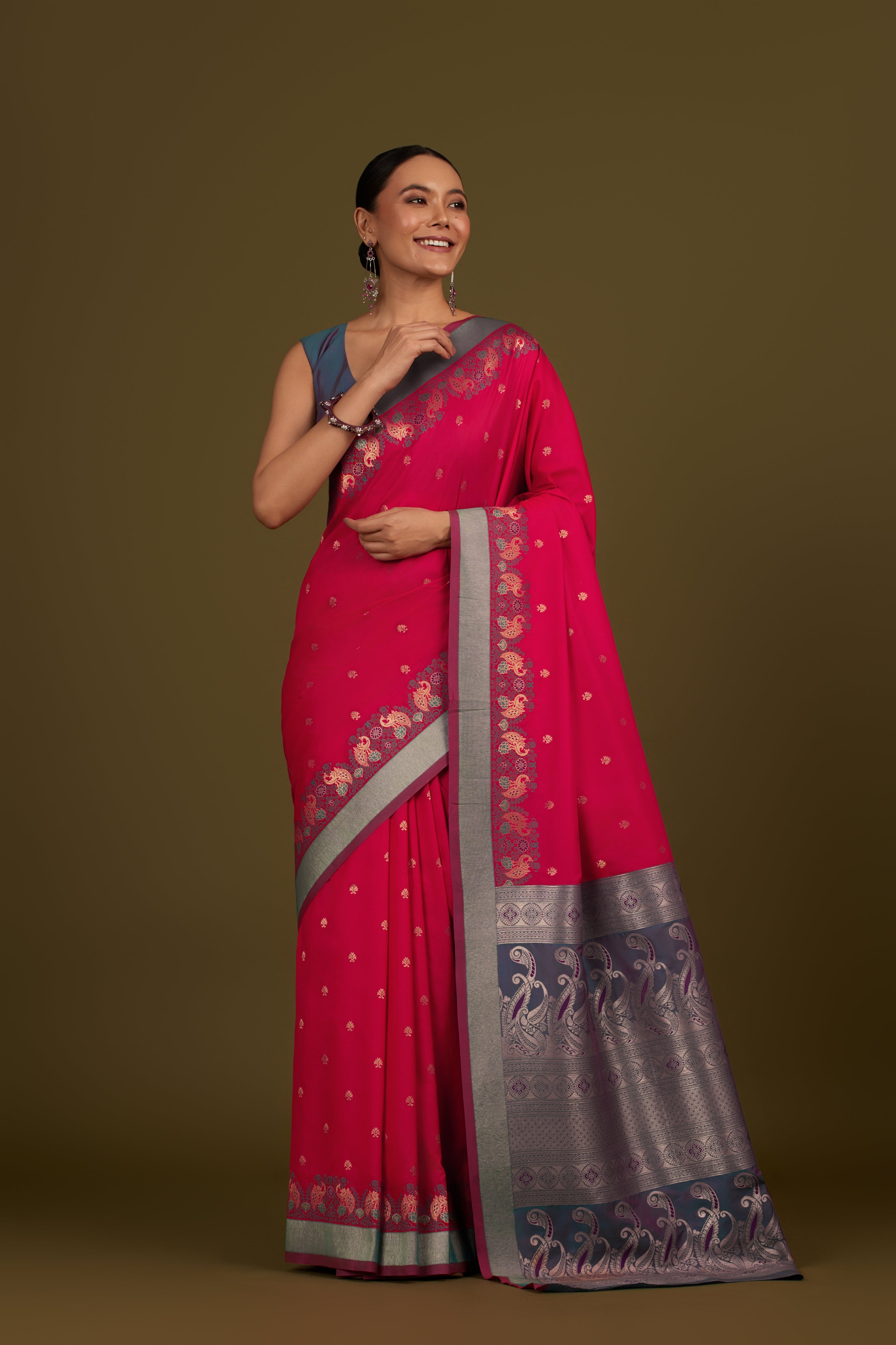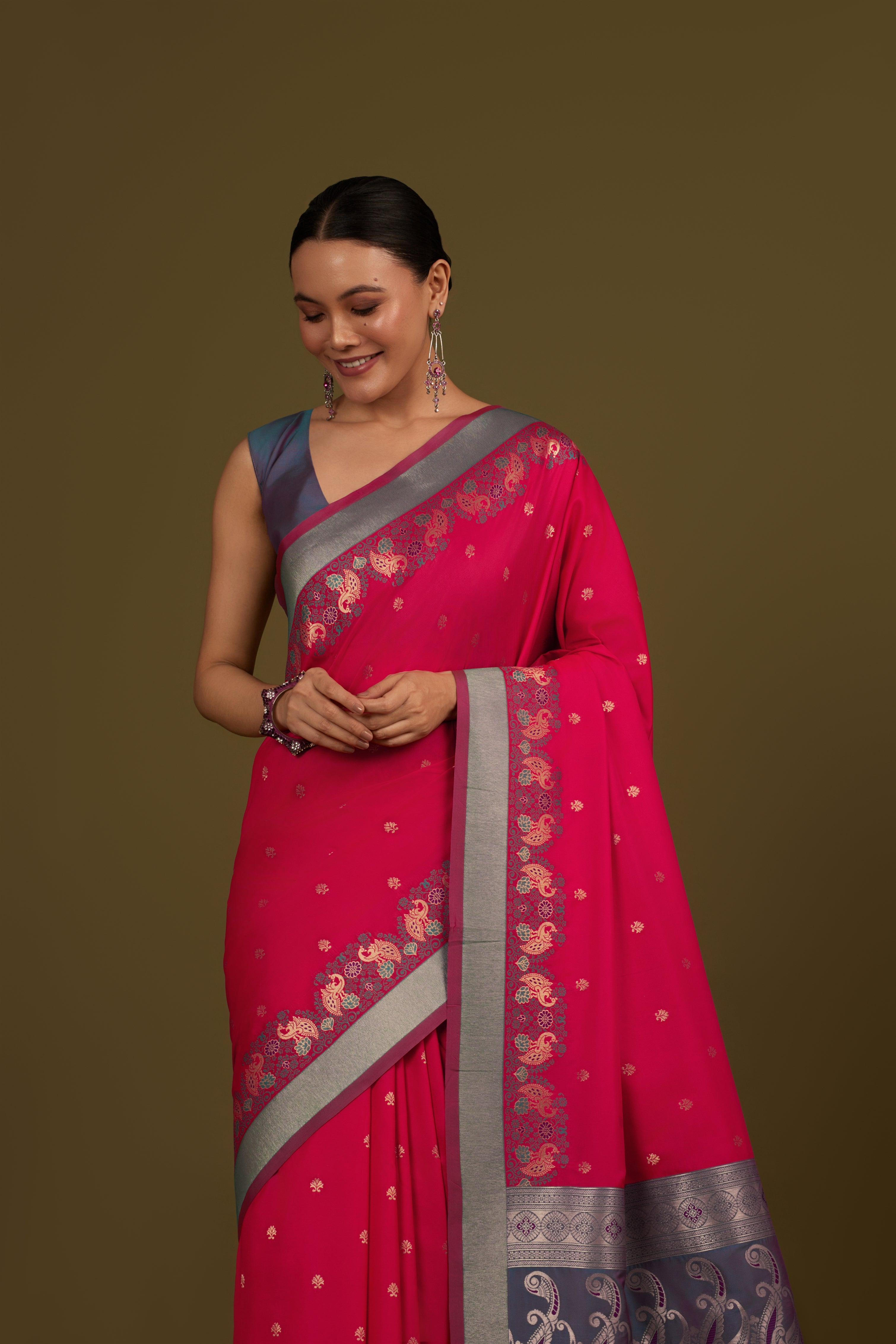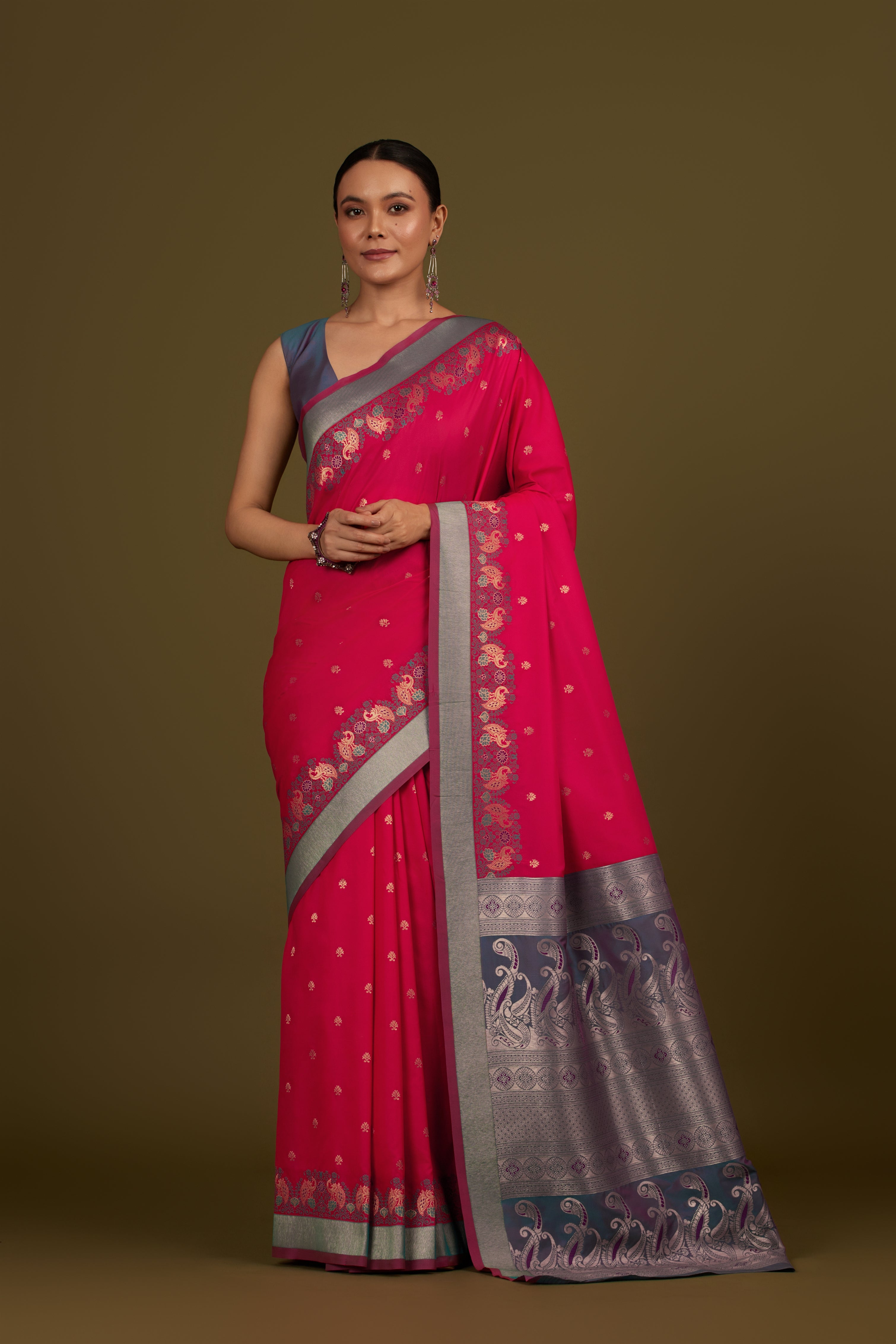 Dark Pink Banarasi Silk Blend Saree, Featuring A Graceful Paisley Pattern That Is Intricately Woven With Shimmering Zari. The Saree Is Enhanced By A Rich Contrast Pallu, Adding An Exquisite Touch Of Color And Contrast.