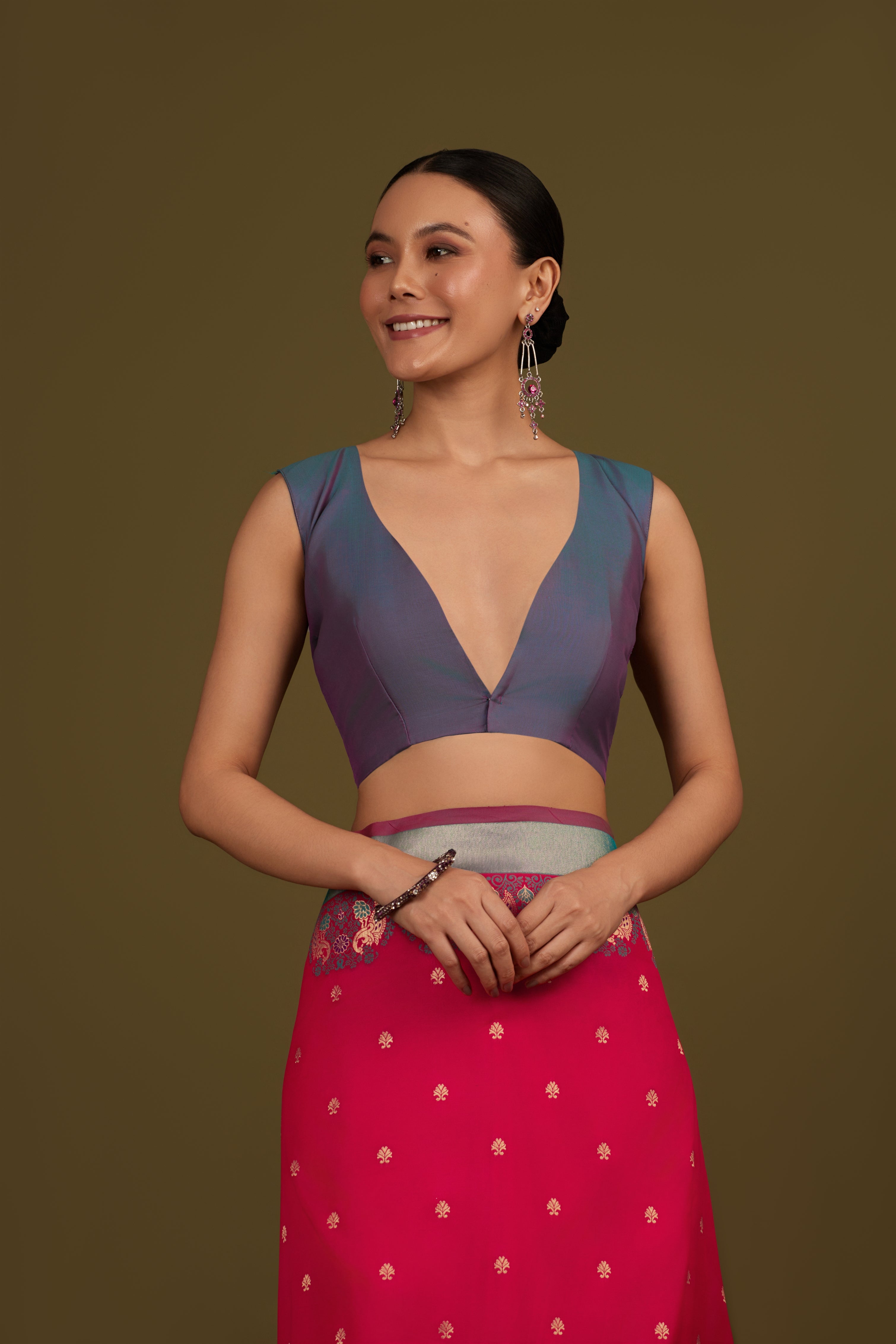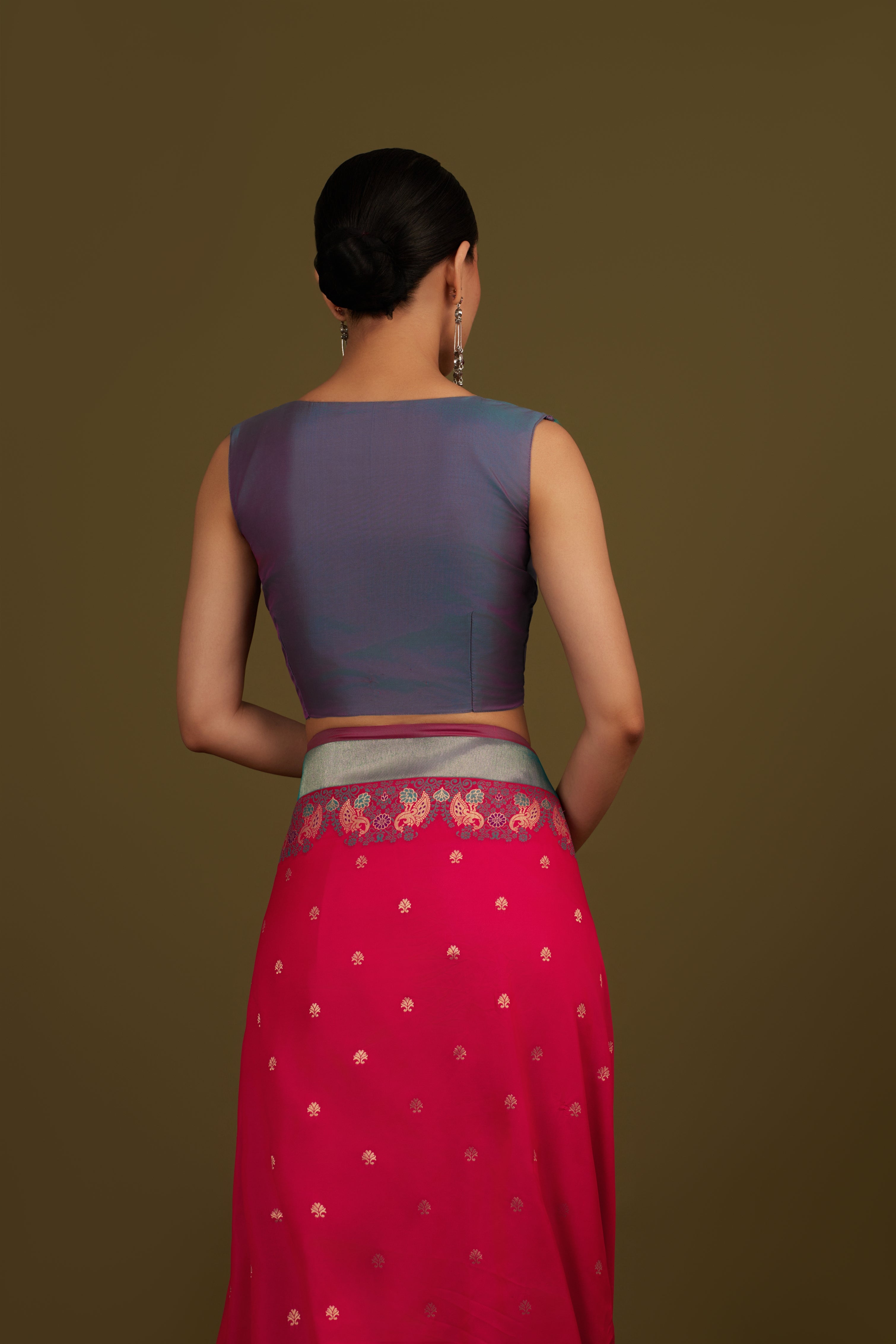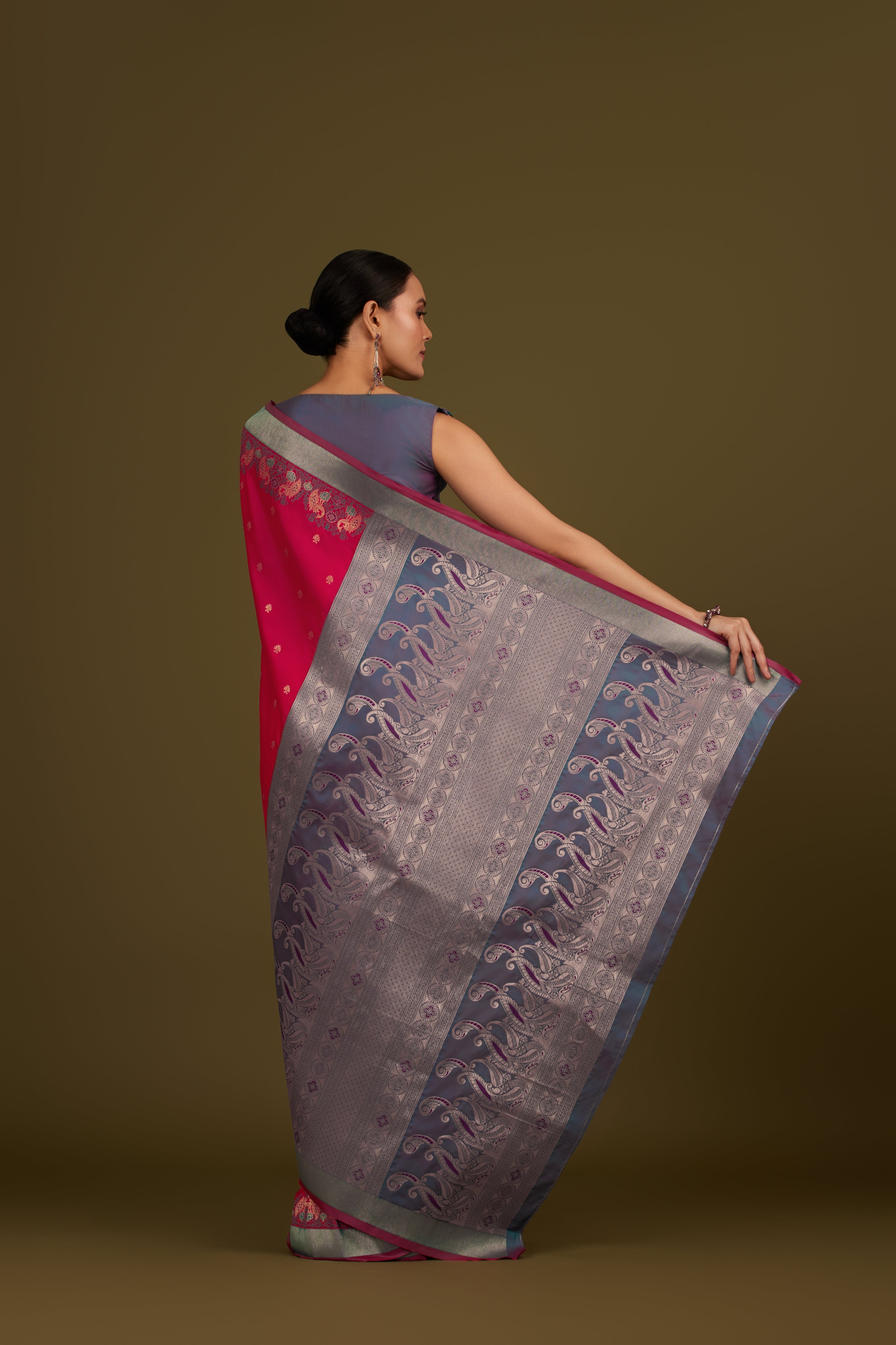 Dark Pink Banarasi Silk Blend Saree, Featuring A Graceful Paisley Pattern That Is Intricately Woven With Shimmering Zari. The Saree Is Enhanced By A Rich Contrast Pallu, Adding An Exquisite Touch Of Color And Contrast.