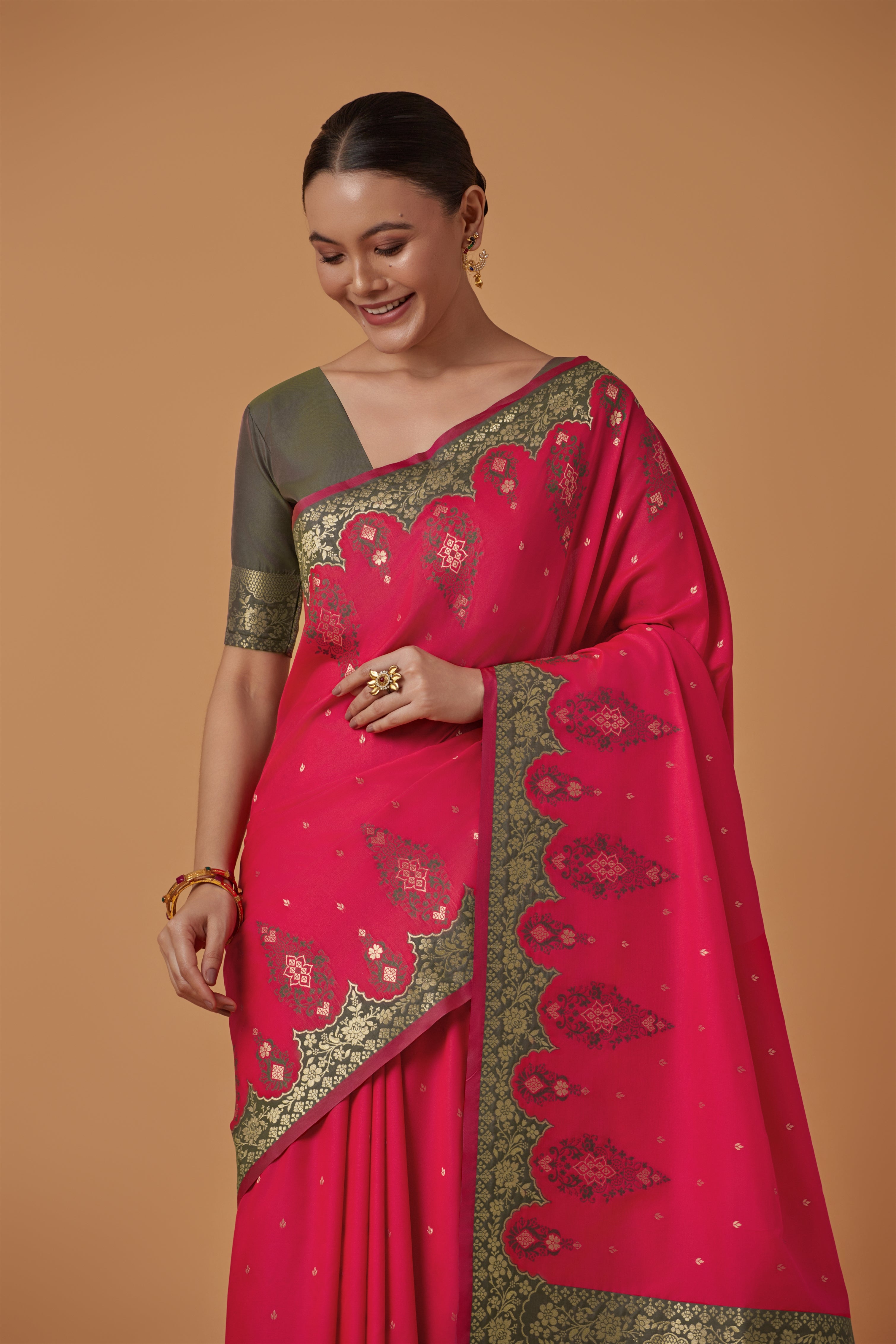 Be an angel and create and ascertain a smashing effect on anybody by carrying this Pink Color silk contemporary saree. The fancy, weaving and zari work seems chic and fantastic for any occasion. Comes with matching blouse. (Slight variation in color, fabric & work is possible. Model images are only representative.)
