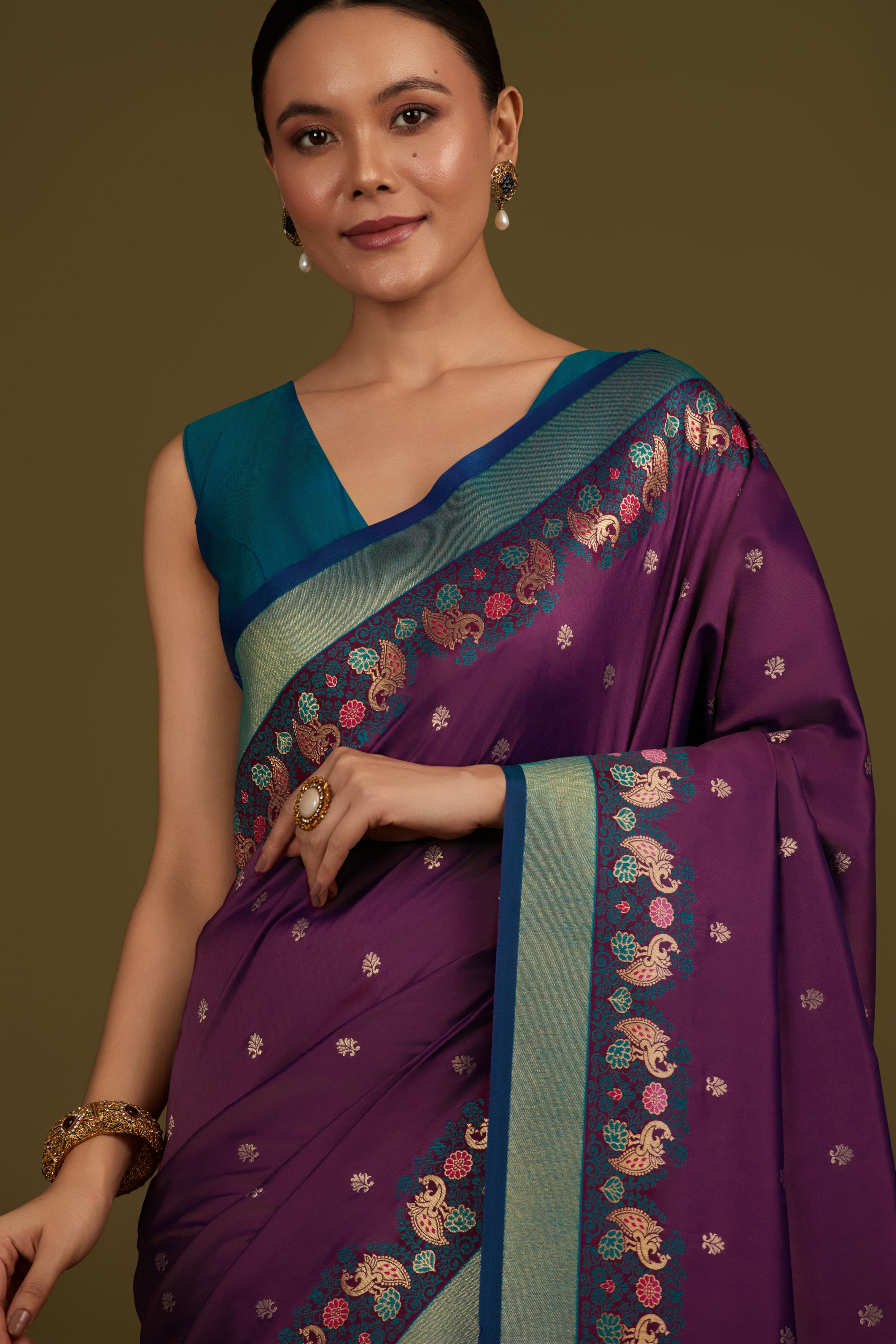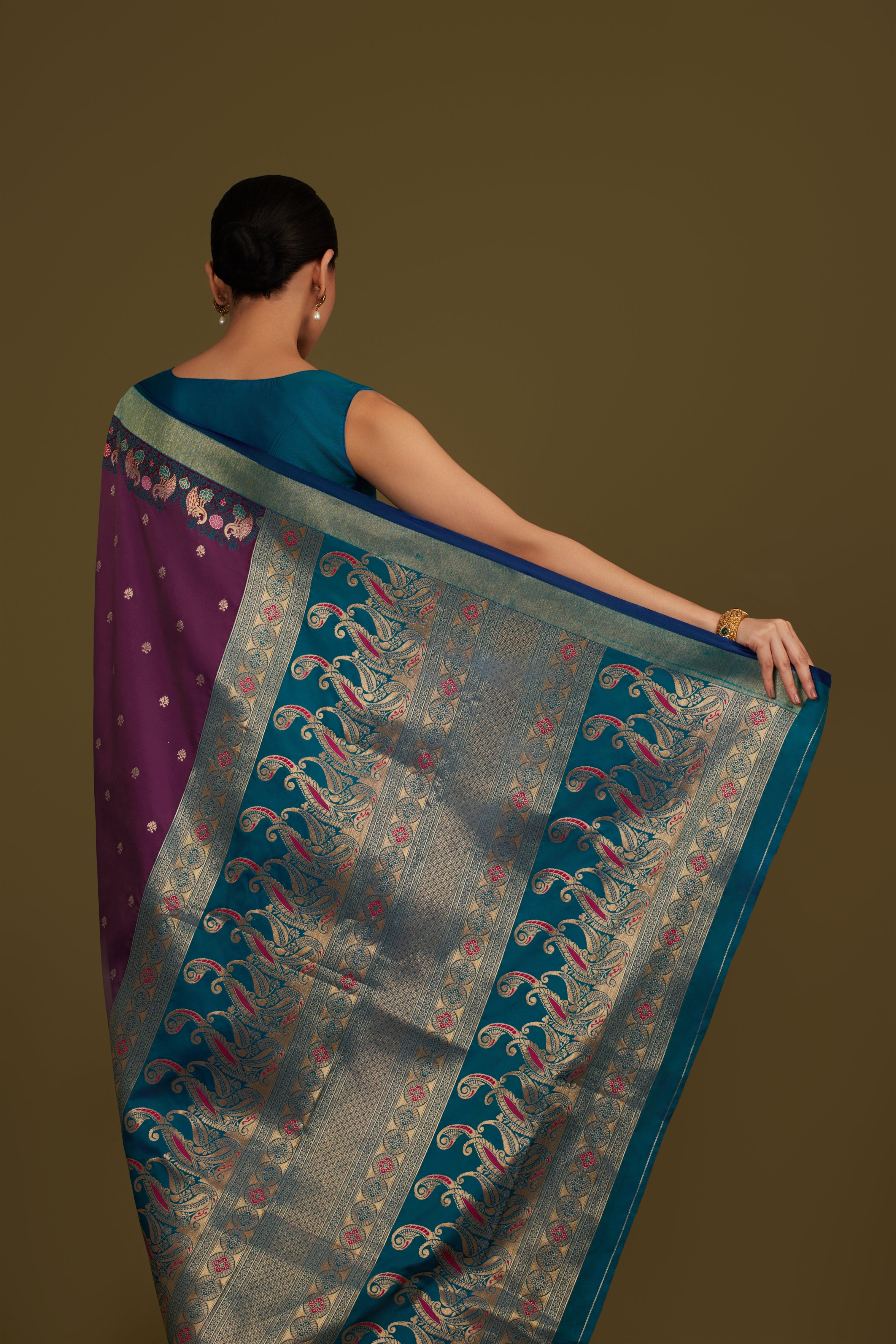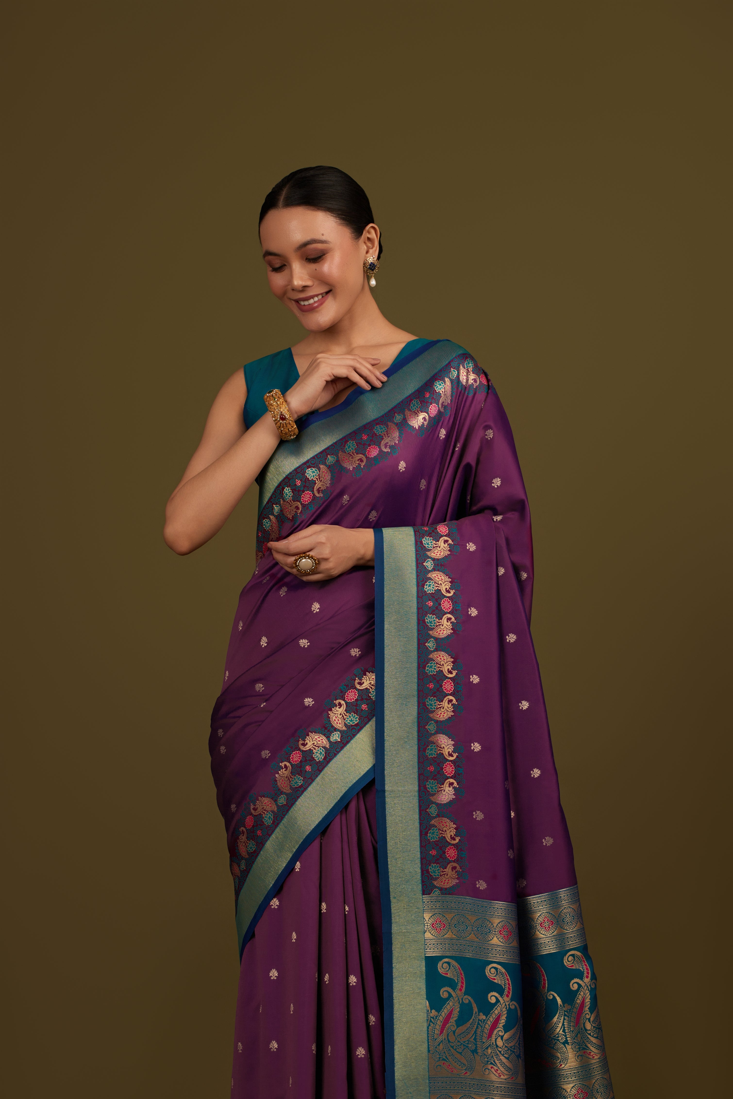 Dark Purple Banarasi Silk Blend Saree, Featuring A Graceful Paisley Pattern That Is Intricately Woven With Shimmering Zari. The Saree Is Enhanced By A Rich Contrast Pallu, Adding An Exquisite Touch Of Color And Contrast.