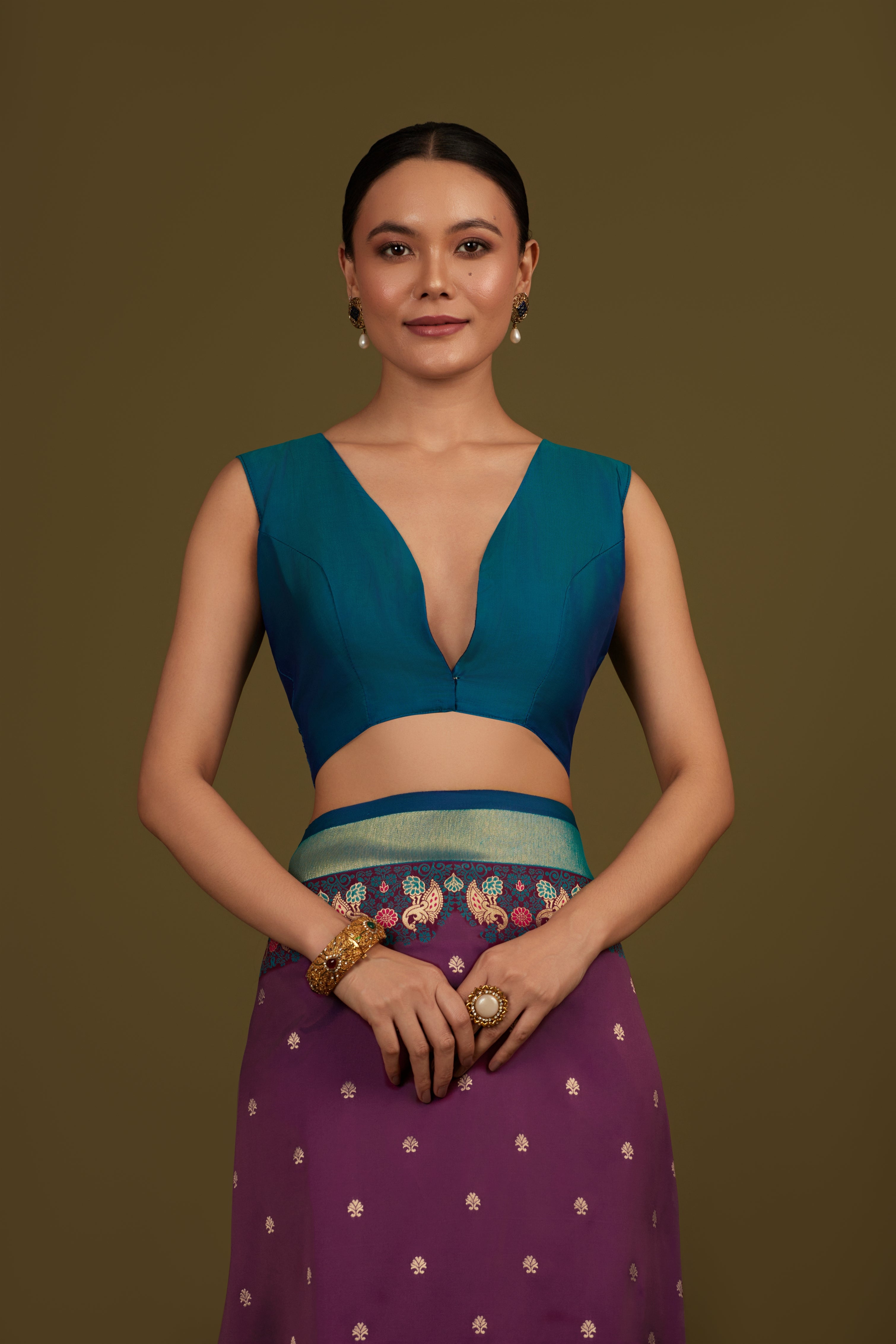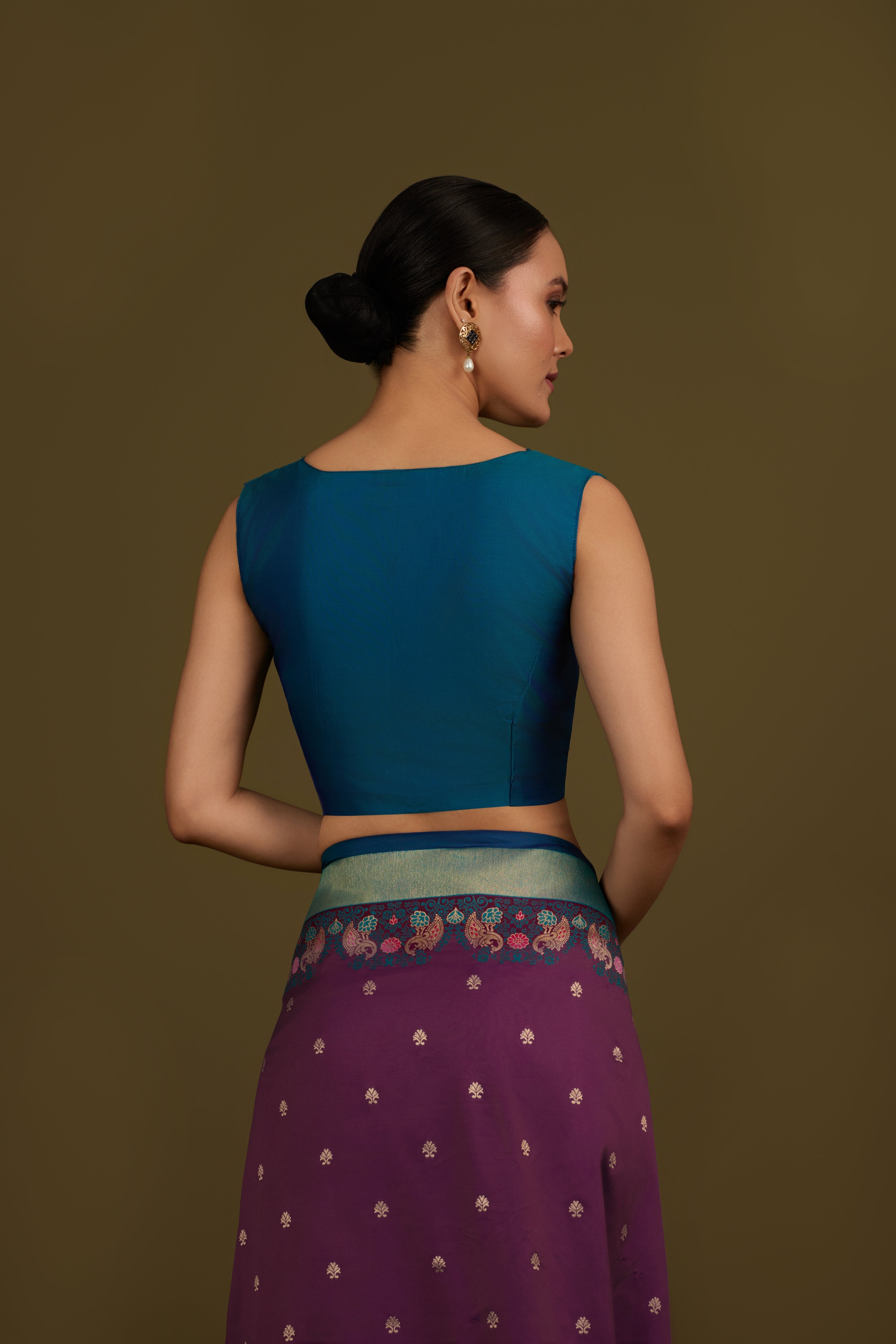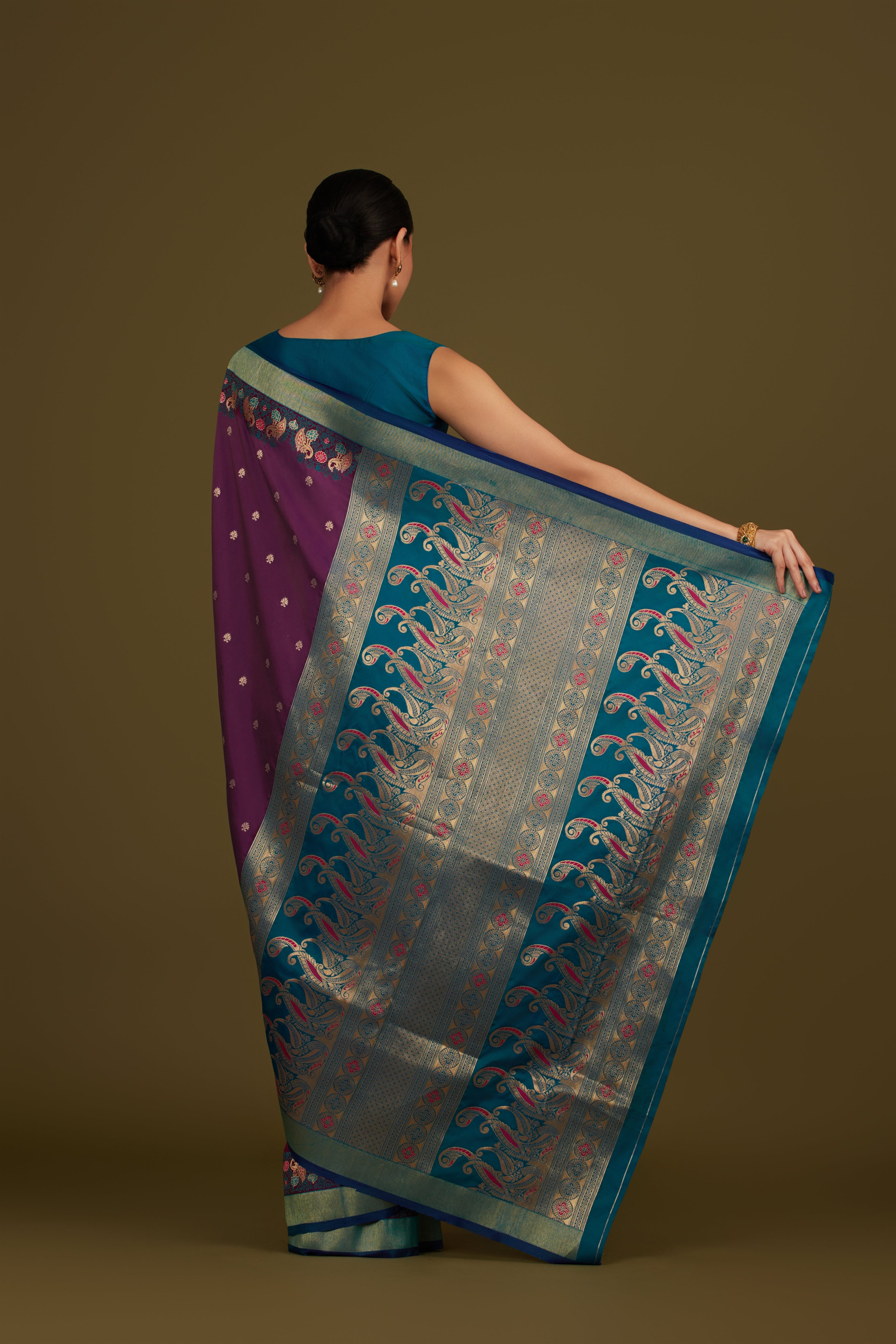 Dark Purple Banarasi Silk Blend Saree, Featuring A Graceful Paisley Pattern That Is Intricately Woven With Shimmering Zari. The Saree Is Enhanced By A Rich Contrast Pallu, Adding An Exquisite Touch Of Color And Contrast.