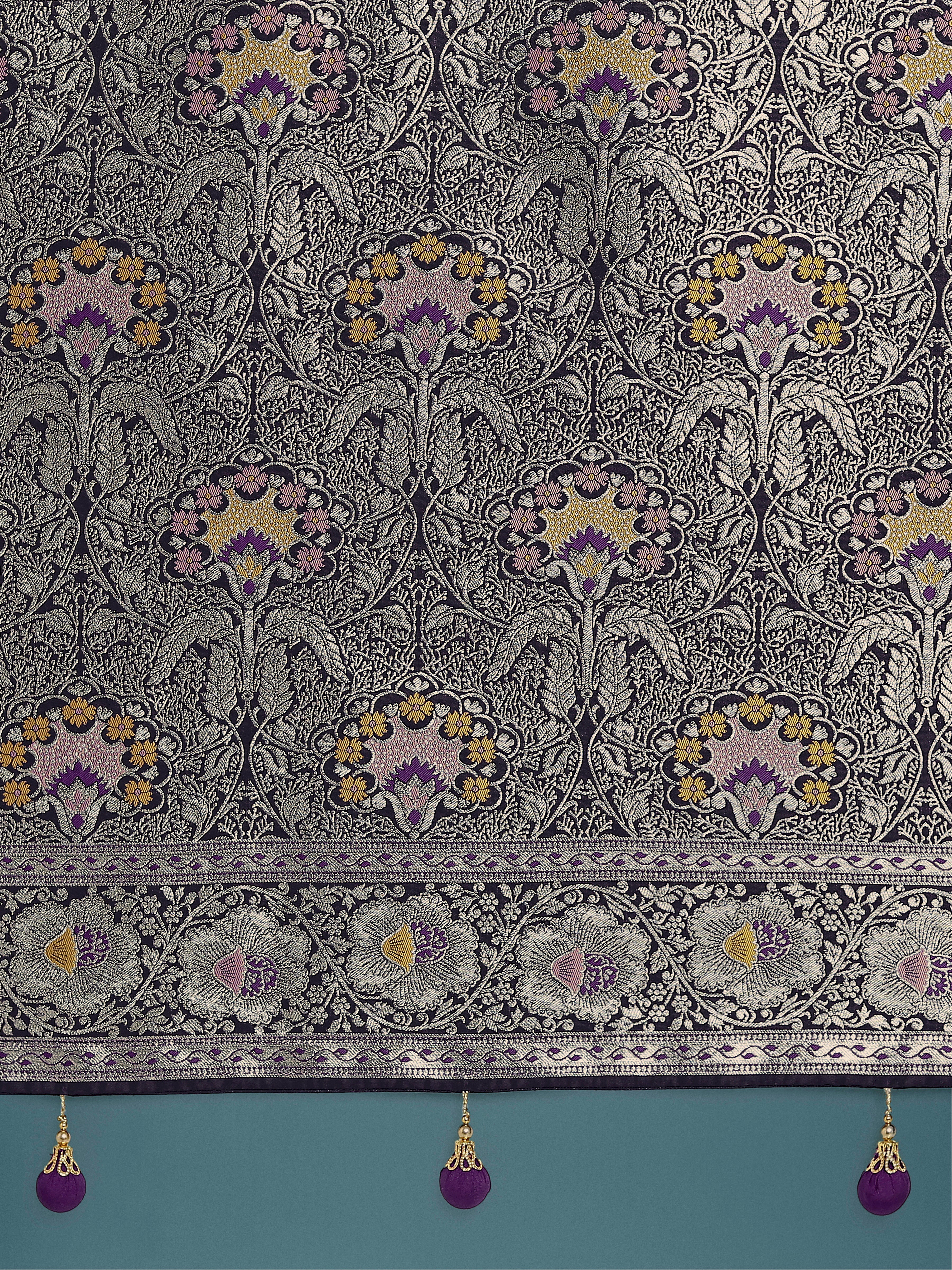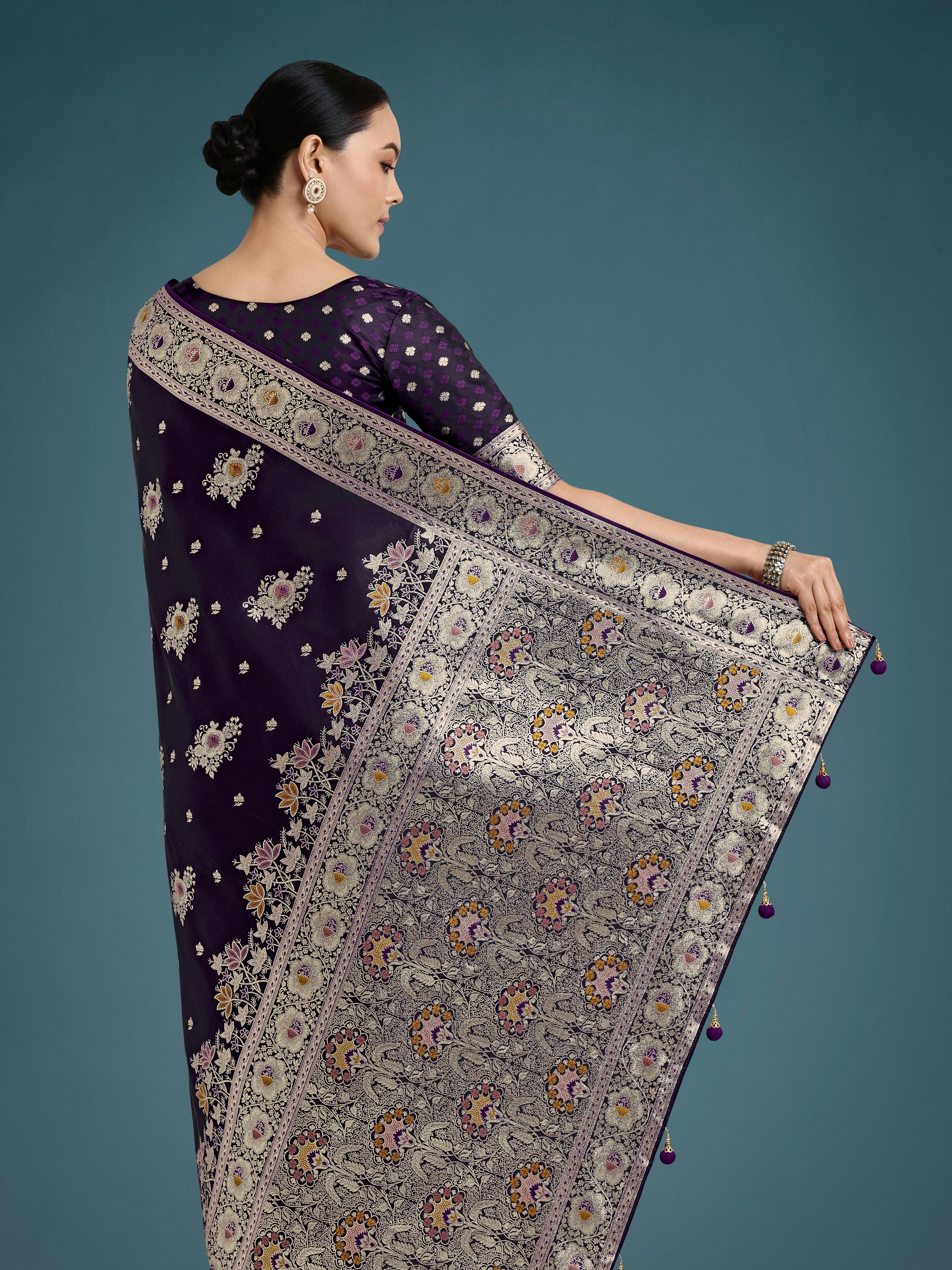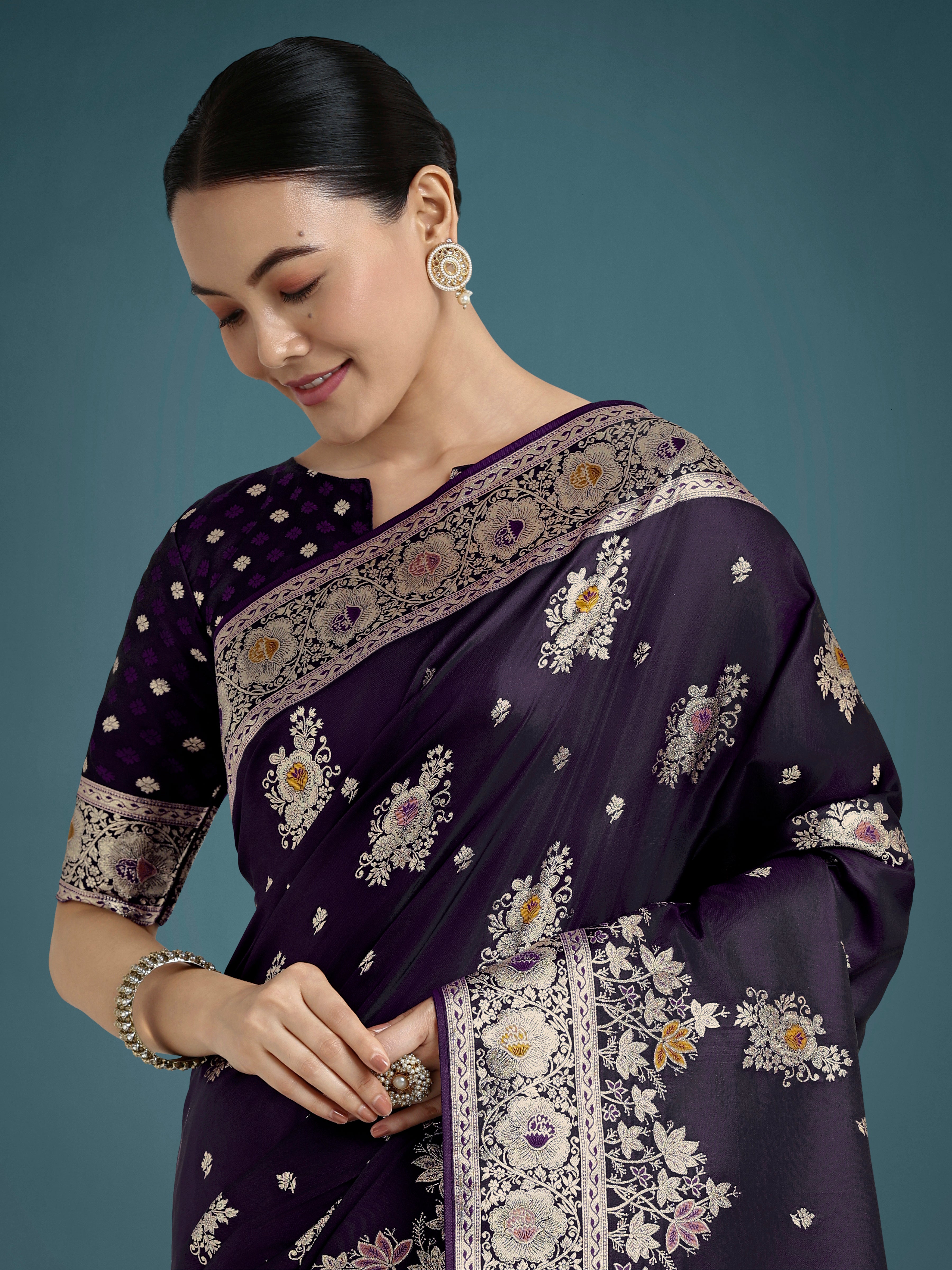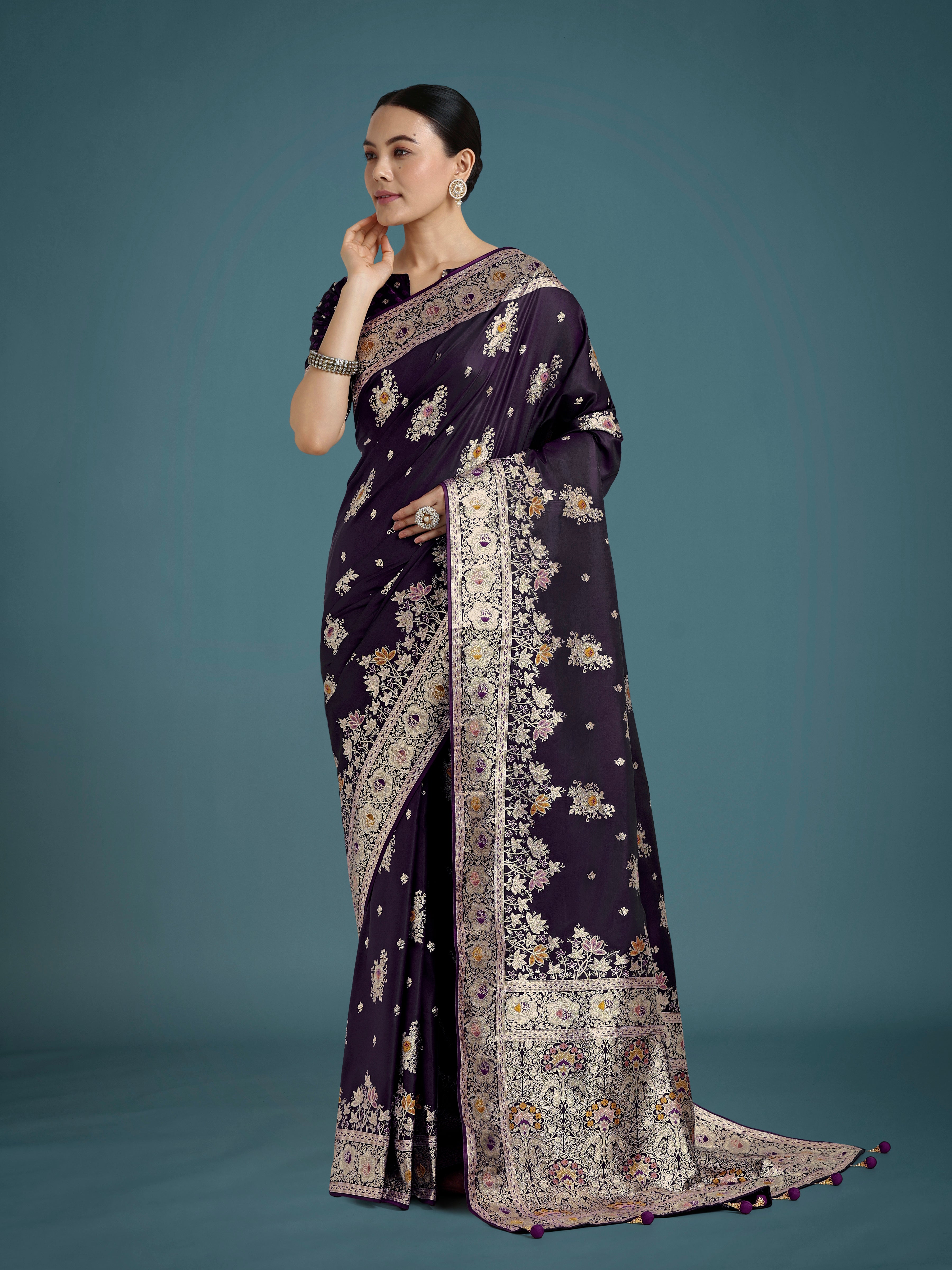 Elegant Dark Purple Banarasi satin silk Saree with Intricate Zari Border: Embrace timeless elegance with our exquisite Banarasi silk saree. Handwoven by skilled artisans, this saree features a stunning zari border that adds a touch of luxury to any occasion. Made from the finest quality silk, it drapes beautifully and exudes grace with every step you take.