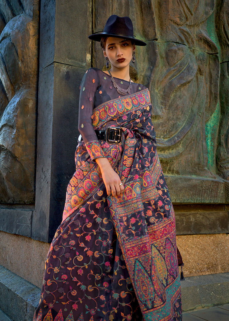 Monjolika Fashion presents drape yourself in centuries of tradition with this Kashmiri Silk Zari Weaving Saree. Crafted from silk and adorned with elaborate zari motifs and pashmina work, it exudes the timeless charm of India's regal heritage.