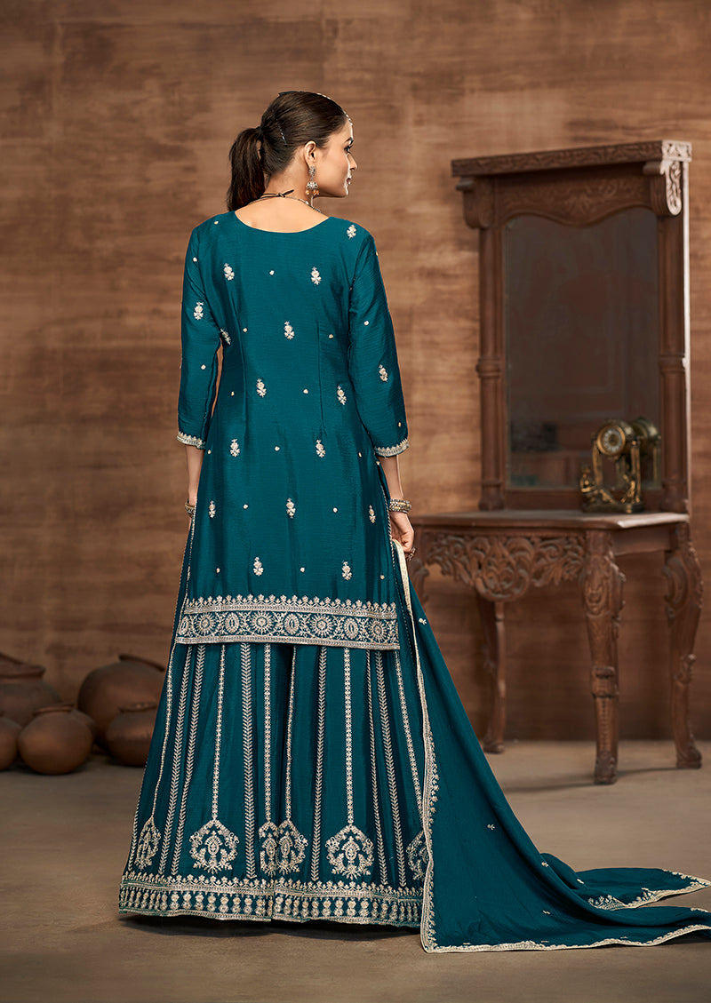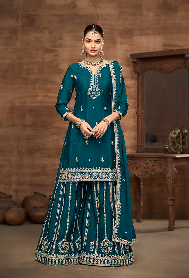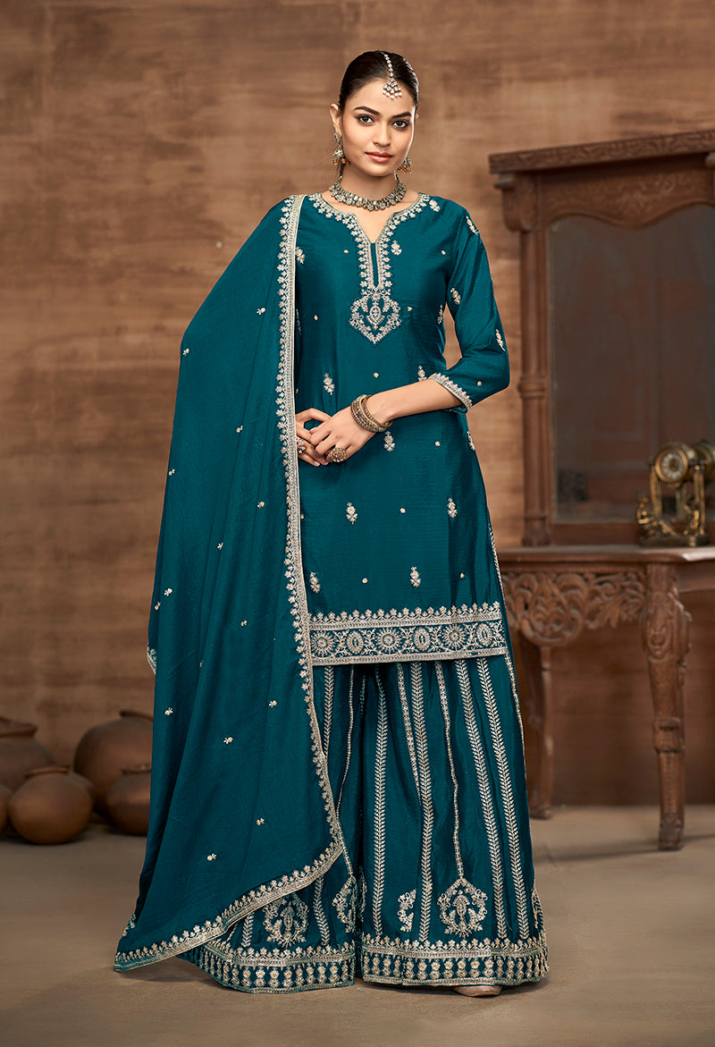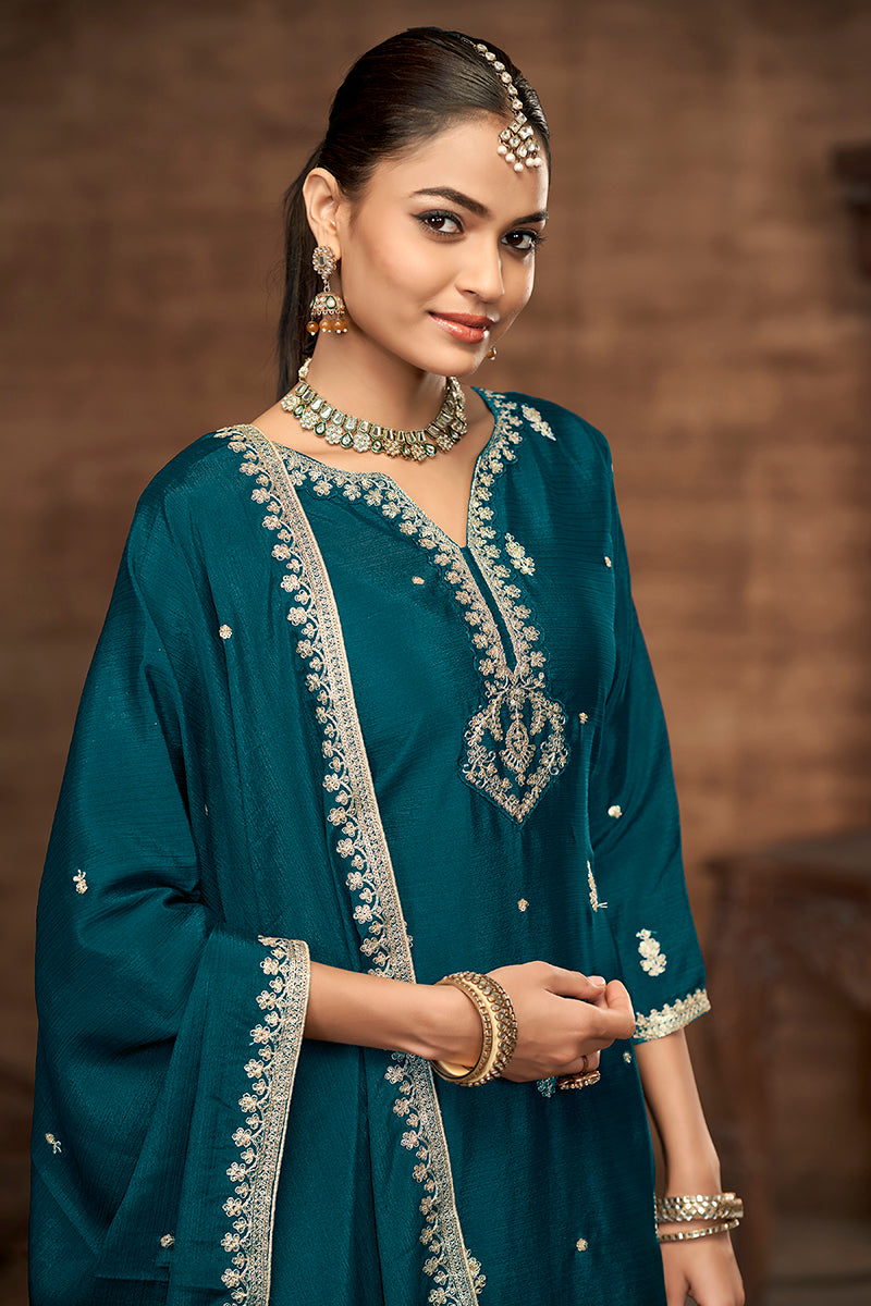 Include your self in a glamour of a season with this dark teal chinon trendy salwar kameez. This beautiful attire is showing some amazing embroidery done with embroidered work. Comes with matching bottom and dupatta.