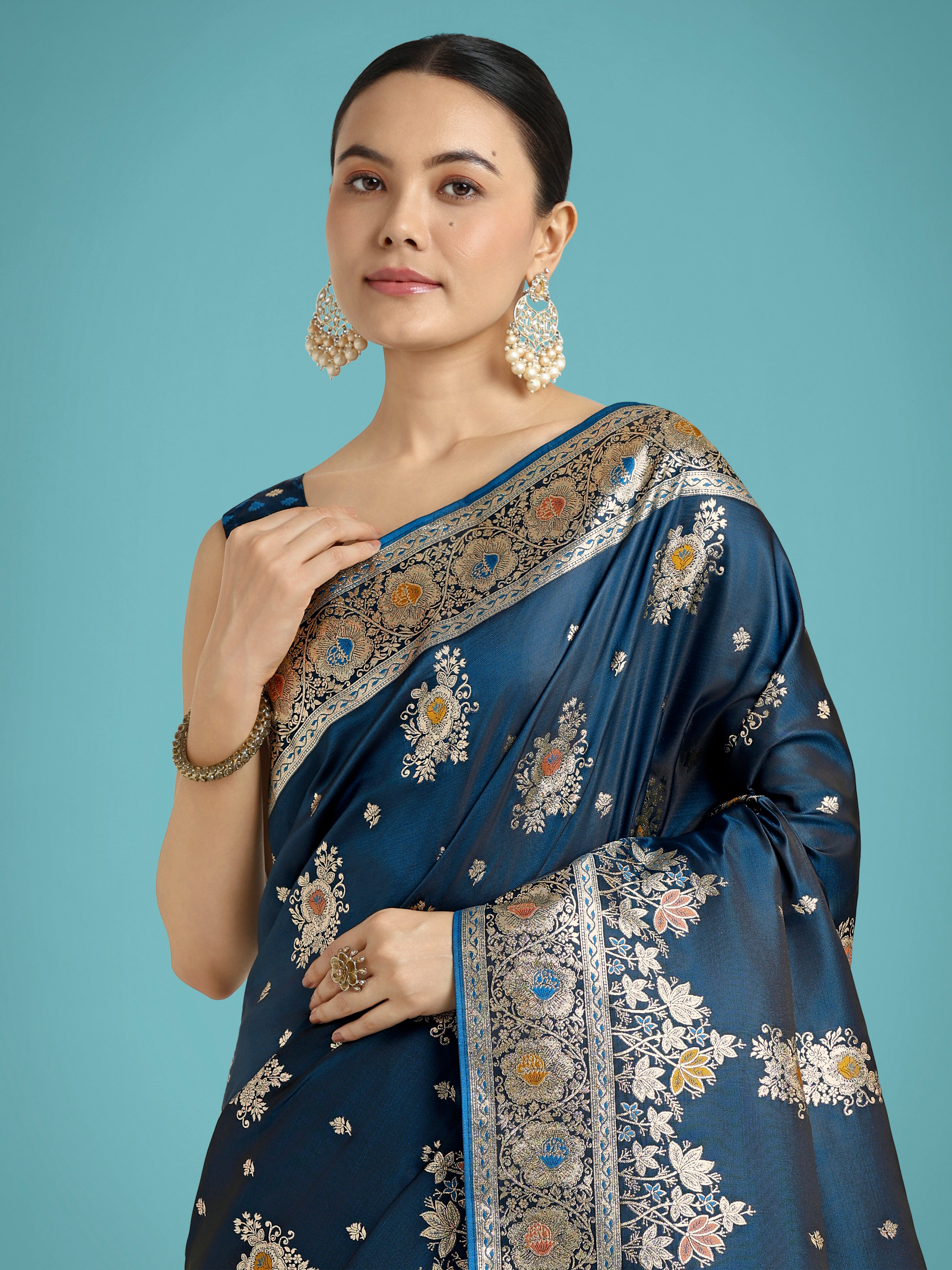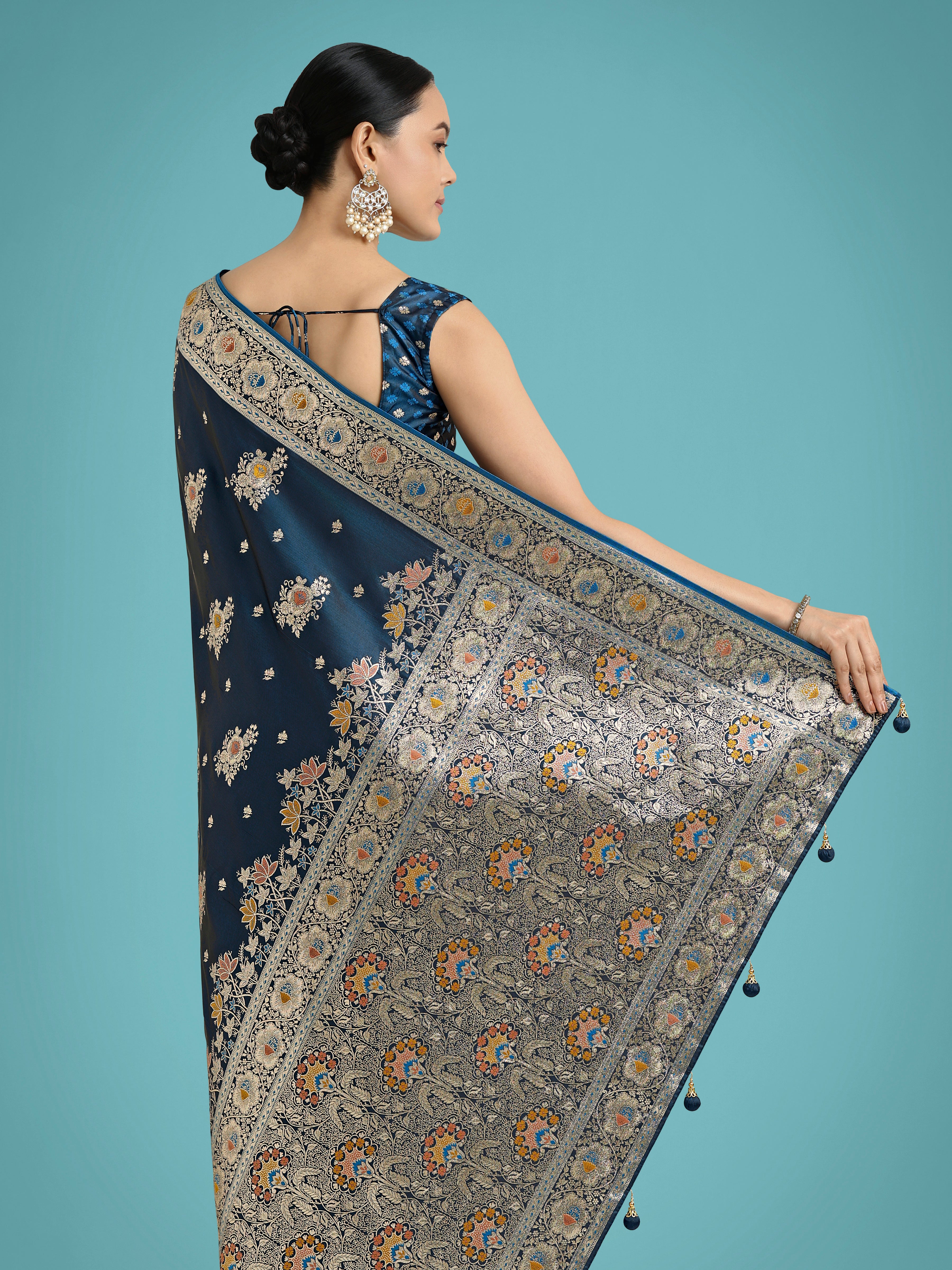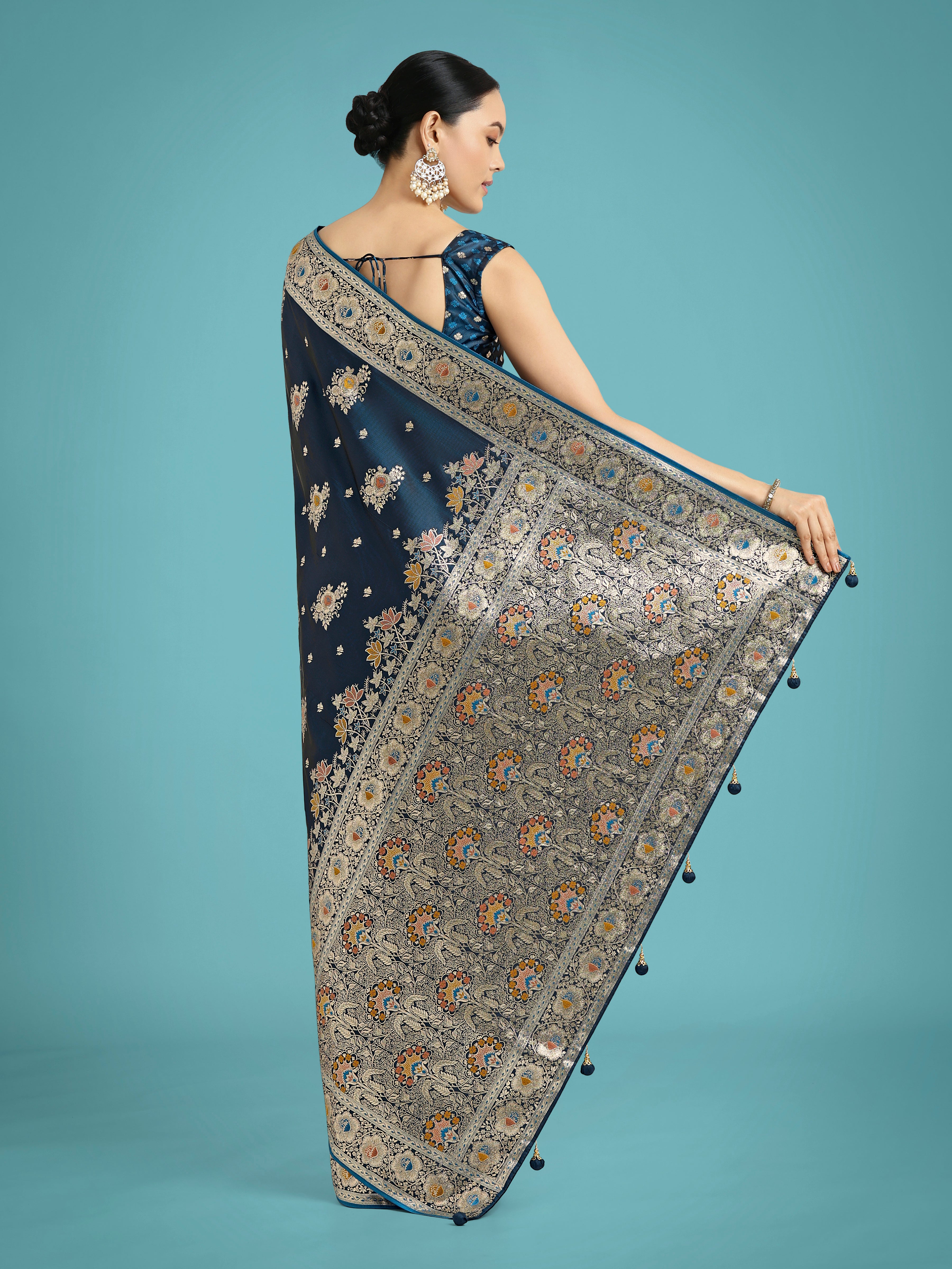 Elegant Dark Teal Banarasi satin silk Saree with Intricate Zari Border: Embrace timeless elegance with our exquisite Banarasi silk saree. Handwoven by skilled artisans, this saree features a stunning zari border that adds a touch of luxury to any occasion. Made from the finest quality silk, it drapes beautifully and exudes grace with every step you take.