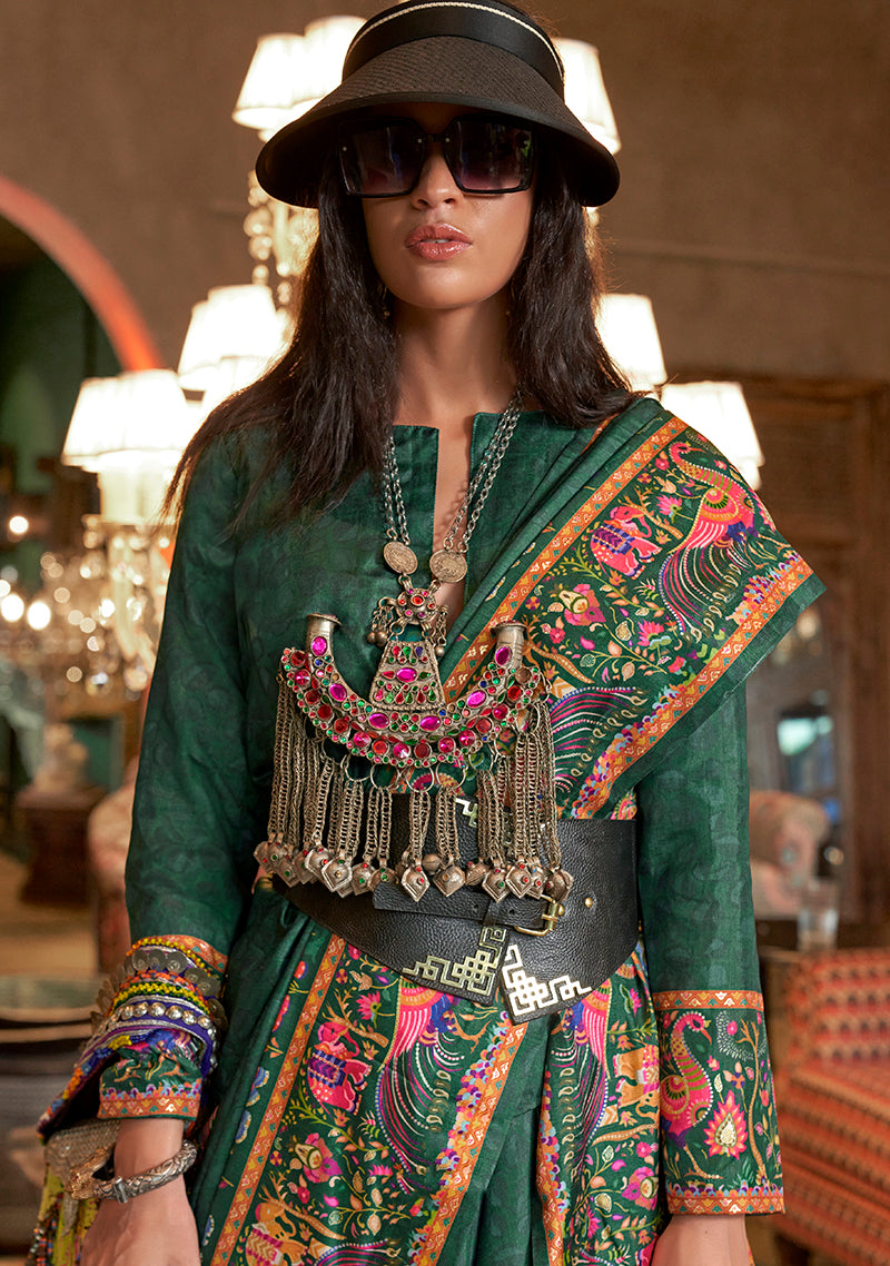 Grab the second look in this elegant attire for this season. True elegance can come out from your dressing style with this Dark Teal silk traditional saree. Look ravishing clad in such a dress that's enhanced print and glory finish work. Comes with matching blouse. (Slight variation in color, fabric & work is possible. Model images are only representative.)