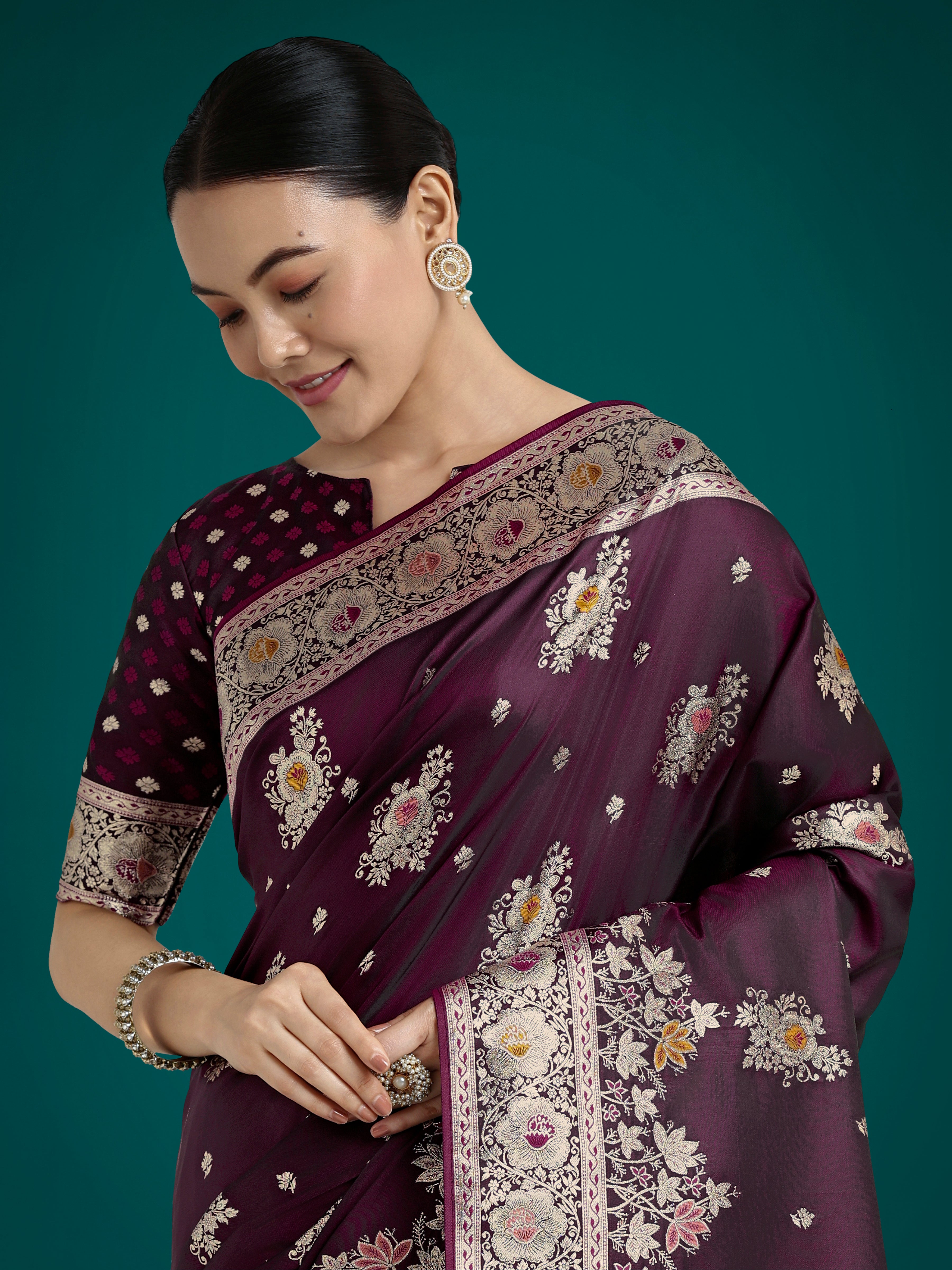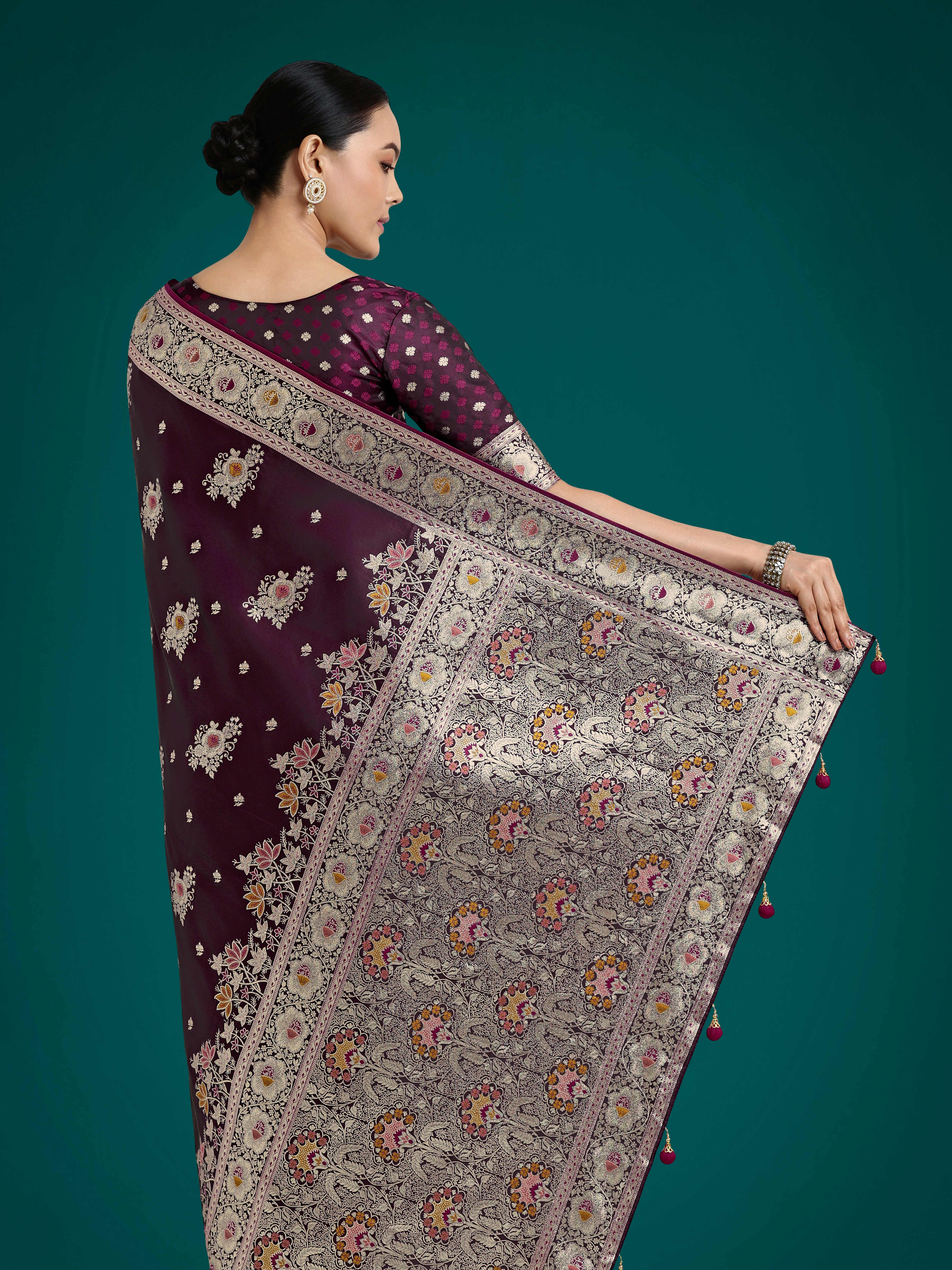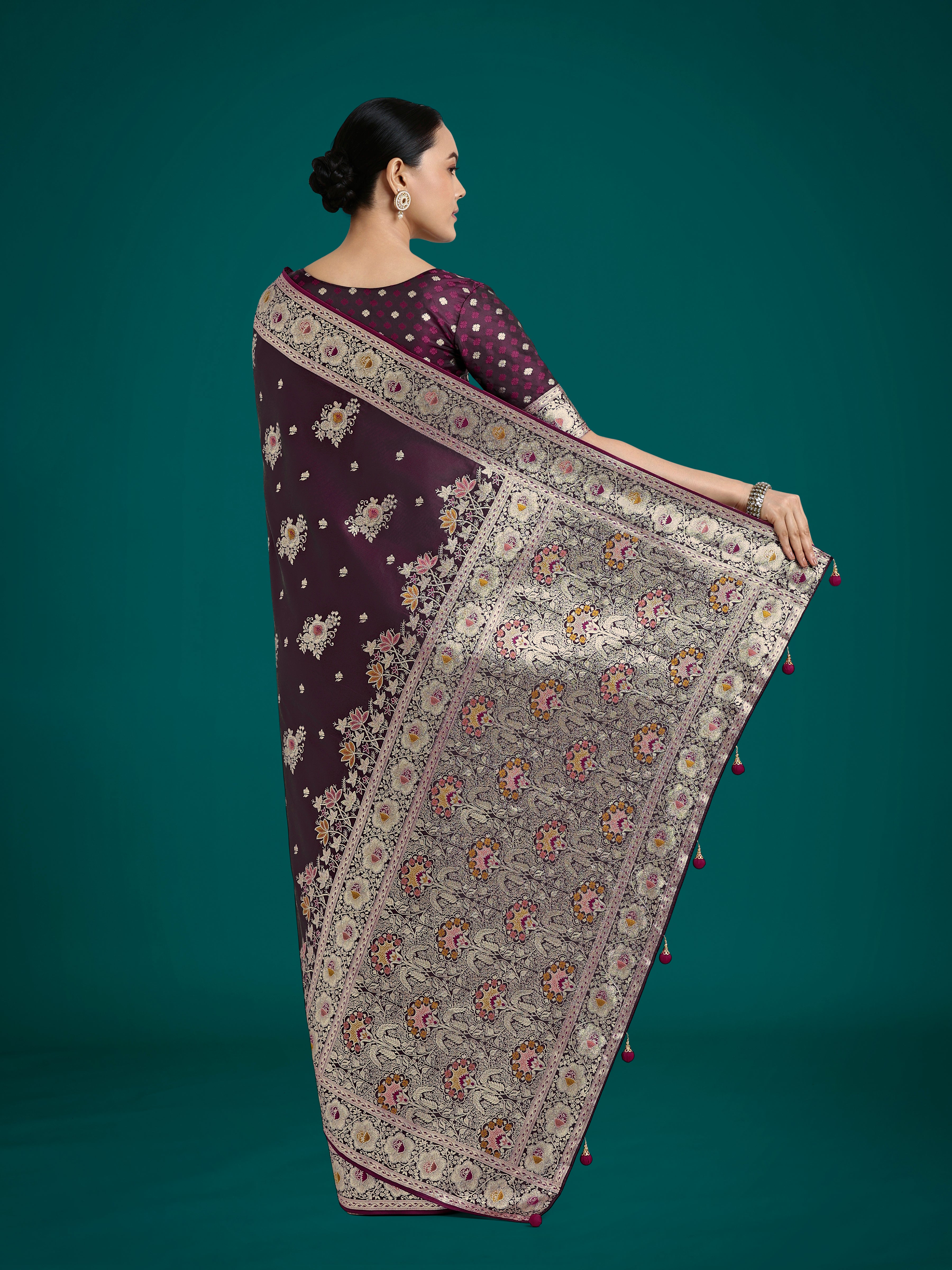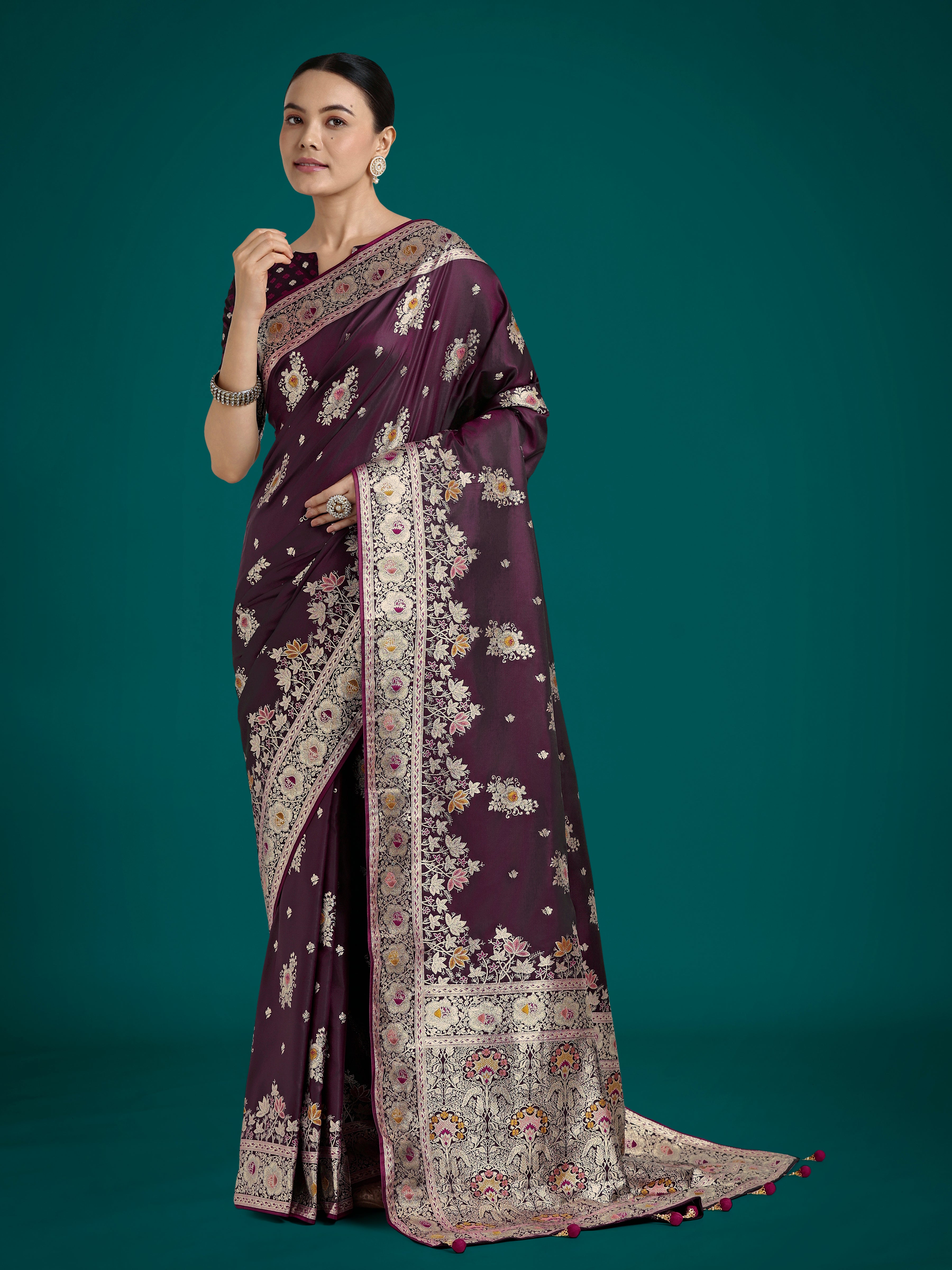 Elegant Dark Wine Banarasi satin silk Saree with Intricate Zari Border: Embrace timeless elegance with our exquisite Banarasi silk saree. Handwoven by skilled artisans, this saree features a stunning zari border that adds a touch of luxury to any occasion. Made from the finest quality silk, it drapes beautifully and exudes grace with every step you take.