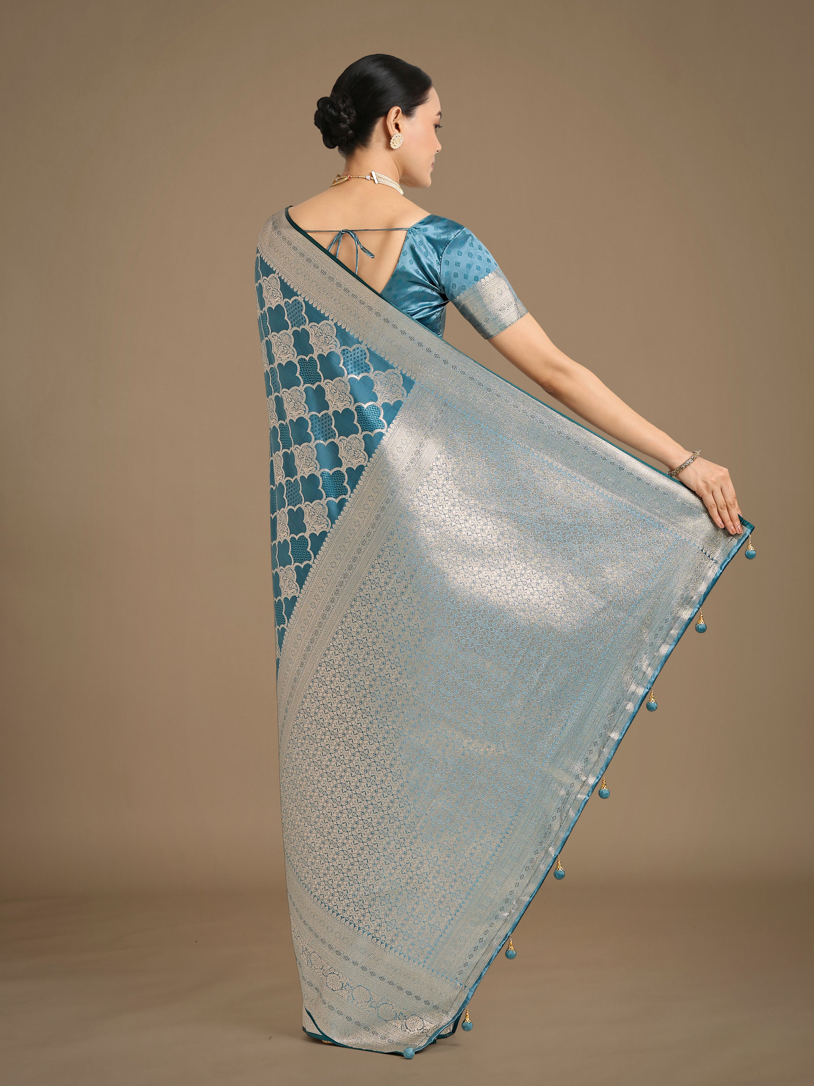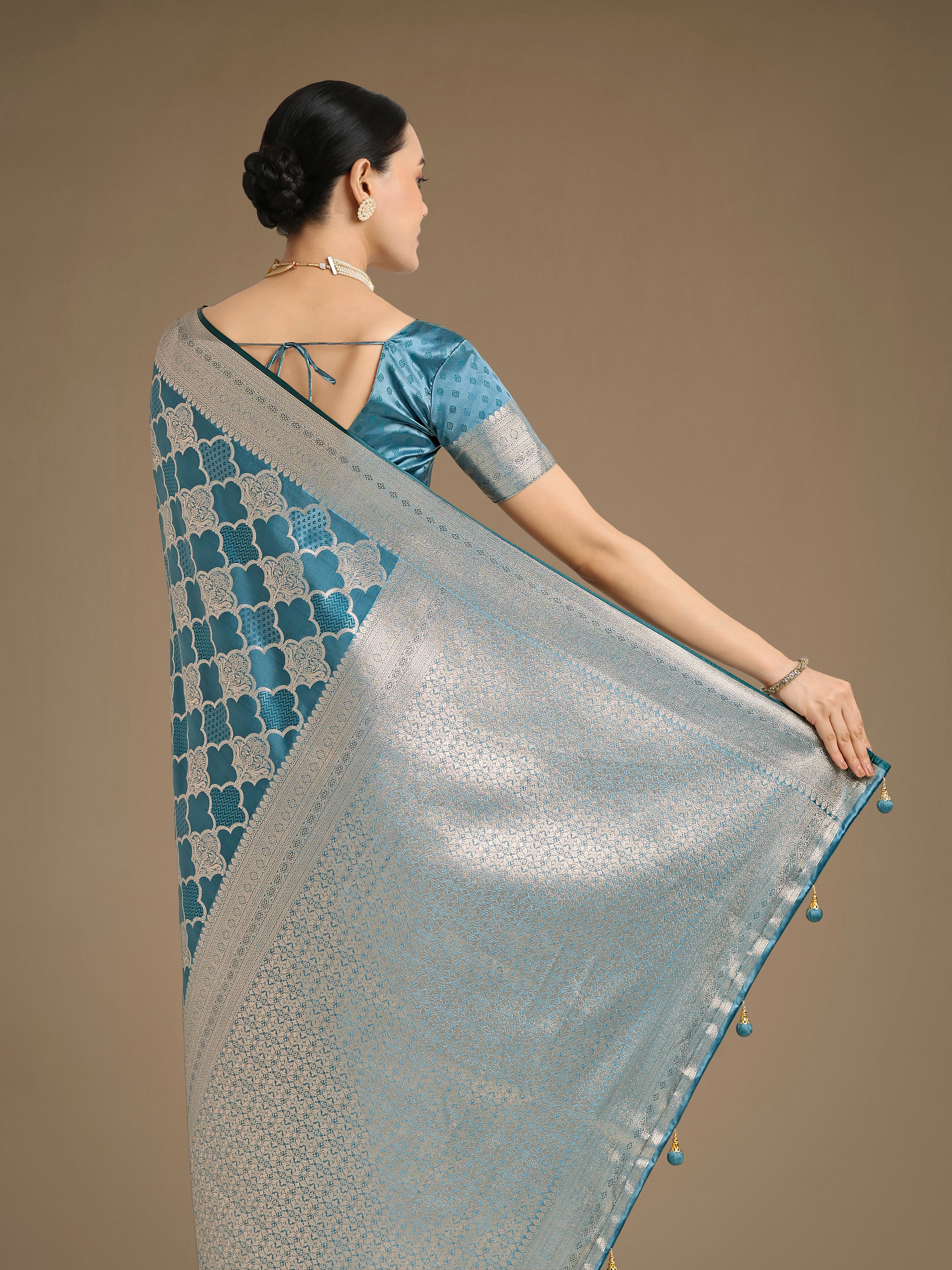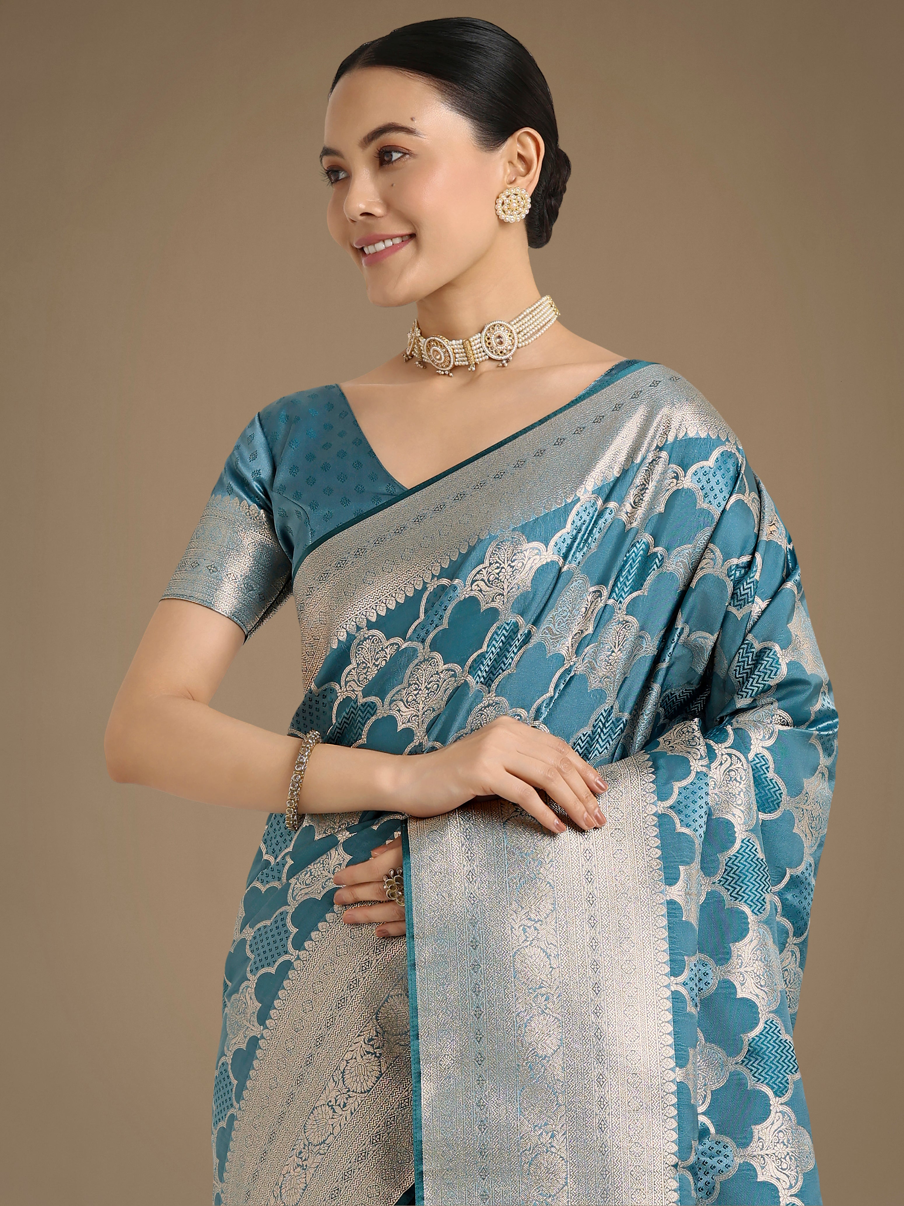 Famous designers tend to give reign to their imagination and create clothes that look interesting and guided by the desire to attract attention. Be the dazzling diva clad in this Cyan blue banarasi silk trendy saree with exquisite designs and patterns. The lovely border, and zari Woven work throughout the attire is awe inspiring. Comes with matching blouse.