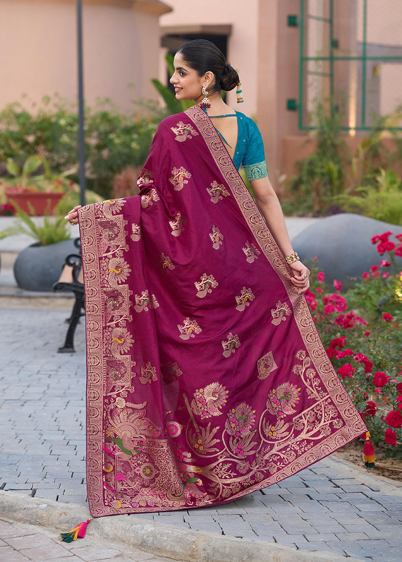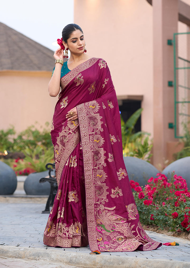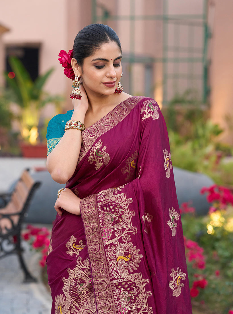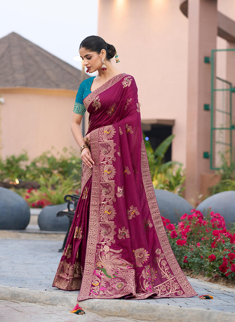Famous designers tend to give reign to their imagination and create clothes that look interesting and guided by the desire to attract attention. Be ready to slip in the comfort zone of Dark Magenta Dola silk contemporary saree. This attire is showing some really mesmerizing and innovative patterns Meenakari weaving with border and weaving work. Comes with matching blouse.