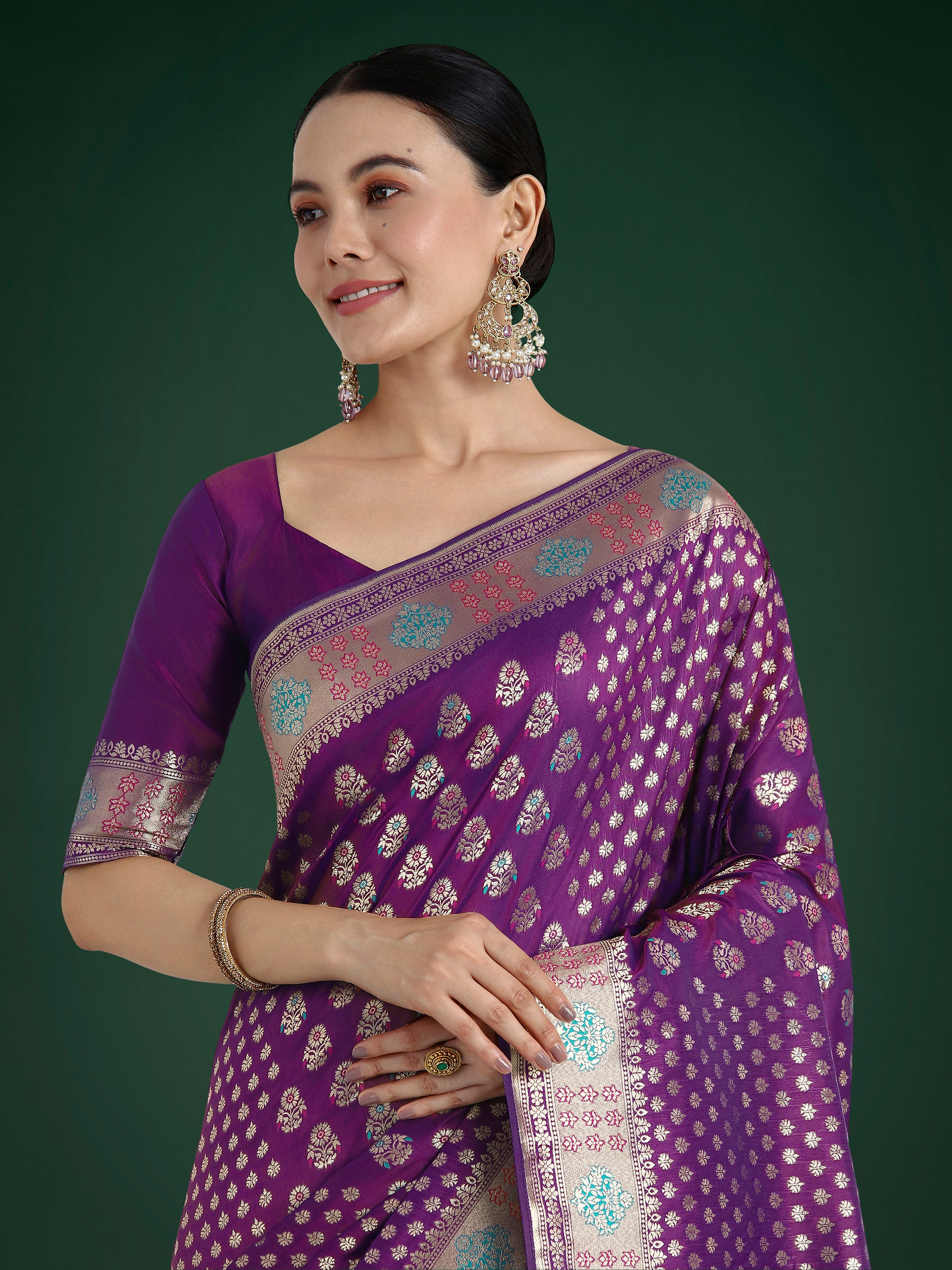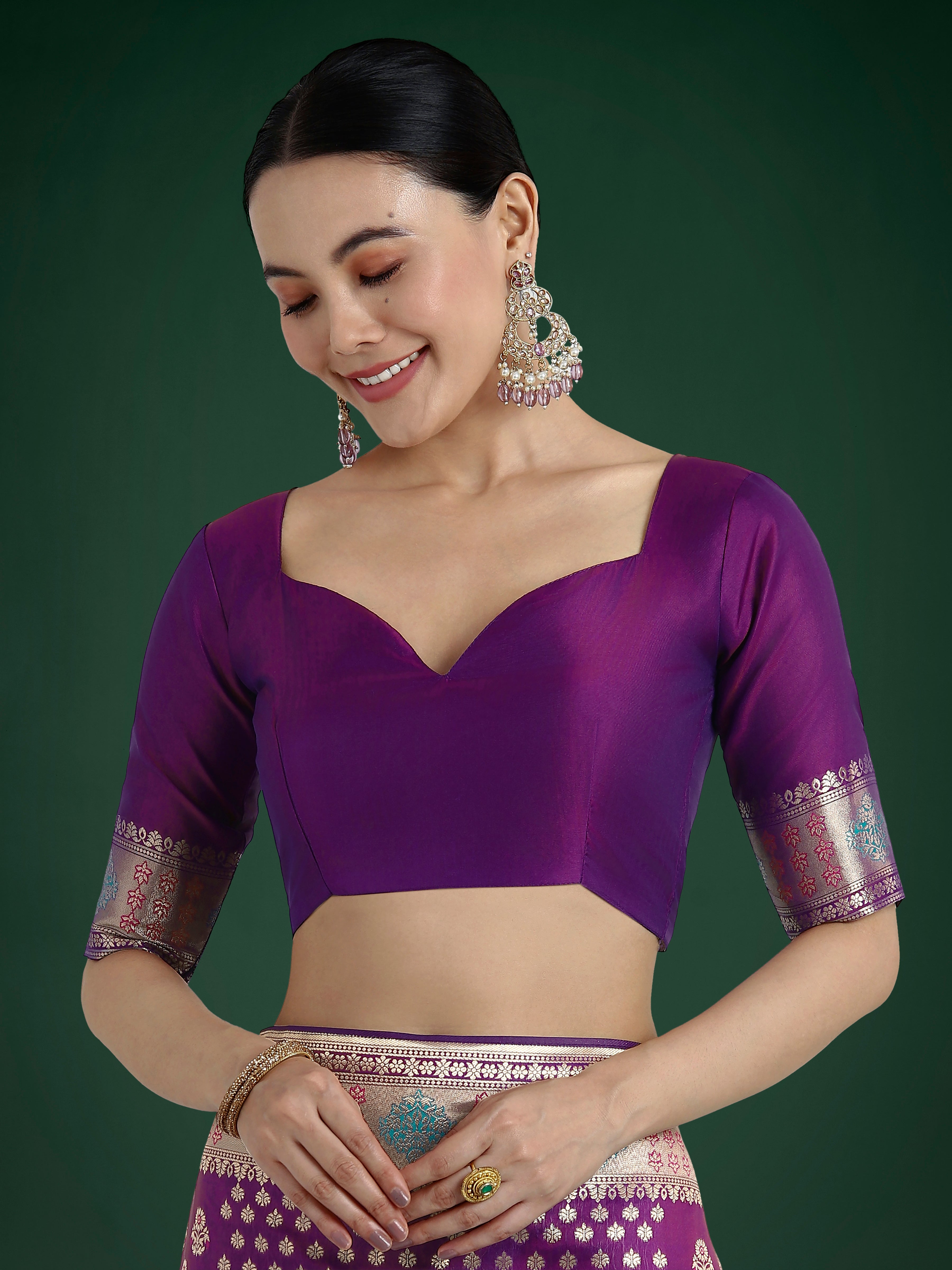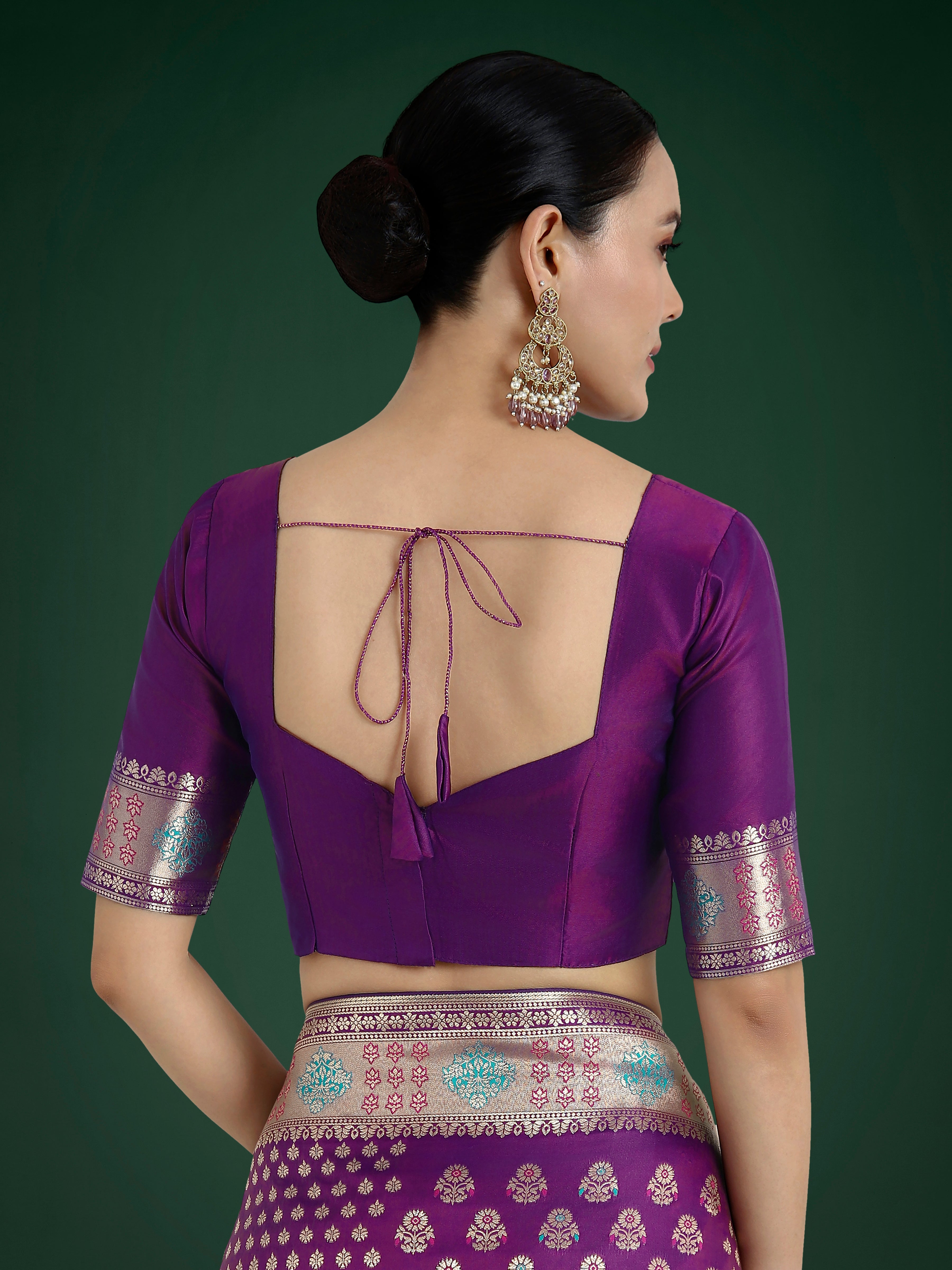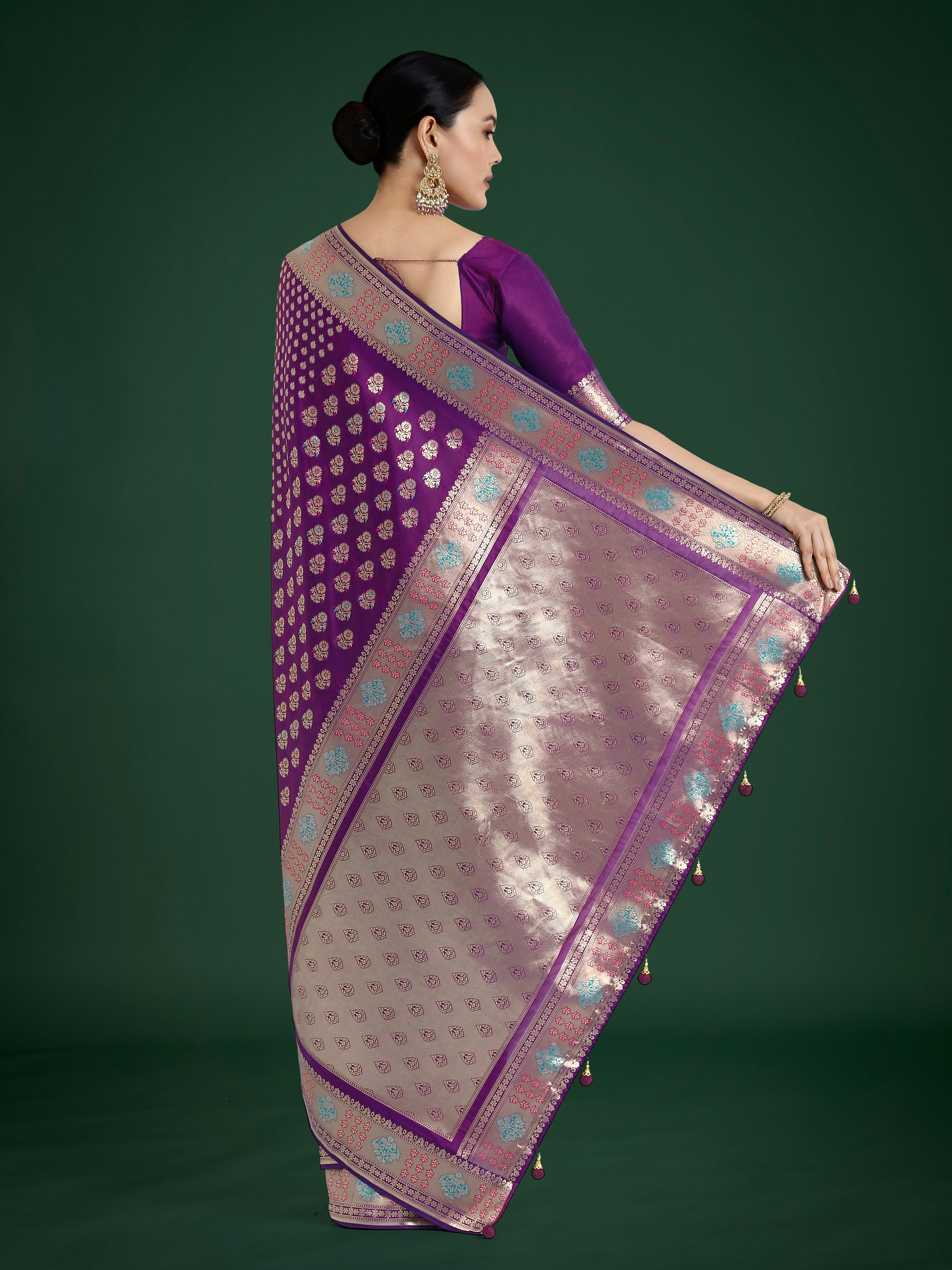 This Purple Banarasi silk classic saree is adding the pretty glamorous showing the feel of cute and graceful. The desirable woven work through the dress is awe inspiring. Comes with matching blouse. (Slight variation in color, fabric & work is possible. Model images are only representative.)