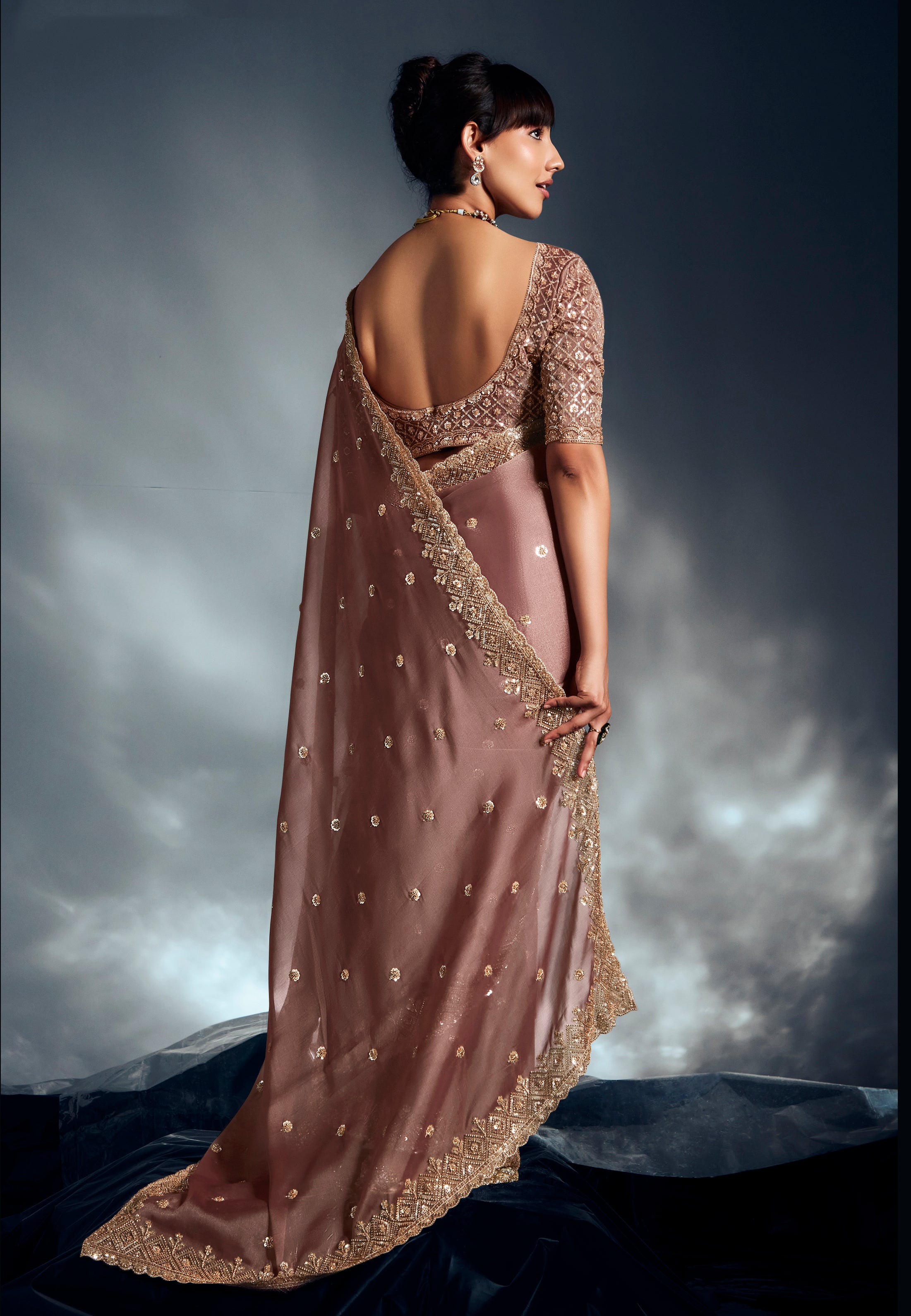 Step into elegance with our Dusty Pink Tissue Organza Saree, beautifully crafted with intricate moti, cutdana, sequins, and khatli handwork that adds a luxurious shimmer to every drape. Designed for women who want to make a statement, this saree blends sheer sophistication with contemporary style. Its lightweight organza fabric flows gracefully, making it the perfect choice for party wear, cocktail evenings, and festive celebrations. The detailed border work enhances its regal charm, ensuring all eyes stay on you. Comes with unstiched blouse.