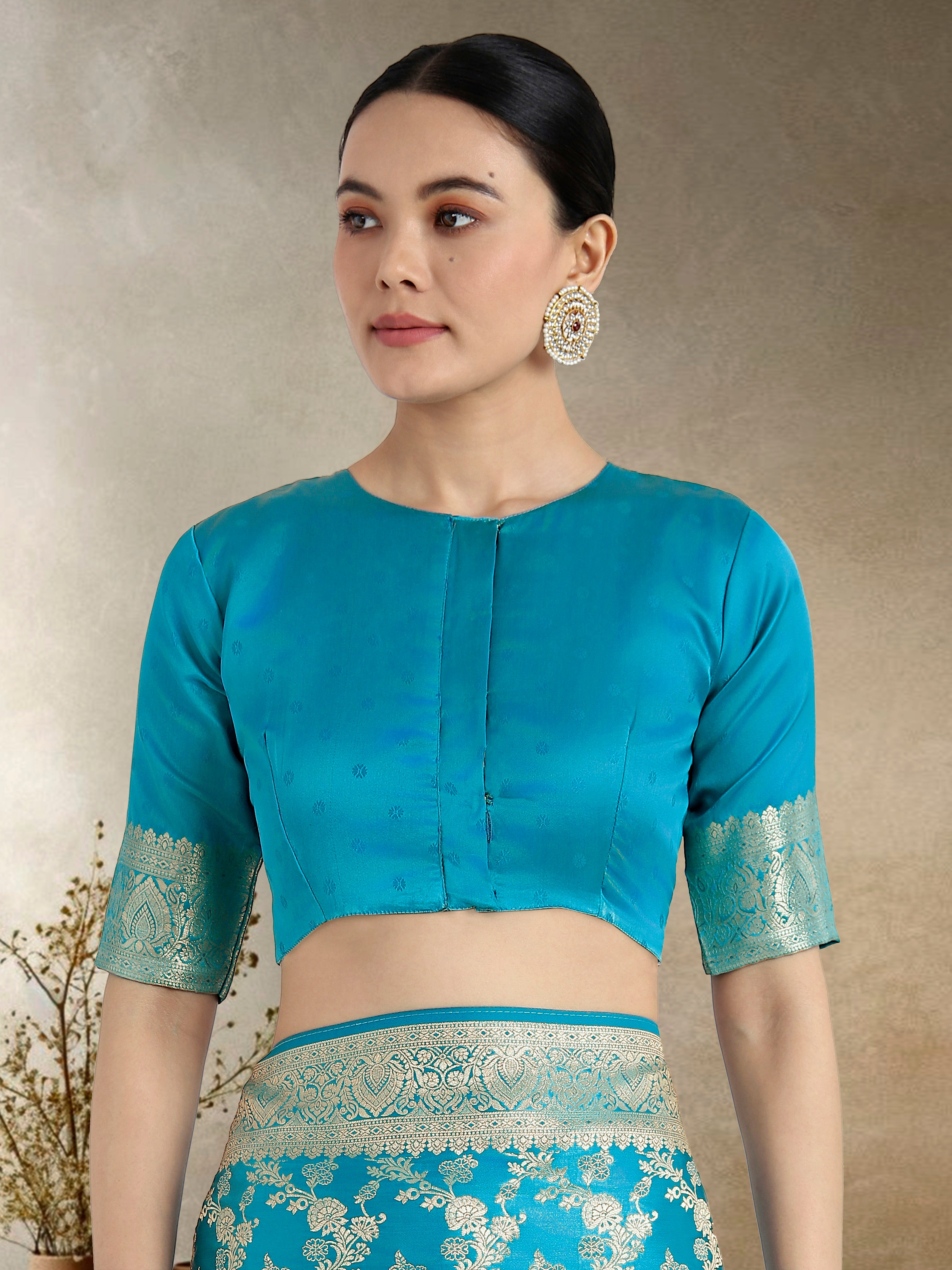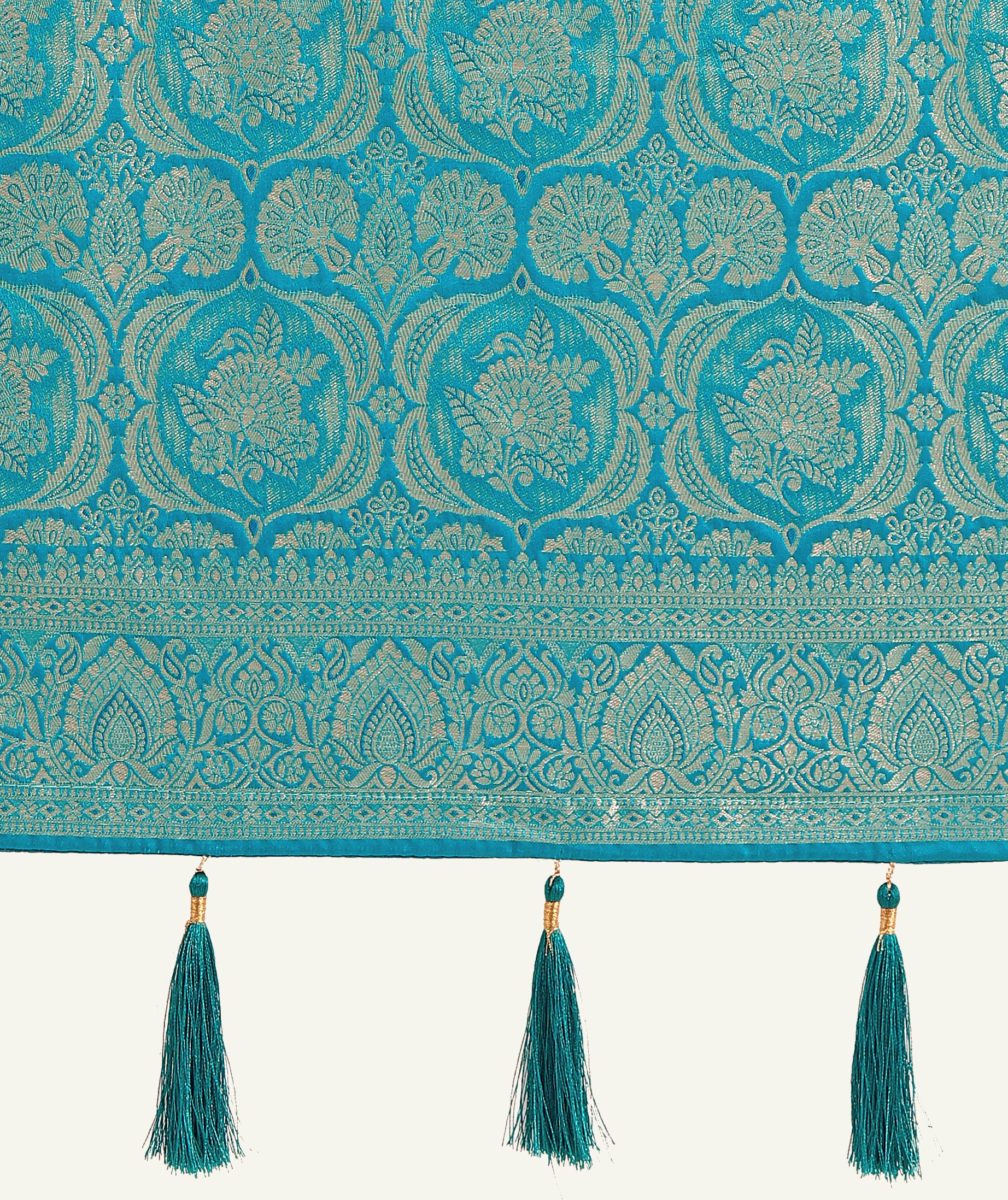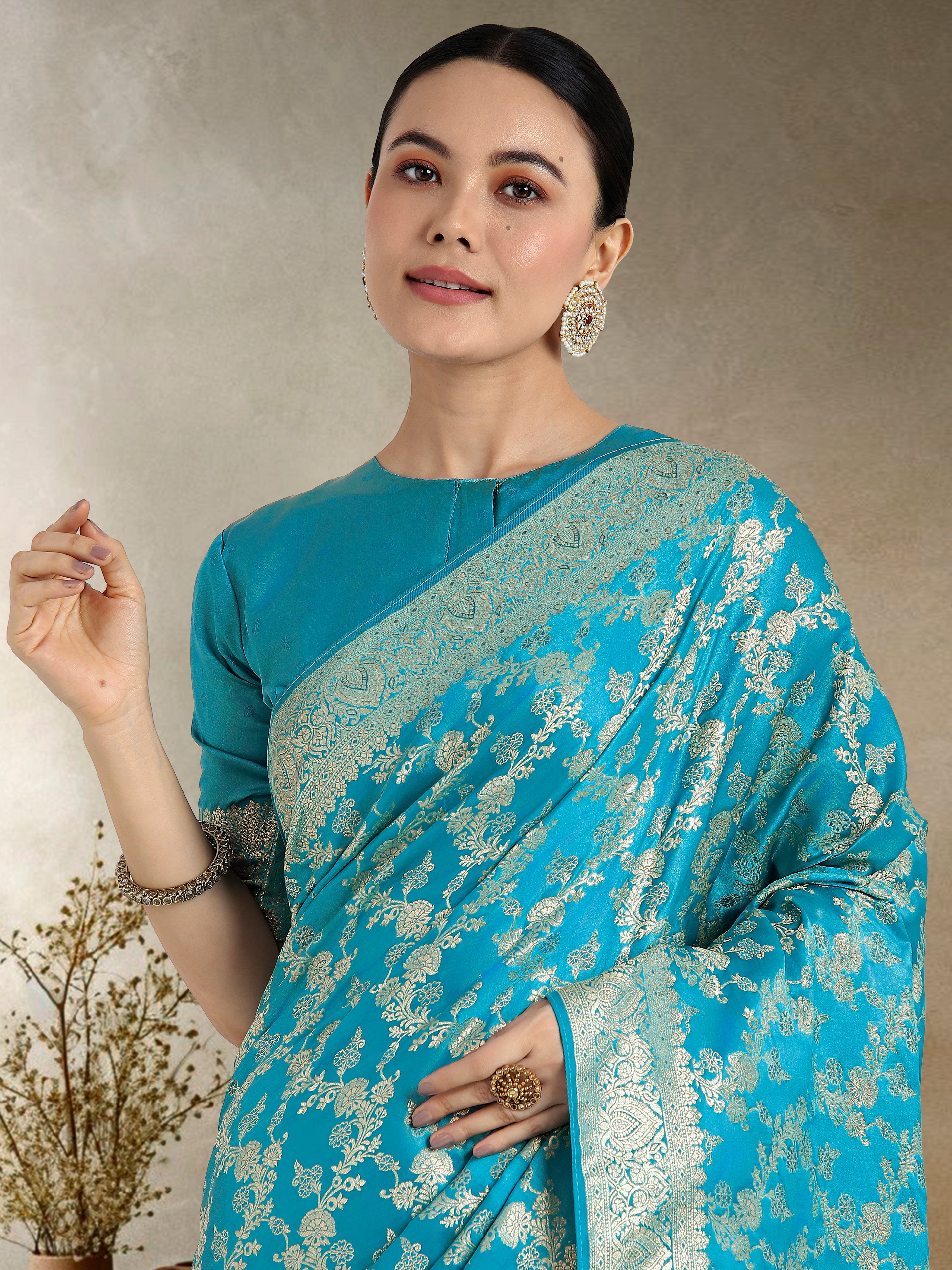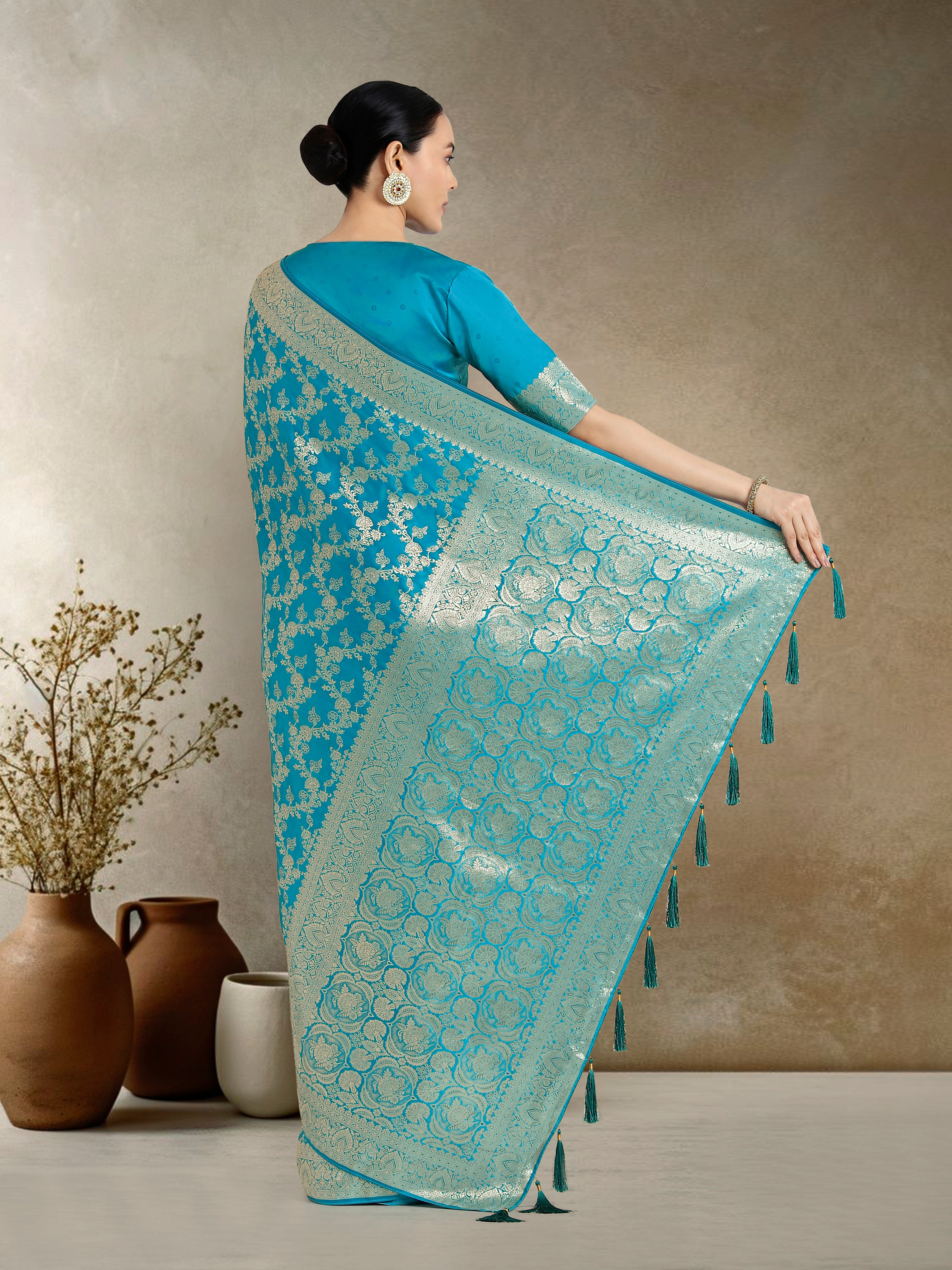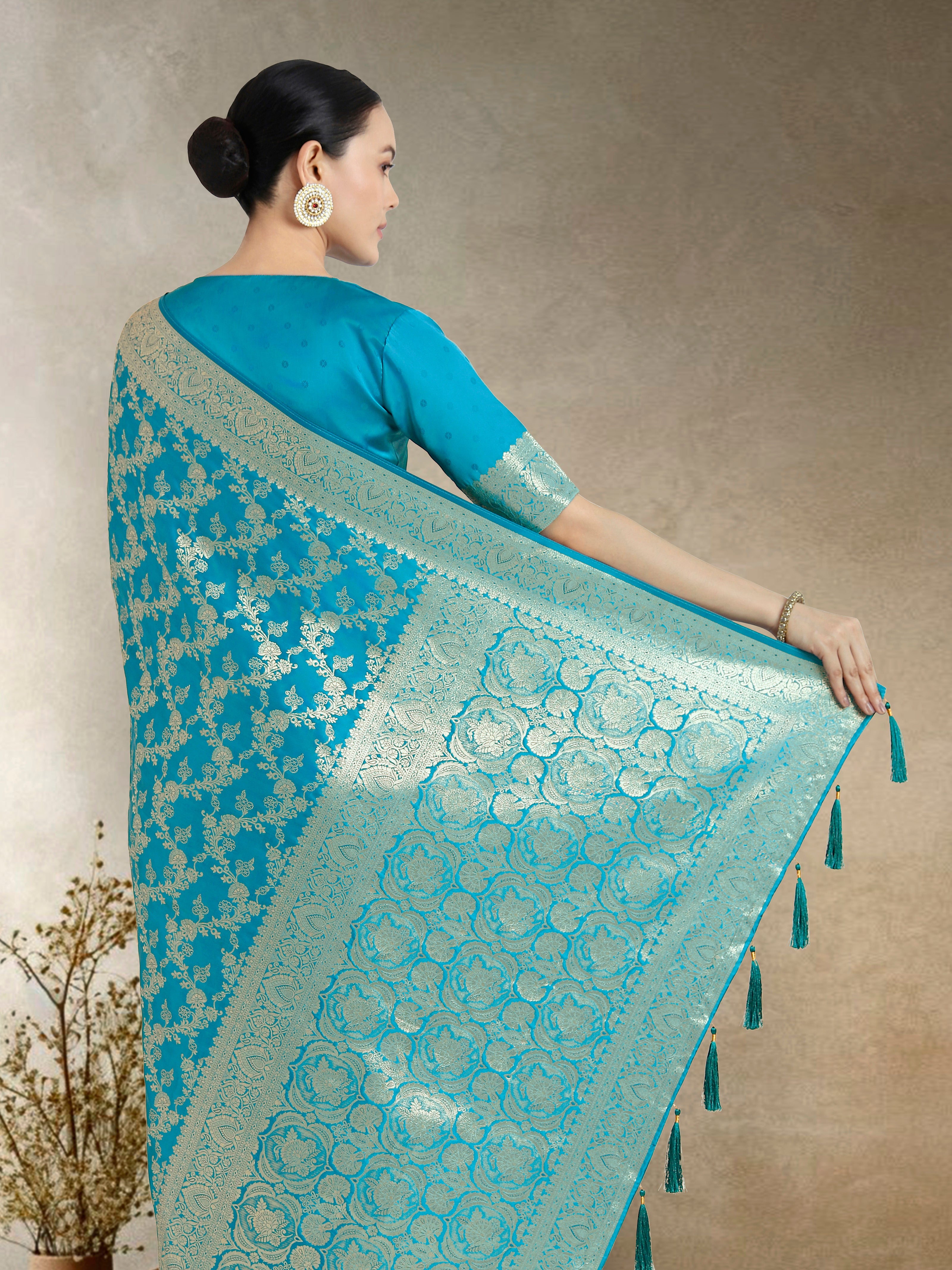 You are bound to make a strong fashion statement with this Aqua blue Banarasi satin silk classic saree. Beautified with weaving work all synchronized effectively with all the zaal pattern weaving work and design of the attire. Comes with matching blouse. (Slight variation in color, fabric & work is possible. Model images are only representative.)